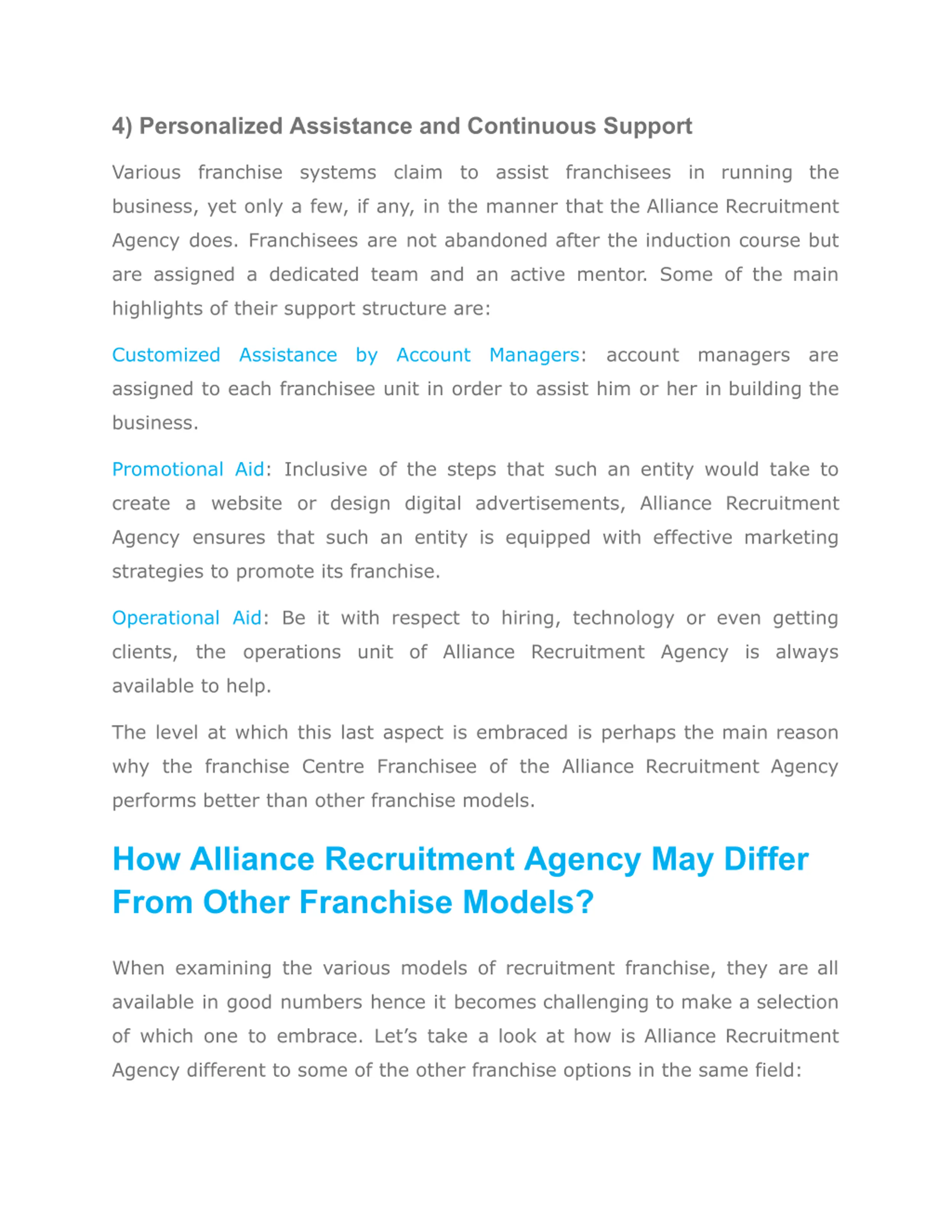4) Personalized Assistance and Continuous Support Various franchise systems claim to assist franchisees in running the business, yet only a few, if any, in the manner that the Alliance Recruitment Agency does. Franchisees are not abandoned after the induction course but are assigned a dedicated team and an active mentor. Some of the main highlights of their support structure are: Customized Assistance by Account Managers: account managers are assigned to each franchisee unit in order to assist him or her in building the business. Promotional Aid: Inclusive of the steps that such an entity would take to create a website or design digital advertisements, Alliance Recruitment Agency ensures that such an entity is equipped with effective marketing strategies to promote its franchise. Operational Aid: Be it with respect to hiring, technology or even getting clients, the operations unit of Alliance Recruitment Agency is always available to help. The level at which this last aspect is embraced is perhaps the main reason why the franchise Centre Franchisee of the Alliance Recruitment Agency performs better than other franchise models. How Alliance Recruitment Agency May Differ From Other Franchise Models? When examining the various models of recruitment franchise, they are all available in good numbers hence it becomes challenging to make a selection of which one to embrace. Let s take a look at how is Alliance Recruitment Agency different to some of the other franchise options in the same field: