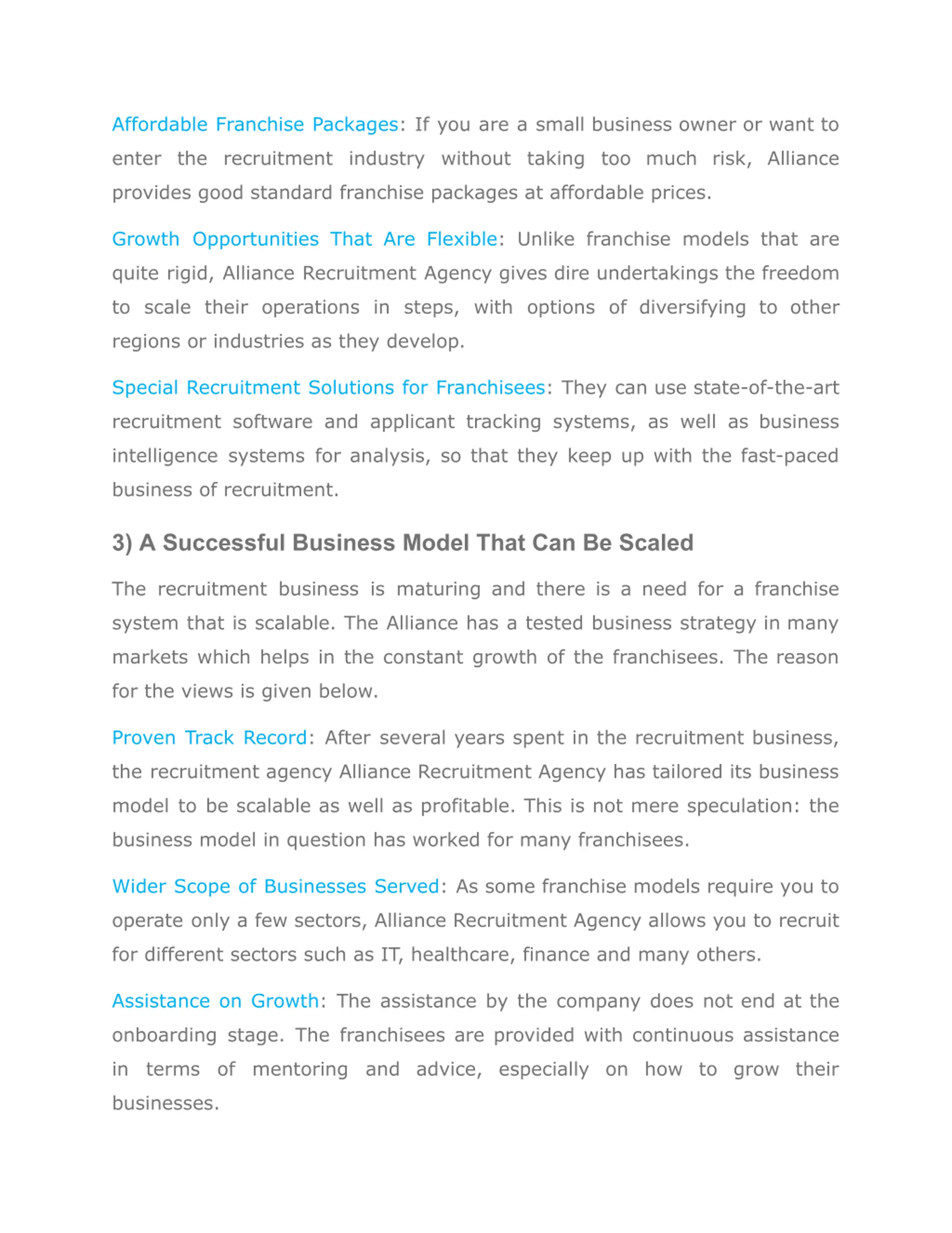 Affordable Franchise Packages: If you are a small business owner or want to enter the recruitment industry without taking too much risk, Alliance provides good standard franchise packages at affordable prices. Growth Opportunities That Are Flexible: Unlike franchise models that are quite rigid, Alliance Recruitment Agency gives dire undertakings the freedom to scale their operations in steps, with options of diversifying to other regions or industries as they develop. Special Recruitment Solutions for Franchisees: They can use state-of-the-art recruitment software and applicant tracking systems, as well as business intelligence systems for analysis, so that they keep up with the fast-paced business of recruitment. 3) A Successful Business Model That Can Be Scaled The recruitment business is maturing and there is a need for a franchise system that is scalable. The Alliance has a tested business strategy in many markets which helps in the constant growth of the franchisees. The reason for the views is given below. Proven Track Record: After several years spent in the recruitment business, the recruitment agency Alliance Recruitment Agency has tailored its business model to be scalable as well as profitable. This is not mere speculation: the business model in question has worked for many franchisees. Wider Scope of Businesses Served: As some franchise models require you to operate only a few sectors, Alliance Recruitment Agency allows you to recruit for different sectors such as IT, healthcare, finance and many others. Assistance on Growth: The assistance by the company does not end at the onboarding stage. The franchisees are provided with continuous assistance in terms of mentoring and advice, especially on how to grow their businesses.