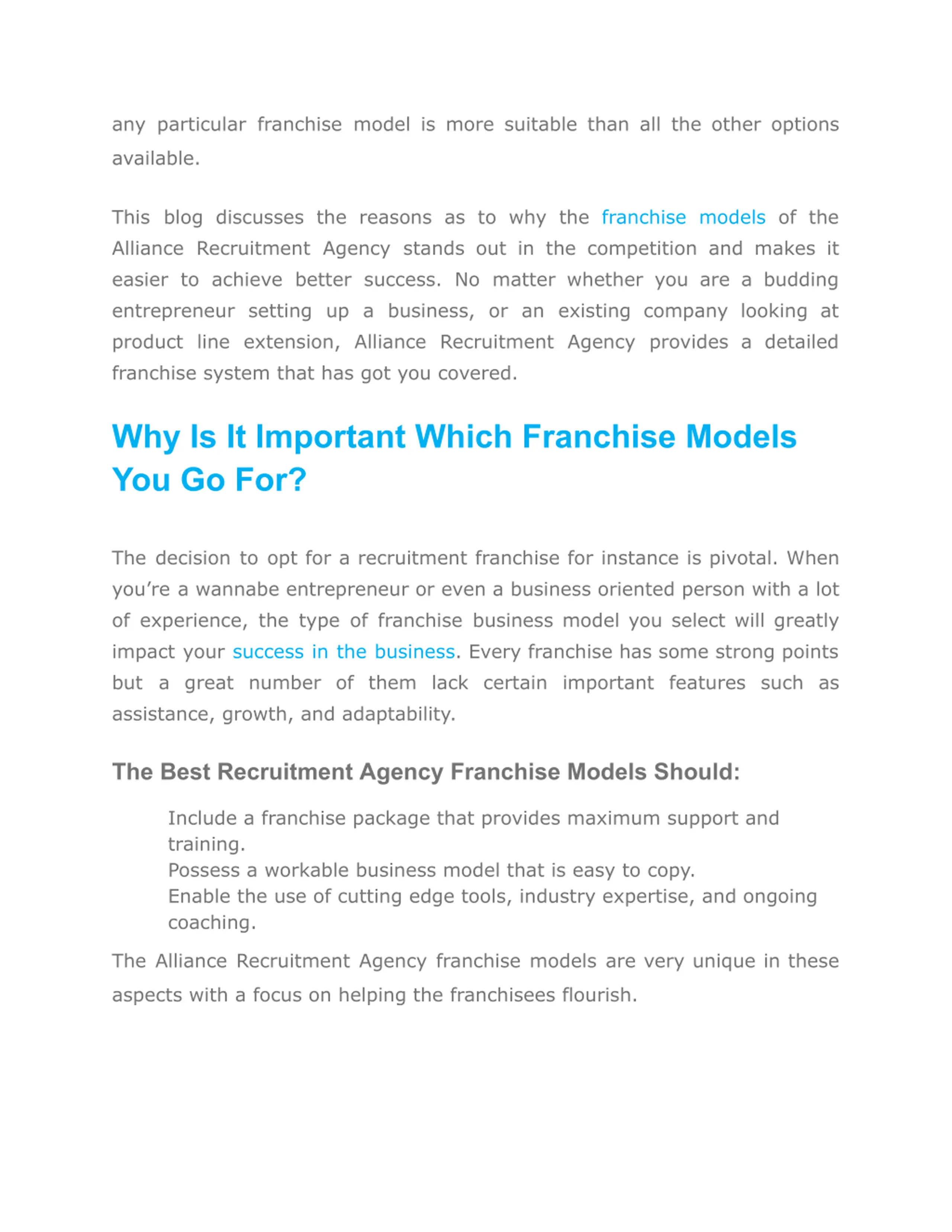any particular franchise model is more suitable than all the other options available. This blog discusses the reasons as to why the franchise models of the Alliance Recruitment Agency stands out in the competition and makes it easier to achieve better success. No matter whether you are a budding entrepreneur setting up a business, or an existing company looking at product line extension, Alliance Recruitment Agency provides a detailed franchise system that has got you covered. Why Is It Important Which Franchise Models You Go For? The decision to opt for a recruitment franchise for instance is pivotal. When you re a wannabe entrepreneur or even a business oriented person with a lot of experience, the type of franchise business model you select will greatly impact your success in the business. Every franchise has some strong points but a great number of them lack certain important features such as assistance, growth, and adaptability. The Best Recruitment Agency Franchise Models Should: Include a franchise package that provides maximum support and training. Possess a workable business model that is easy to copy. Enable the use of cutting edge tools, industry expertise, and ongoing coaching. The Alliance Recruitment Agency franchise models are very unique in these aspects with a focus on helping the franchisees flourish.