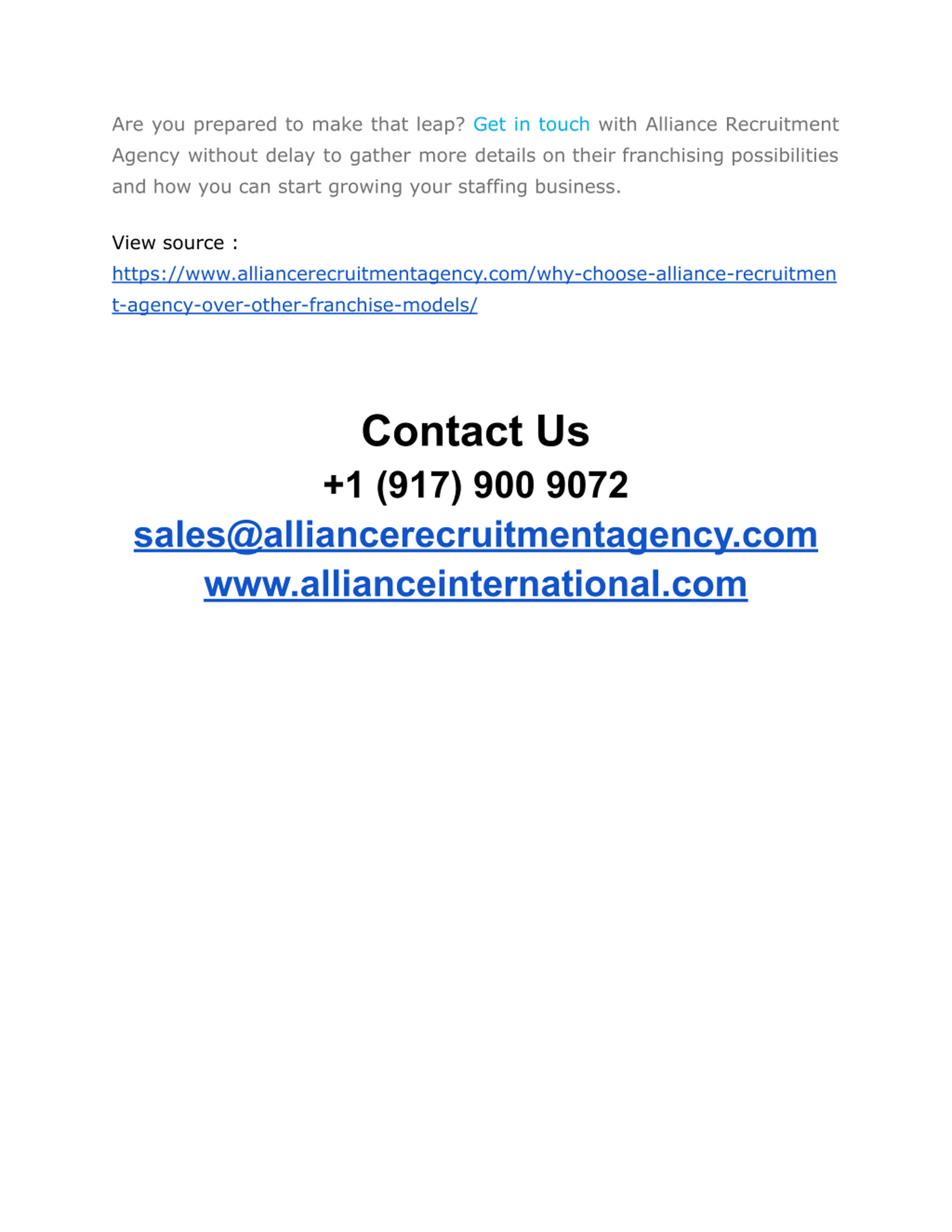 Are you prepared to make that leap? Get in touch with Alliance Recruitment Agency without delay to gather more details on their franchising possibilities and how you can start growing your staffing business. View source : https://www.alliancerecruitmentagency.com/why-choose-alliance-recruitmen t-agency-over-other-franchise-models/ Contact Us +1 (917) 900 9072 sales@alliancerecruitmentagency.com www.allianceinternational.com