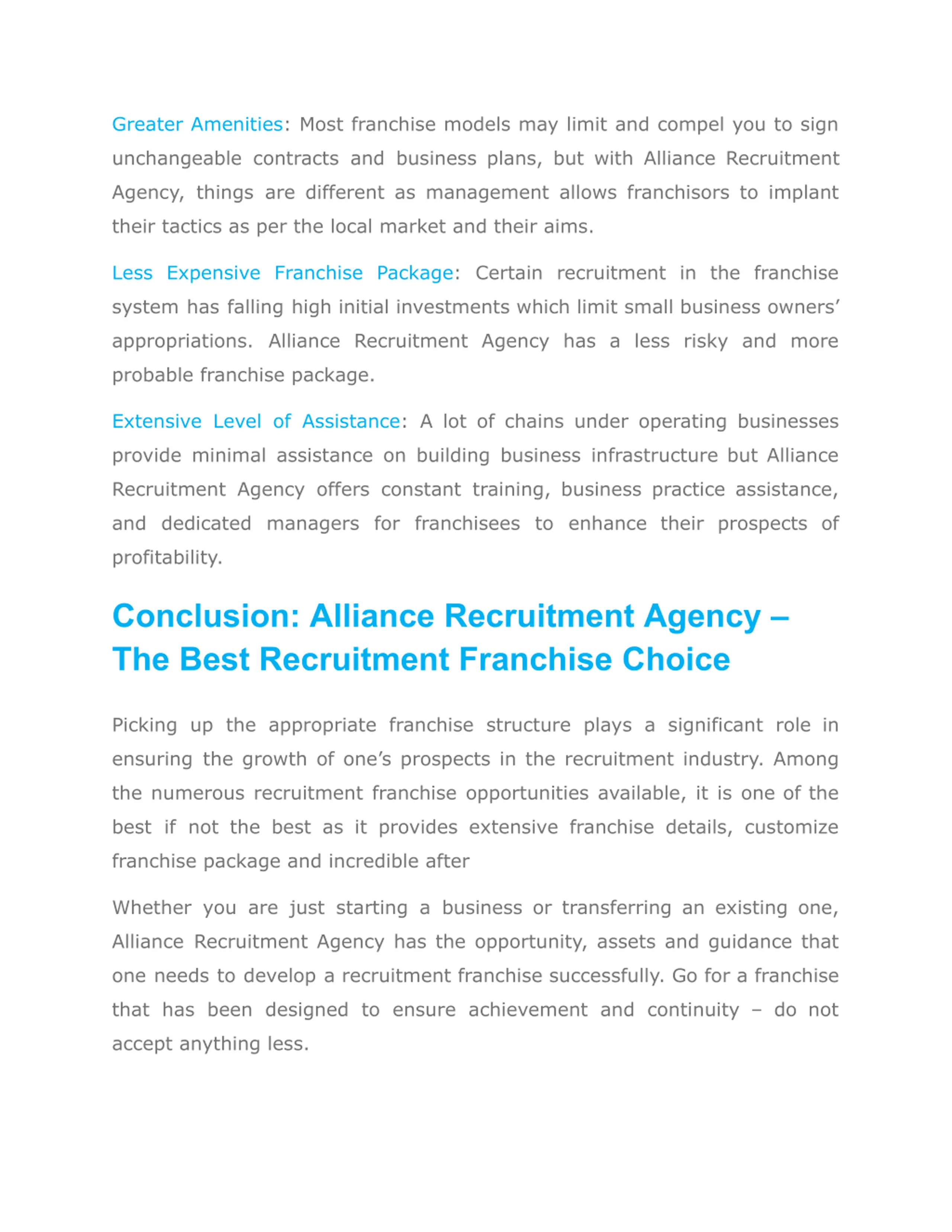 Greater Amenities: Most franchise models may limit and compel you to sign unchangeable contracts and business plans, but with Alliance Recruitment Agency, things are different as management allows franchisors to implant their tactics as per the local market and their aims. Less Expensive Franchise Package: Certain recruitment in the franchise system has falling high initial investments which limit small business owners appropriations. Alliance Recruitment Agency has a less risky and more probable franchise package. Extensive Level of Assistance: A lot of chains under operating businesses provide minimal assistance on building business infrastructure but Alliance Recruitment Agency offers constant training, business practice assistance, and dedicated managers for franchisees to enhance their prospects of profitability. Conclusion: Alliance Recruitment Agency The Best Recruitment Franchise Choice Picking up the appropriate franchise structure plays a significant role in ensuring the growth of one s prospects in the recruitment industry. Among the numerous recruitment franchise opportunities available, it is one of the best if not the best as it provides extensive franchise details, customize franchise package and incredible after Whether you are just starting a business or transferring an existing one, Alliance Recruitment Agency has the opportunity, assets and guidance that one needs to develop a recruitment franchise successfully. Go for a franchise that has been designed to ensure achievement and continuity do not accept anything less.