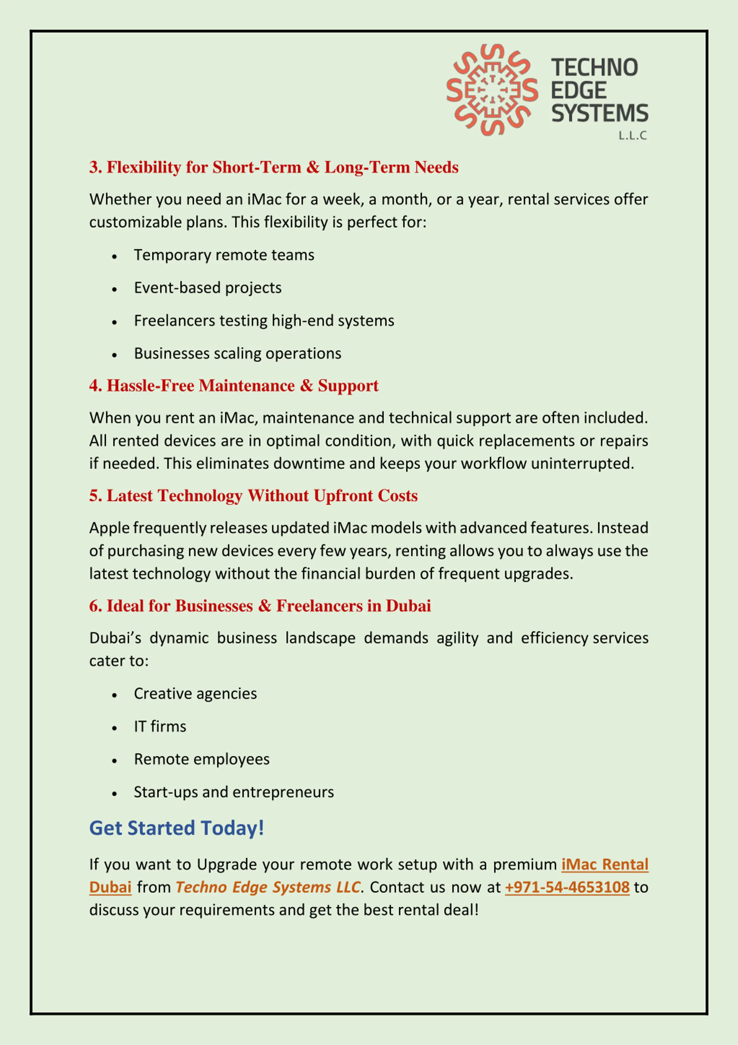3. Flexibility for Short-Term & Long-Term Needs Whether you need an iMac for a week, a month, or a year, rental services offer customizable plans. This flexibility is perfect for: Temporary remote teams Event-based projects Freelancers testing high-end systems Businesses scaling operations 4. Hassle-Free Maintenance & Support When you rent an iMac, maintenance and technical support are often included. All rented devices are in optimal condition, with quick replacements or repairs if needed. This eliminates downtime and keeps your workflow uninterrupted. 5. Latest Technology Without Upfront Costs Apple frequently releases updated iMac models with advanced features. Instead of purchasing new devices every few years, renting allows you to always use the latest technology without the financial burden of frequent upgrades. 6. Ideal for Businesses & Freelancers in Dubai Dubai s dynamic business landscape demands agility and efficiency services cater to: Creative agencies IT firms Remote employees Start-ups and entrepreneurs Get Started Today! If you want to Upgrade your remote work setup with a premium iMac Rental Dubai from Techno Edge Systems LLC. Contact us now at +971-54-4653108 to discuss your requirements and get the best rental deal!