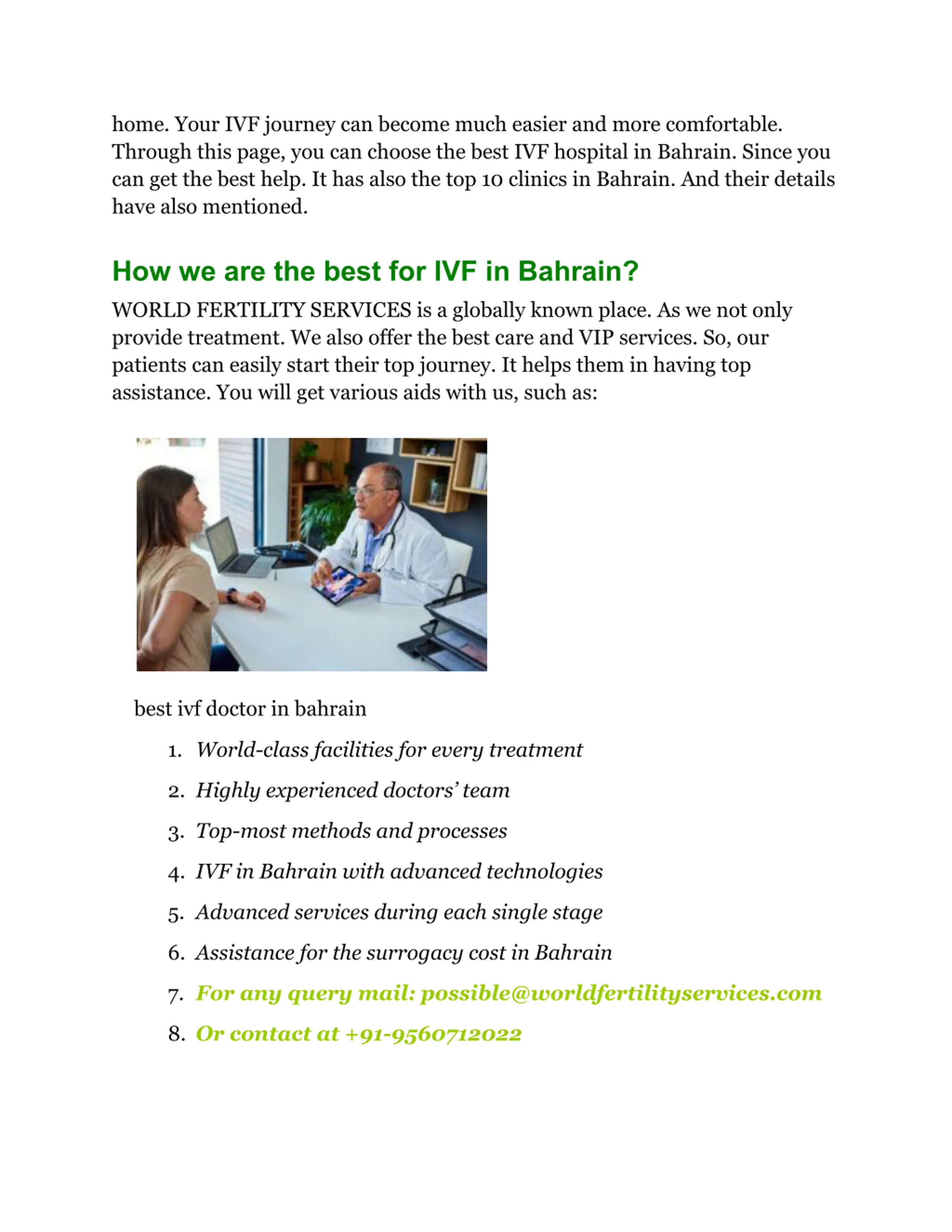 home. Your IVF journey can become much easier and more comfortable. Through this page, you can choose the best IVF hospital in Bahrain. Since you can get the best help. It has also the top 10 clinics in Bahrain. And their details have also mentioned. How we are the best for IVF in Bahrain? WORLD FERTILITY SERVICES is a globally known place. As we not only provide treatment. We also offer the best care and VIP services. So, our patients can easily start their top journey. It helps them in having top assistance. You will get various aids with us, such as: best ivf doctor in bahrain 1.World-class facilities for every treatment 2.Highly experienced doctors team 3.Top-most methods and processes 4.IVF in Bahrain with advanced technologies 5.Advanced services during each single stage 6.Assistance for the surrogacy cost in Bahrain 7.For any query mail: possible@worldfertilityservices.com 8.Or contact at +91-9560712022
