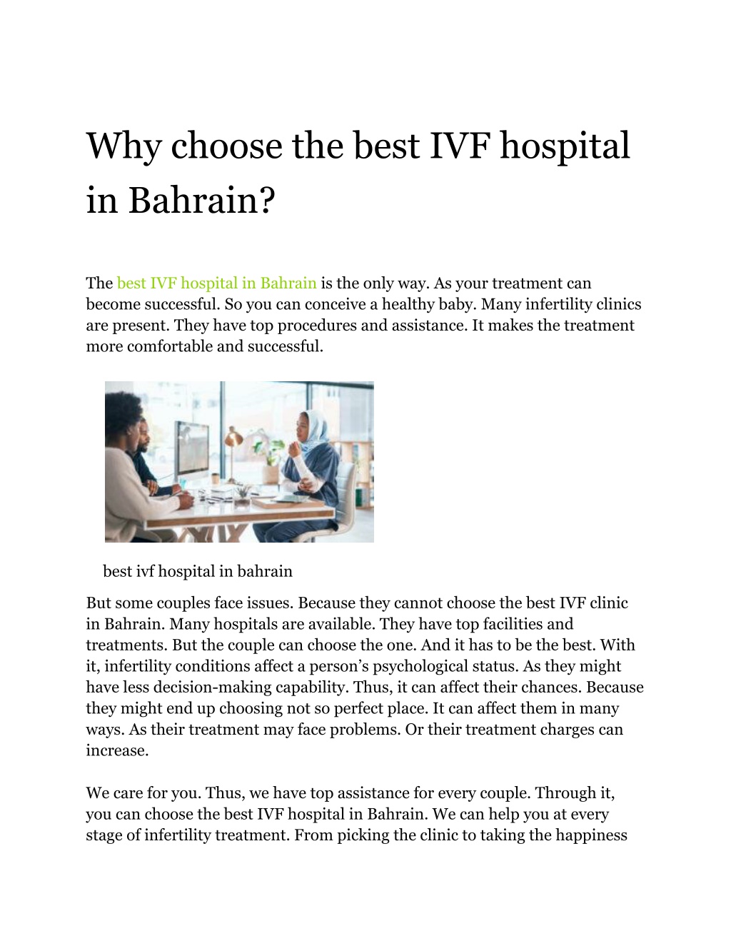 The best IVF hospital in Bahrain is the only way. As your treatment can become successful. So you can conceive a healthy baby. Many infertility clinics are present. They have top procedures and assistance. nVisit us: //worldfertilityservices.com/