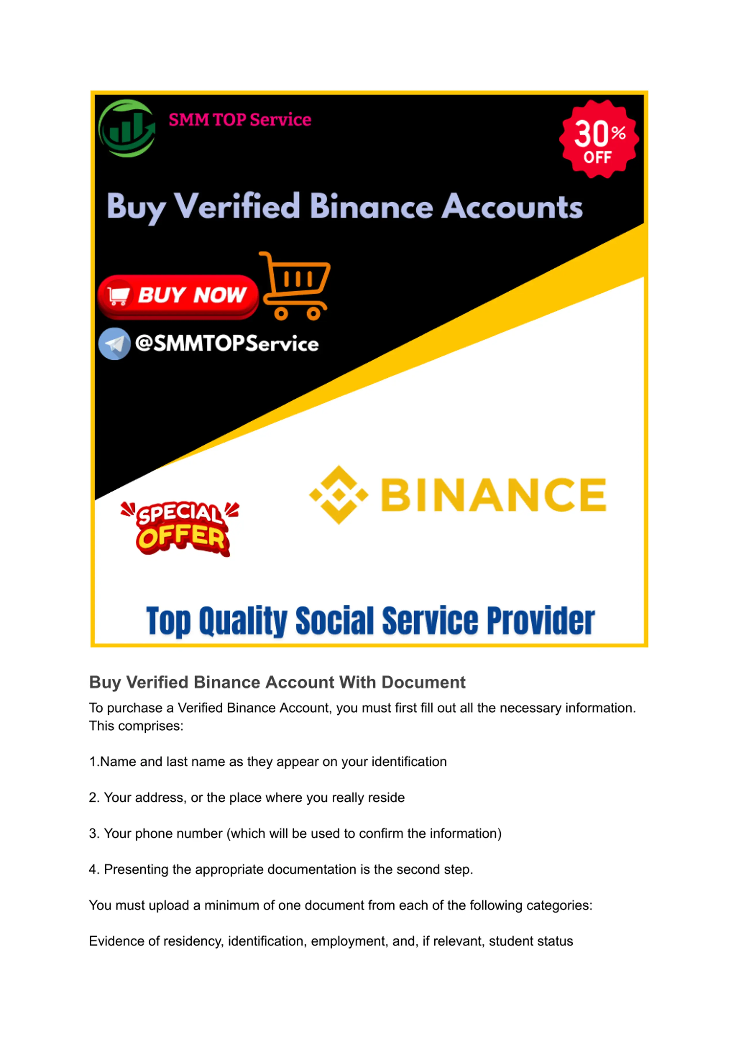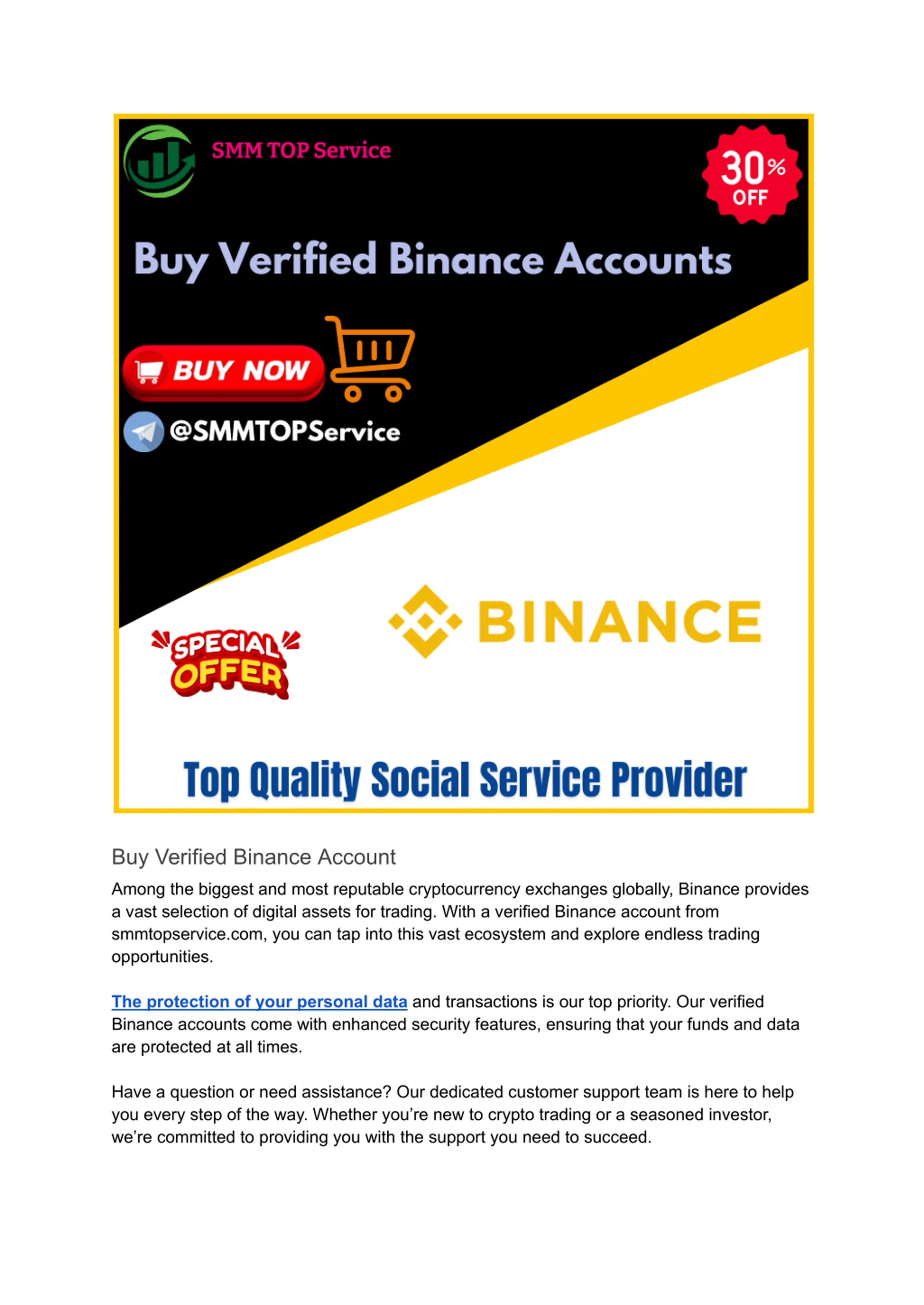 Why Do You Purchase Bainance Account Verifications? Buy Verified Binance Account Our site, your trusted source for Buy verified Binance account. Say goodbye to complicated registration processes and hello to hassle-free access to one of the world s leading cryptocurrency exchanges. About Binance Account Binance is a global cryptocurrency exchange platform that provides a wide range of trading services for digital assets. Founded in 2017, Binance has grown to become one of the most popular and trusted names in the crypto industry, serving millions of users worldwide. Why Choose smmtopservice.com for Your Binance Account? At smmtopservice.com, we understand the importance of reliability and security when it comes to cryptocurrency trading. That s why we offer verified Binance accounts, ensuring a seamless and secure trading experience for our customers. Here s why you should choose us: Our Binance accounts are thoroughly verified, providing you with peace of mind and security for your crypto transactions. Say goodbye to the hassle of verification delays and enjoy instant access to the Binance platform. Skip the lengthy registration process and get straight to trading. With our verified Binance accounts, you can start buying, selling, and trading cryptocurrencies right away, without any unnecessary delays or complications. Website Visit Now:- Click the link:https://smmtopservice.com/product/buy-verified-binance-accou nts/ If you want more information just contact me now. 24 24-hour Reply/Contact Email:smmtopservice@gmail.com WhatsApp:+1(260)232 3862 Skype: SMMTOPService Telegram:@SMMTOPService