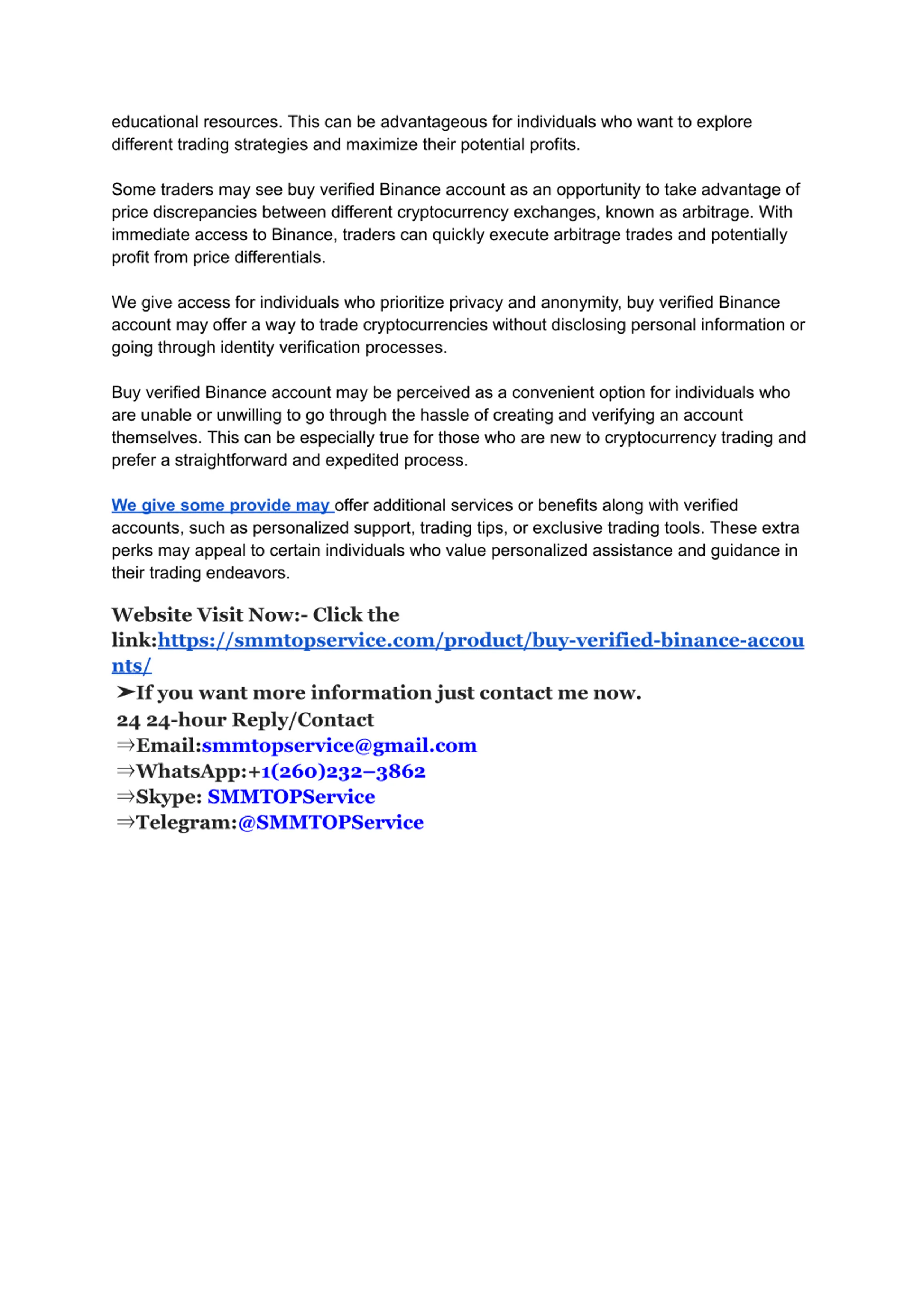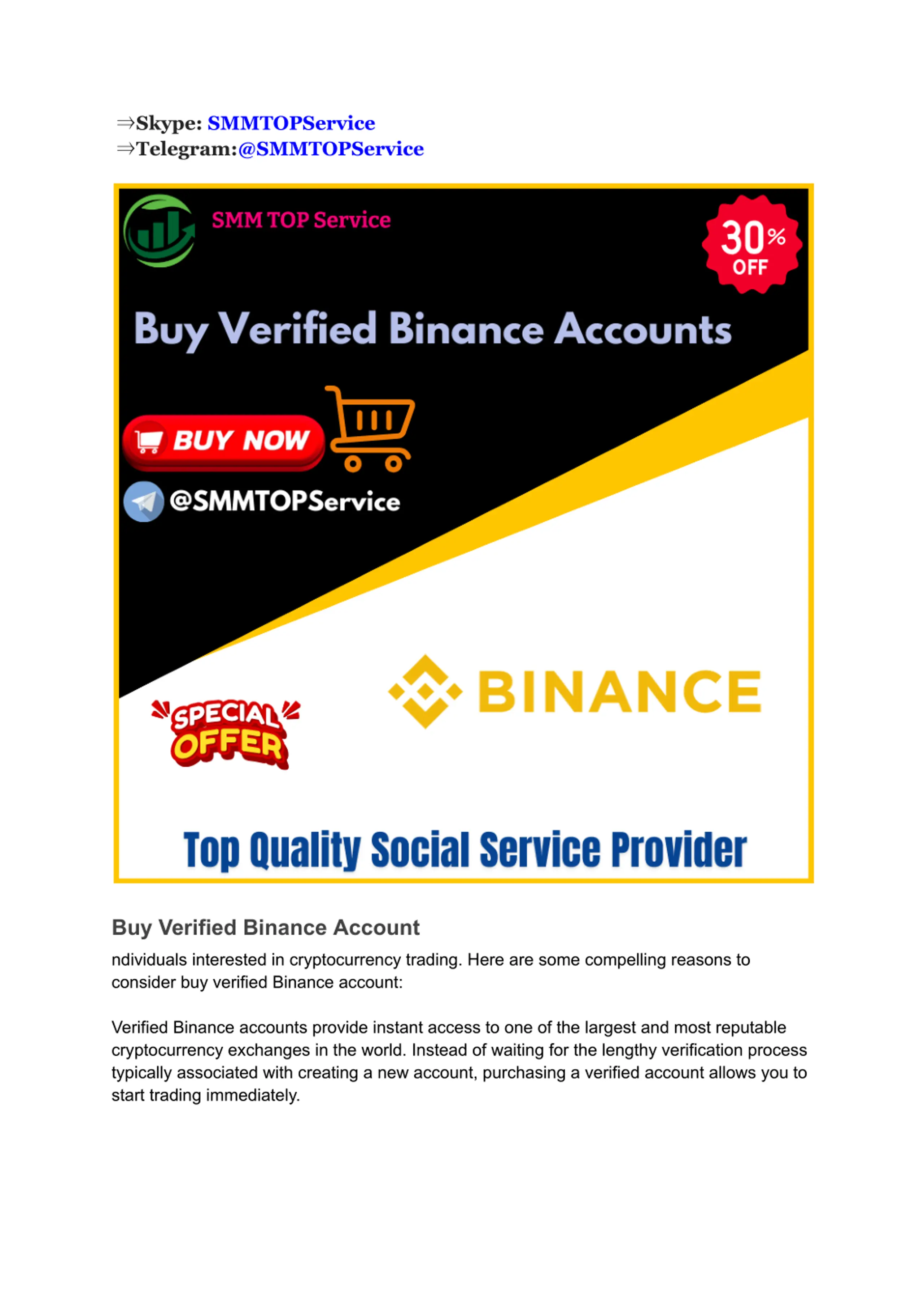 educational resources. This can be advantageous for individuals who want to explore different trading strategies and maximize their potential profits. Some traders may see buy verified Binance account as an opportunity to take advantage of price discrepancies between different cryptocurrency exchanges, known as arbitrage. With immediate access to Binance, traders can quickly execute arbitrage trades and potentially profit from price differentials. We give access for individuals who prioritize privacy and anonymity, buy verified Binance account may offer a way to trade cryptocurrencies without disclosing personal information or going through identity verification processes. Buy verified Binance account may be perceived as a convenient option for individuals who are unable or unwilling to go through the hassle of creating and verifying an account themselves. This can be especially true for those who are new to cryptocurrency trading and prefer a straightforward and expedited process. We give some provide may offer additional services or benefits along with verified accounts, such as personalized support, trading tips, or exclusive trading tools. These extra perks may appeal to certain individuals who value personalized assistance and guidance in their trading endeavors. Website Visit Now:- Click the link:https://smmtopservice.com/product/buy-verified-binance-accou nts/ If you want more information just contact me now. 24 24-hour Reply/Contact Email:smmtopservice@gmail.com WhatsApp:+1(260)232 3862 Skype: SMMTOPService Telegram:@SMMTOPService