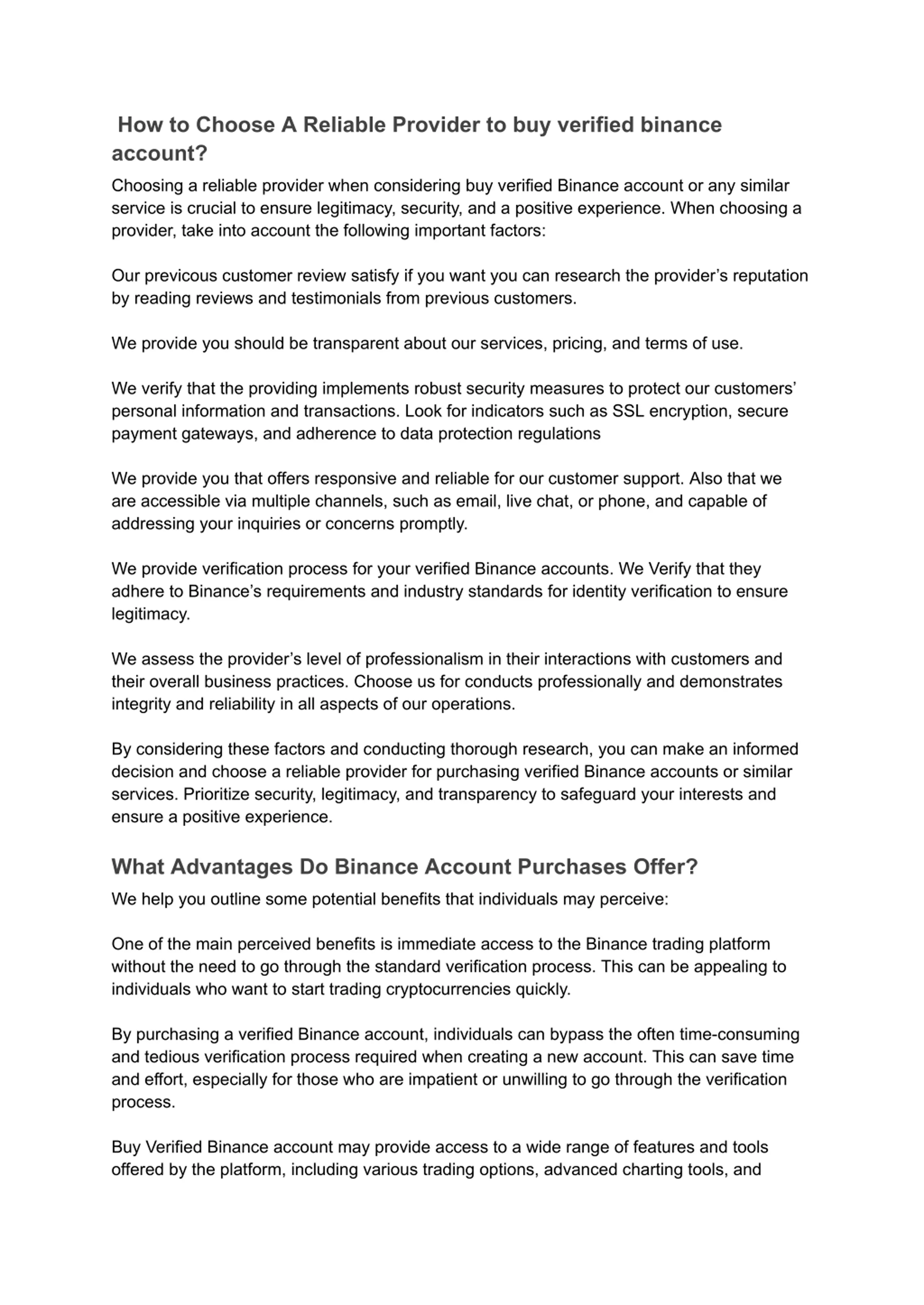How to Choose A Reliable Provider to buy verified binance account? Choosing a reliable provider when considering buy verified Binance account or any similar service is crucial to ensure legitimacy, security, and a positive experience. When choosing a provider, take into account the following important factors: Our previcous customer review satisfy if you want you can research the provider s reputation by reading reviews and testimonials from previous customers. We provide you should be transparent about our services, pricing, and terms of use. We verify that the providing implements robust security measures to protect our customers personal information and transactions. Look for indicators such as SSL encryption, secure payment gateways, and adherence to data protection regulations We provide you that offers responsive and reliable for our customer support. Also that we are accessible via multiple channels, such as email, live chat, or phone, and capable of addressing your inquiries or concerns promptly. We provide verification process for your verified Binance accounts. We Verify that they adhere to Binance s requirements and industry standards for identity verification to ensure legitimacy. We assess the provider s level of professionalism in their interactions with customers and their overall business practices. Choose us for conducts professionally and demonstrates integrity and reliability in all aspects of our operations. By considering these factors and conducting thorough research, you can make an informed decision and choose a reliable provider for purchasing verified Binance accounts or similar services. Prioritize security, legitimacy, and transparency to safeguard your interests and ensure a positive experience. What Advantages Do Binance Account Purchases Offer? We help you outline some potential benefits that individuals may perceive: One of the main perceived benefits is immediate access to the Binance trading platform without the need to go through the standard verification process. This can be appealing to individuals who want to start trading cryptocurrencies quickly. By purchasing a verified Binance account, individuals can bypass the often time-consuming and tedious verification process required when creating a new account. This can save time and effort, especially for those who are impatient or unwilling to go through the verification process. Buy Verified Binance account may provide access to a wide range of features and tools offered by the platform, including various trading options, advanced charting tools, and