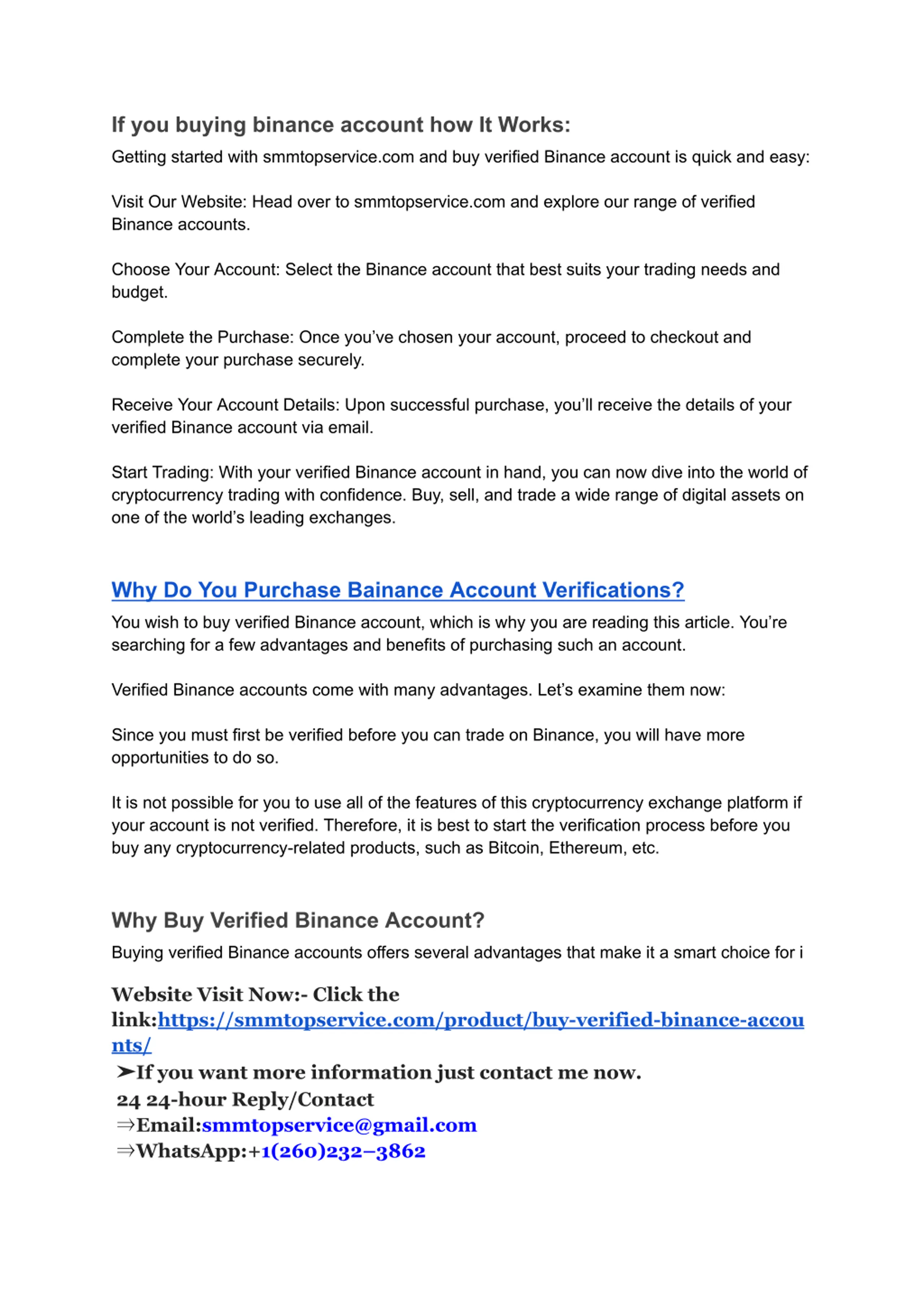 If you buying binance account how It Works: Getting started with smmtopservice.com and buy verified Binance account is quick and easy: Visit Our Website: Head over to smmtopservice.com and explore our range of verified Binance accounts. Choose Your Account: Select the Binance account that best suits your trading needs and budget. Complete the Purchase: Once you ve chosen your account, proceed to checkout and complete your purchase securely. Receive Your Account Details: Upon successful purchase, you ll receive the details of your verified Binance account via email. Start Trading: With your verified Binance account in hand, you can now dive into the world of cryptocurrency trading with confidence. Buy, sell, and trade a wide range of digital assets on one of the world s leading exchanges. Why Do You Purchase Bainance Account Verifications? You wish to buy verified Binance account, which is why you are reading this article. You re searching for a few advantages and benefits of purchasing such an account. Verified Binance accounts come with many advantages. Let s examine them now: Since you must first be verified before you can trade on Binance, you will have more opportunities to do so. It is not possible for you to use all of the features of this cryptocurrency exchange platform if your account is not verified. Therefore, it is best to start the verification process before you buy any cryptocurrency-related products, such as Bitcoin, Ethereum, etc. Why Buy Verified Binance Account? Buying verified Binance accounts offers several advantages that make it a smart choice for i Website Visit Now:- Click the link:https://smmtopservice.com/product/buy-verified-binance-accou nts/ If you want more information just contact me now. 24 24-hour Reply/Contact Email:smmtopservice@gmail.com WhatsApp:+1(260)232 3862