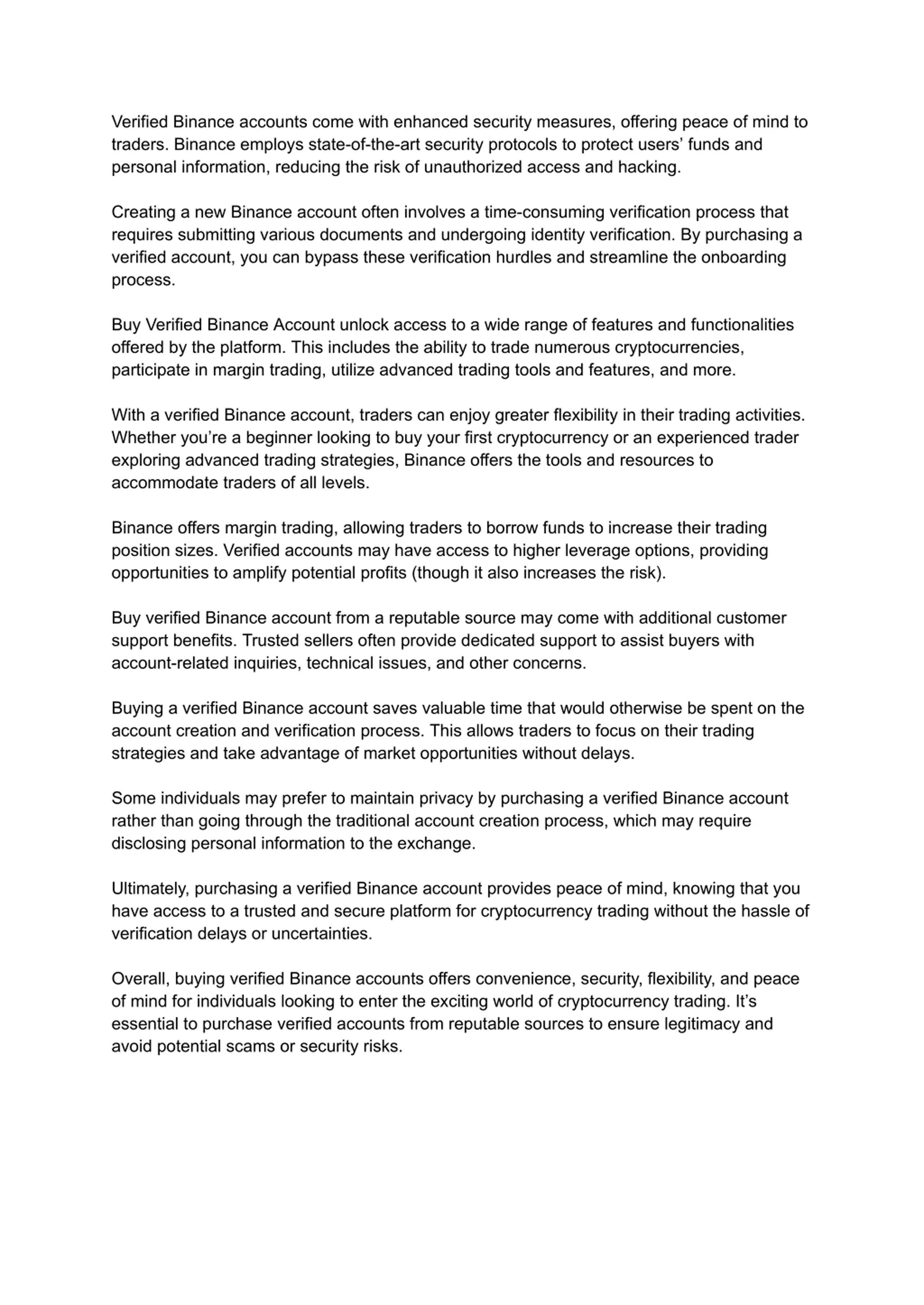 Verified Binance accounts come with enhanced security measures, offering peace of mind to traders. Binance employs state-of-the-art security protocols to protect users funds and personal information, reducing the risk of unauthorized access and hacking. Creating a new Binance account often involves a time-consuming verification process that requires submitting various documents and undergoing identity verification. By purchasing a verified account, you can bypass these verification hurdles and streamline the onboarding process. Buy Verified Binance Account unlock access to a wide range of features and functionalities offered by the platform. This includes the ability to trade numerous cryptocurrencies, participate in margin trading, utilize advanced trading tools and features, and more. With a verified Binance account, traders can enjoy greater flexibility in their trading activities. Whether you re a beginner looking to buy your first cryptocurrency or an experienced trader exploring advanced trading strategies, Binance offers the tools and resources to accommodate traders of all levels. Binance offers margin trading, allowing traders to borrow funds to increase their trading position sizes. Verified accounts may have access to higher leverage options, providing opportunities to amplify potential profits (though it also increases the risk). Buy verified Binance account from a reputable source may come with additional customer support benefits. Trusted sellers often provide dedicated support to assist buyers with account-related inquiries, technical issues, and other concerns. Buying a verified Binance account saves valuable time that would otherwise be spent on the account creation and verification process. This allows traders to focus on their trading strategies and take advantage of market opportunities without delays. Some individuals may prefer to maintain privacy by purchasing a verified Binance account rather than going through the traditional account creation process, which may require disclosing personal information to the exchange. Ultimately, purchasing a verified Binance account provides peace of mind, knowing that you have access to a trusted and secure platform for cryptocurrency trading without the hassle of verification delays or uncertainties. Overall, buying verified Binance accounts offers convenience, security, flexibility, and peace of mind for individuals looking to enter the exciting world of cryptocurrency trading. It s essential to purchase verified accounts from reputable sources to ensure legitimacy and avoid potential scams or security risks.