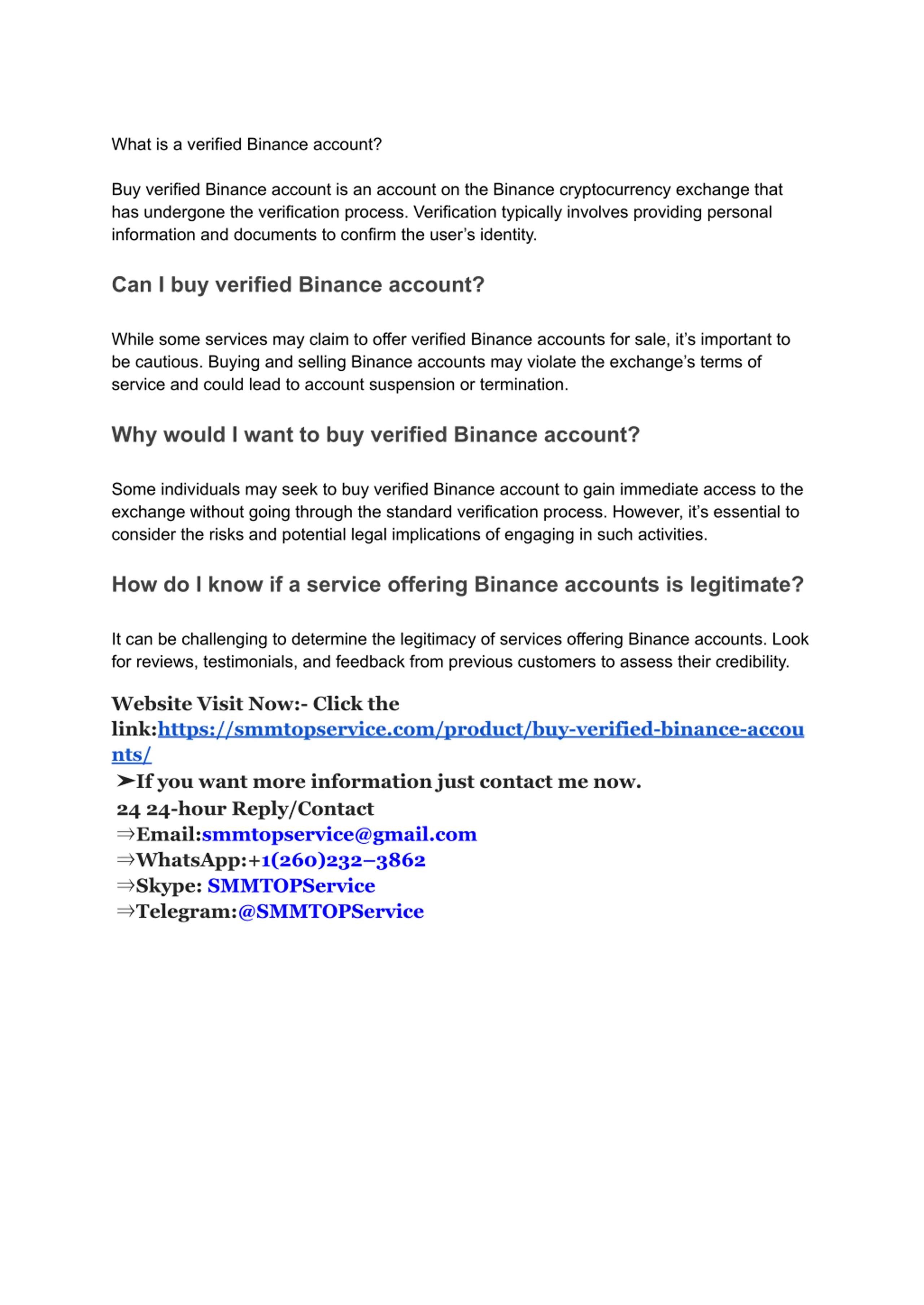 What is a verified Binance account? Buy verified Binance account is an account on the Binance cryptocurrency exchange that has undergone the verification process. Verification typically involves providing personal information and documents to confirm the user s identity. Can I buy verified Binance account? While some services may claim to offer verified Binance accounts for sale, it s important to be cautious. Buying and selling Binance accounts may violate the exchange s terms of service and could lead to account suspension or termination. Why would I want to buy verified Binance account? Some individuals may seek to buy verified Binance account to gain immediate access to the exchange without going through the standard verification process. However, it s essential to consider the risks and potential legal implications of engaging in such activities. How do I know if a service offering Binance accounts is legitimate? It can be challenging to determine the legitimacy of services offering Binance accounts. Look for reviews, testimonials, and feedback from previous customers to assess their credibility. Website Visit Now:- Click the link:https://smmtopservice.com/product/buy-verified-binance-accou nts/ If you want more information just contact me now. 24 24-hour Reply/Contact Email:smmtopservice@gmail.com WhatsApp:+1(260)232 3862 Skype: SMMTOPService Telegram:@SMMTOPService