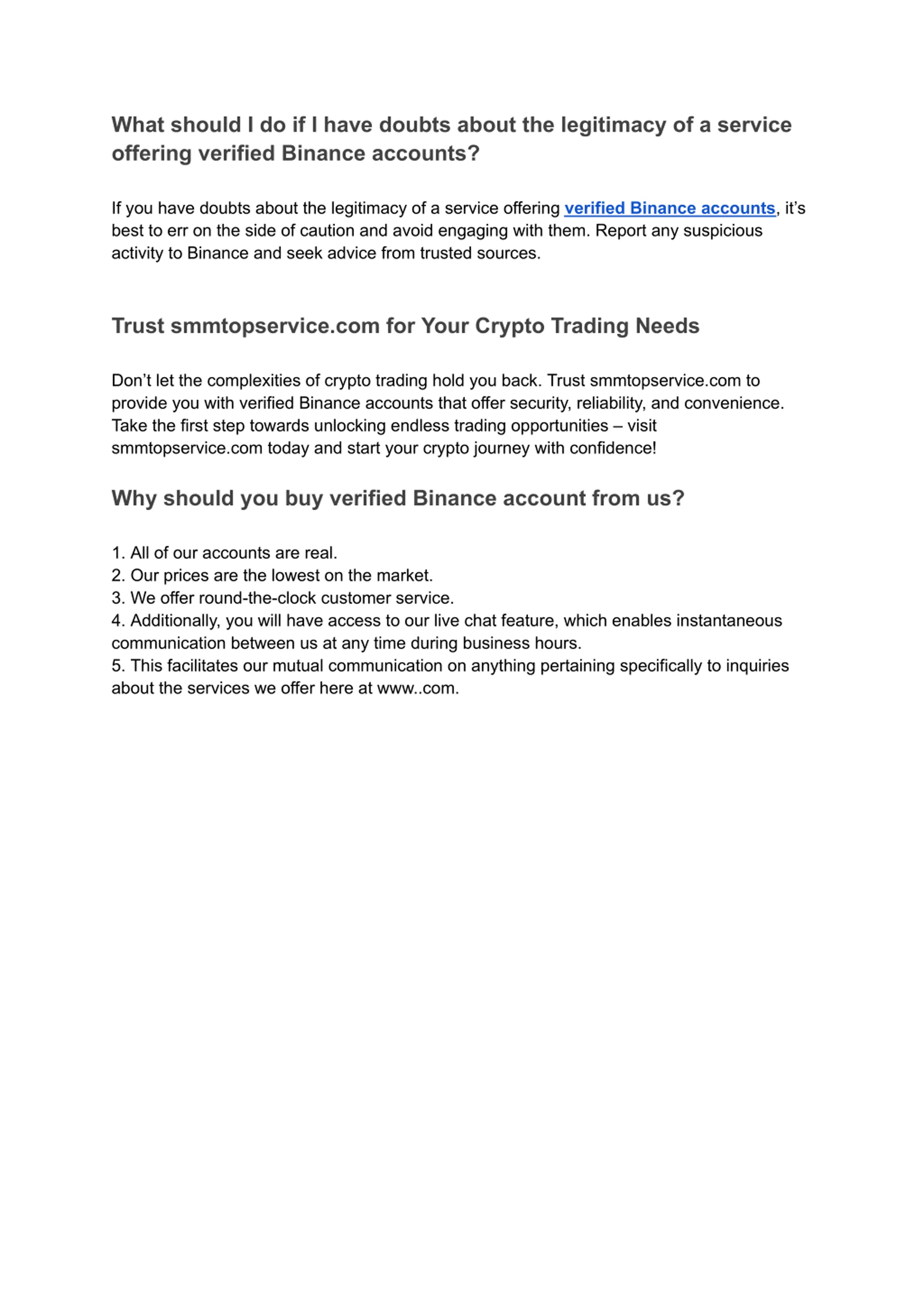 What should I do if I have doubts about the legitimacy of a service offering verified Binance accounts? If you have doubts about the legitimacy of a service offering verified Binance accounts, it s best to err on the side of caution and avoid engaging with them. Report any suspicious activity to Binance and seek advice from trusted sources. Trust smmtopservice.com for Your Crypto Trading Needs Don t let the complexities of crypto trading hold you back. Trust smmtopservice.com to provide you with verified Binance accounts that offer security, reliability, and convenience. Take the first step towards unlocking endless trading opportunities visit smmtopservice.com today and start your crypto journey with confidence! Why should you buy verified Binance account from us? 1. All of our accounts are real. 2. Our prices are the lowest on the market. 3. We offer round-the-clock customer service. 4. Additionally, you will have access to our live chat feature, which enables instantaneous communication between us at any time during business hours. 5. This facilitates our mutual communication on anything pertaining specifically to inquiries about the services we offer here at www..com.