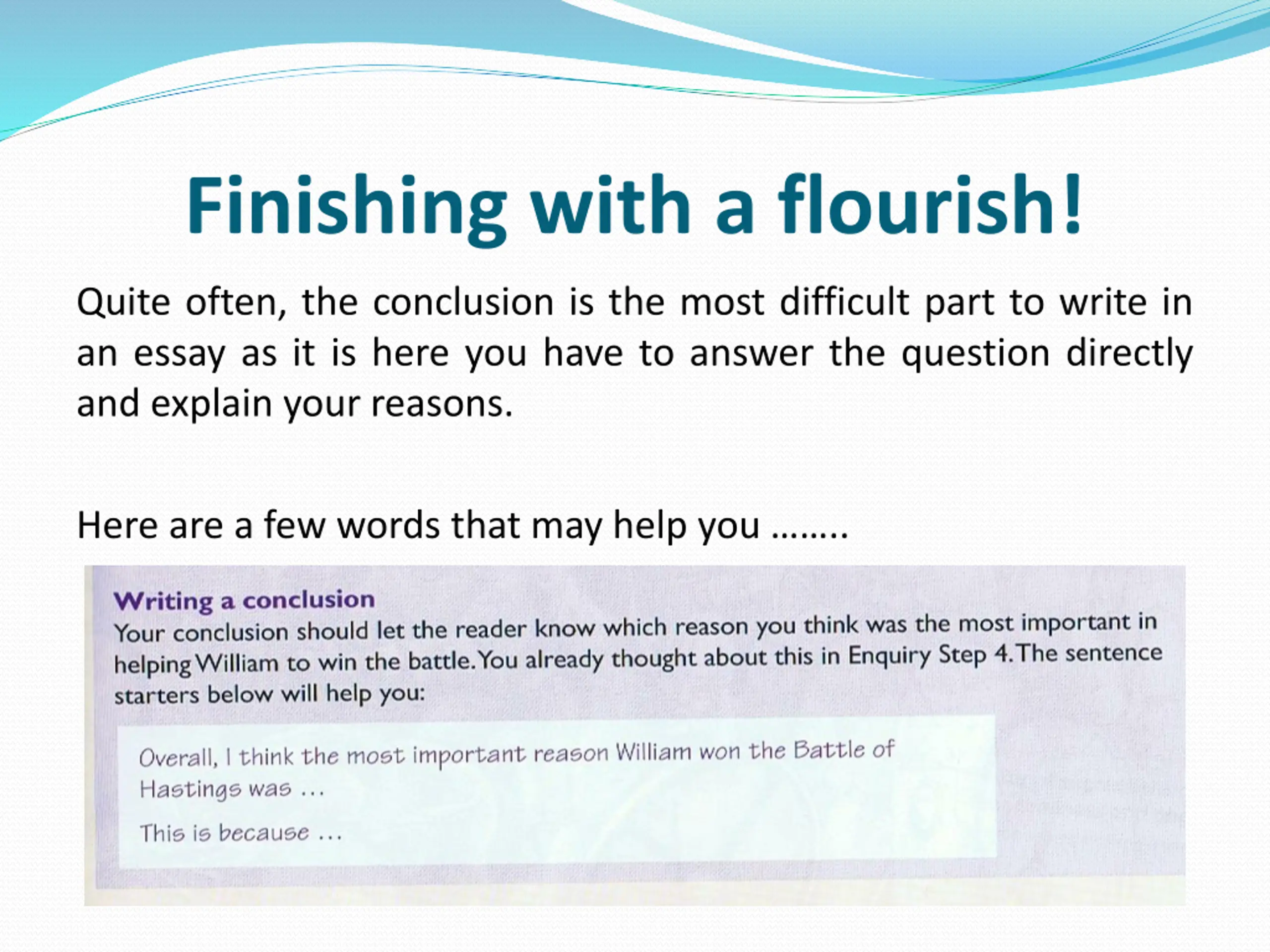 Finishing with a flourish! Quite often, the conclusion is the most difficult part to write in an essay as it is here you have to answer the question directly and explain your reasons. Here are a few words that may help you ..