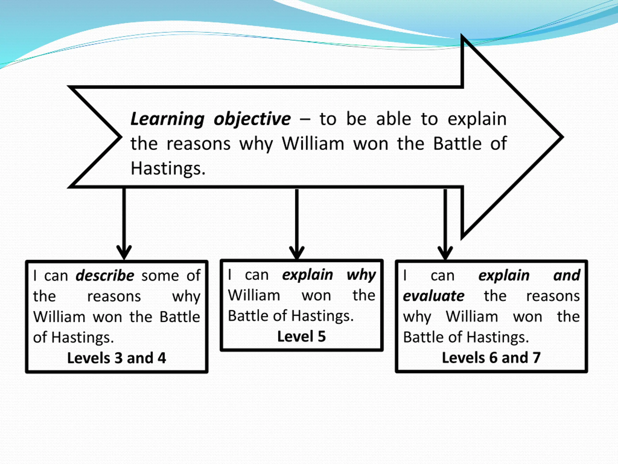 Learning objective to be able to explain the reasons why William won the Battle of Hastings. I canexplain why William won Battle of Hastings. Level 5 I evaluate the reasons why William won the Battle of Hastings. Levels 6 and 7 can explain and I can describe some of the reasons William won the Battle of Hastings. Levels 3 and 4 the why