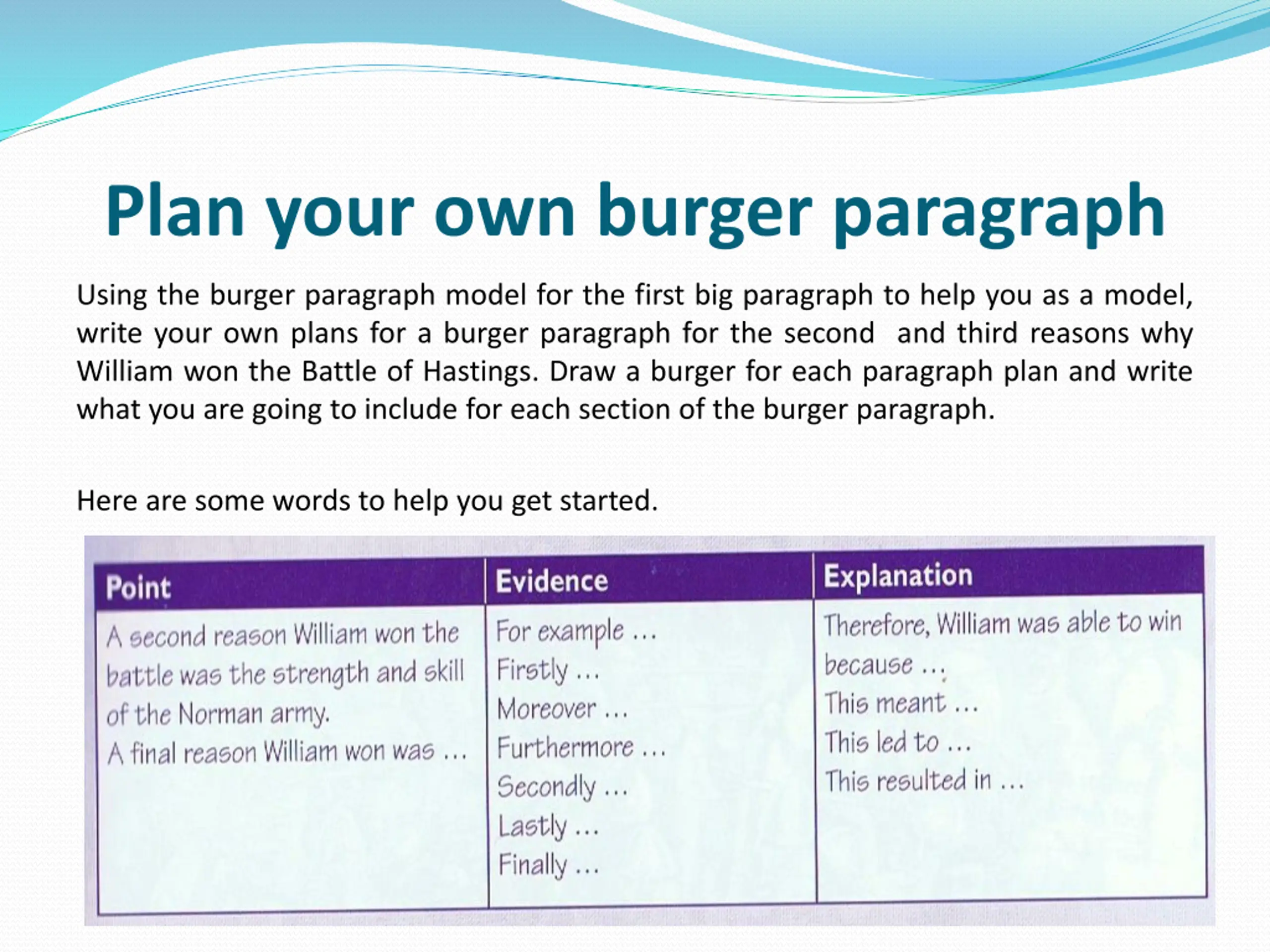 Plan your own burger paragraph Using the burger paragraph model for the first big paragraph to help you as a model, write your own plans for a burger paragraph for the second and third reasons why William won the Battle of Hastings. Draw a burger for each paragraph plan and write what you are going to include for each section of the burger paragraph. Here are some words to help you get started.