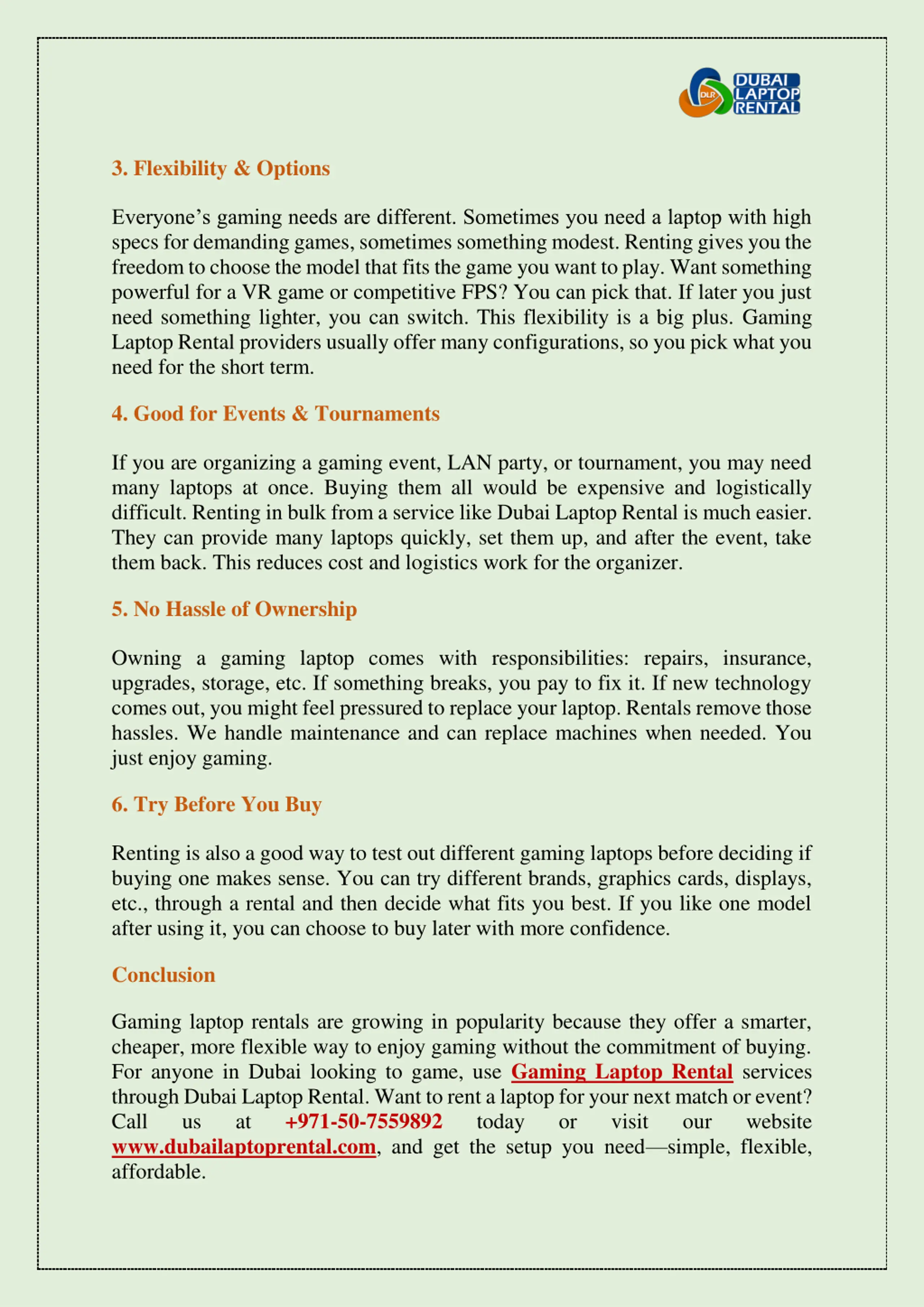 3. Flexibility & Options Everyone s gaming needs are different. Sometimes you need a laptop with high specs for demanding games, sometimes something modest. Renting gives you the freedom to choose the model that fits the game you want to play. Want something powerful for a VR game or competitive FPS? You can pick that. If later you just need something lighter, you can switch. This flexibility is a big plus. Gaming Laptop Rental providers usually offer many configurations, so you pick what you need for the short term. 4. Good for Events & Tournaments If you are organizing a gaming event, LAN party, or tournament, you may need many laptops at once. Buying them all would be expensive and logistically difficult. Renting in bulk from a service like Dubai Laptop Rental is much easier. They can provide many laptops quickly, set them up, and after the event, take them back. This reduces cost and logistics work for the organizer. 5. No Hassle of Ownership Owning a gaming laptop comes with responsibilities: repairs, insurance, upgrades, storage, etc. If something breaks, you pay to fix it. If new technology comes out, you might feel pressured to replace your laptop. Rentals remove those hassles. We handle maintenance and can replace machines when needed. You just enjoy gaming. 6. Try Before You Buy Renting is also a good way to test out different gaming laptops before deciding if buying one makes sense. You can try different brands, graphics cards, displays, etc., through a rental and then decide what fits you best. If you like one model after using it, you can choose to buy later with more confidence. Conclusion Gaming laptop rentals are growing in popularity because they offer a smarter, cheaper, more flexible way to enjoy gaming without the commitment of buying. For anyone in Dubai looking to game, use Gaming Laptop Rental services through Dubai Laptop Rental. Want to rent a laptop for your next match or event? Call us at +971-50-7559892 www.dubailaptoprental.com, and get the setup you need simple, flexible, affordable. today or visit our website