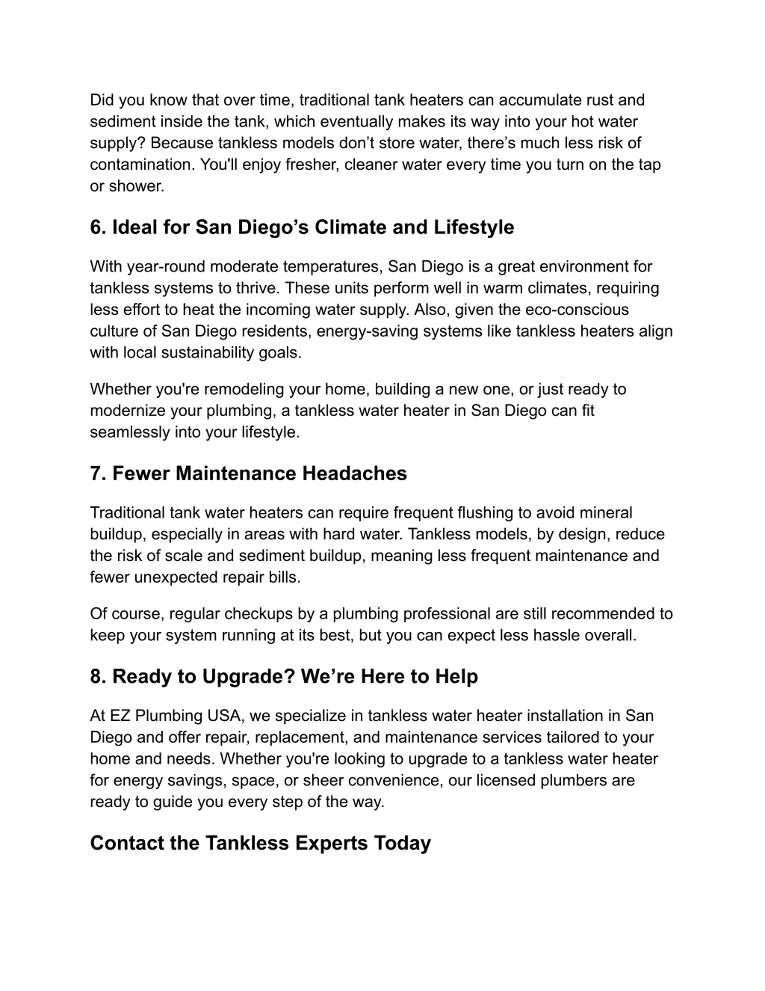 Did you know that over time, traditional tank heaters can accumulate rust and sediment inside the tank, which eventually makes its way into your hot water supply? Because tankless models don t store water, there s much less risk of contamination. You'll enjoy fresher, cleaner water every time you turn on the tap or shower. 6. Ideal for San Diego s Climate and Lifestyle With year-round moderate temperatures, San Diego is a great environment for tankless systems to thrive. These units perform well in warm climates, requiring less effort to heat the incoming water supply. Also, given the eco-conscious culture of San Diego residents, energy-saving systems like tankless heaters align with local sustainability goals. Whether you're remodeling your home, building a new one, or just ready to modernize your plumbing, a tankless water heater in San Diego can fit seamlessly into your lifestyle. 7. Fewer Maintenance Headaches Traditional tank water heaters can require frequent flushing to avoid mineral buildup, especially in areas with hard water. Tankless models, by design, reduce the risk of scale and sediment buildup, meaning less frequent maintenance and fewer unexpected repair bills. Of course, regular checkups by a plumbing professional are still recommended to keep your system running at its best, but you can expect less hassle overall. 8. Ready to Upgrade? We re Here to Help At EZ Plumbing USA, we specialize in tankless water heater installation in San Diego and offer repair, replacement, and maintenance services tailored to your home and needs. Whether you're looking to upgrade to a tankless waterheater for energy savings, space, or sheer convenience, our licensed plumbers are ready to guide you every step of the way. Contact the Tankless Experts Today