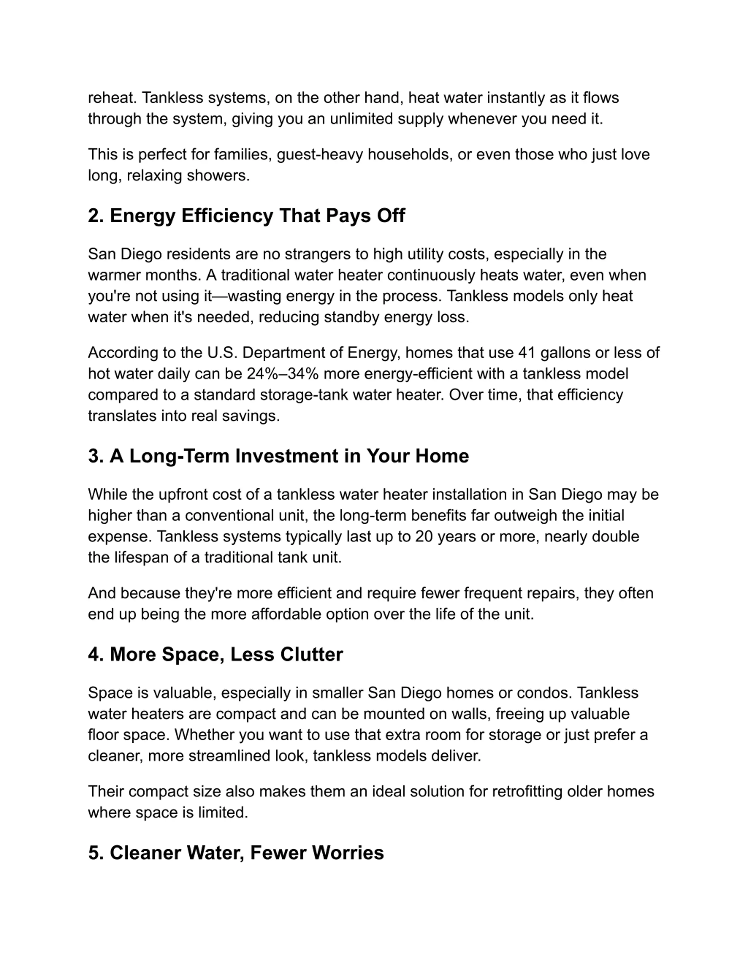 reheat. Tankless systems, on the other hand, heat water instantly as it flows through the system, giving you an unlimited supply whenever you need it. This is perfect for families, guest-heavy households, or even those who just love long, relaxing showers. 2. Energy Efficiency That Pays Off San Diego residents are no strangers to high utility costs, especially in the warmer months. A traditional water heater continuously heats water, even when you're not using it wasting energy in the process. Tankless models only heat water when it's needed, reducing standby energy loss. According to the U.S. Department of Energy, homes that use 41 gallons or less of hot water daily can be 24% 34% more energy-efficient with a tankless model compared to a standard storage-tank water heater. Over time, that efficiency translates into real savings. 3. A Long-Term Investment in Your Home While the upfront cost of a tankless water heater installation in San Diego may be higher than a conventional unit, the long-term benefits far outweigh the initial expense. Tankless systems typically last up to 20 years or more, nearly double the lifespan of a traditional tank unit. And because they're more efficient and require fewer frequent repairs, they often end up being the more affordable option over the life of the unit. 4. More Space, Less Clutter Space is valuable, especially in smaller San Diego homes or condos. Tankless water heaters are compact and can be mounted on walls, freeing up valuable floor space. Whether you want to use that extra room for storage or just prefer a cleaner, more streamlined look, tankless models deliver. Their compact size also makes them an ideal solution for retrofitting older homes where space is limited. 5. Cleaner Water, Fewer Worries