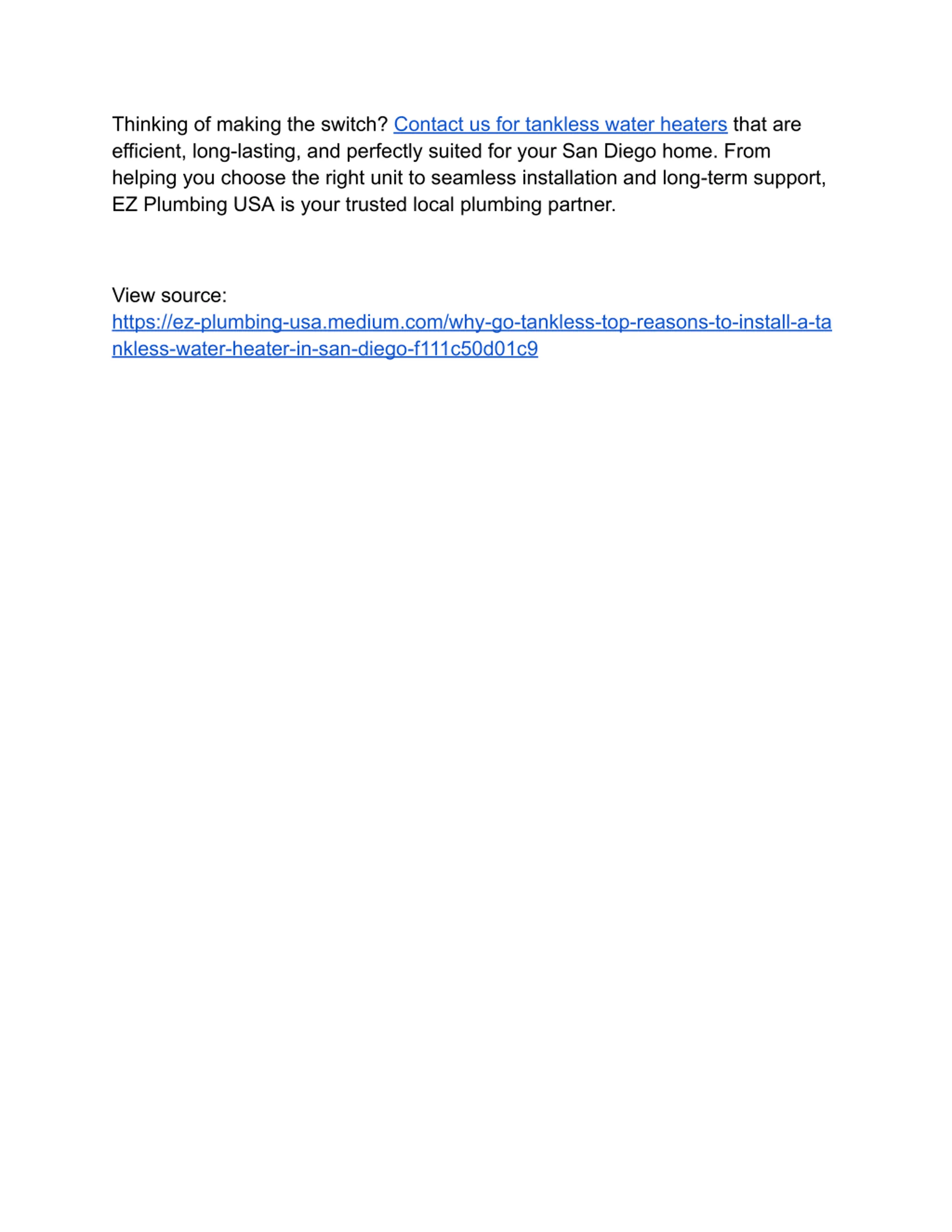 Thinking of making the switch? Contact us for tankless water heaters that are efficient, long-lasting, and perfectly suited for your San Diego home. From helping you choose the right unit to seamless installation and long-term support, EZ Plumbing USA is your trusted local plumbing partner. View source: https://ez-plumbing-usa.medium.com/why-go-tankless-top-reasons-to-install-a-ta nkless-water-heater-in-san-diego-f111c50d01c9