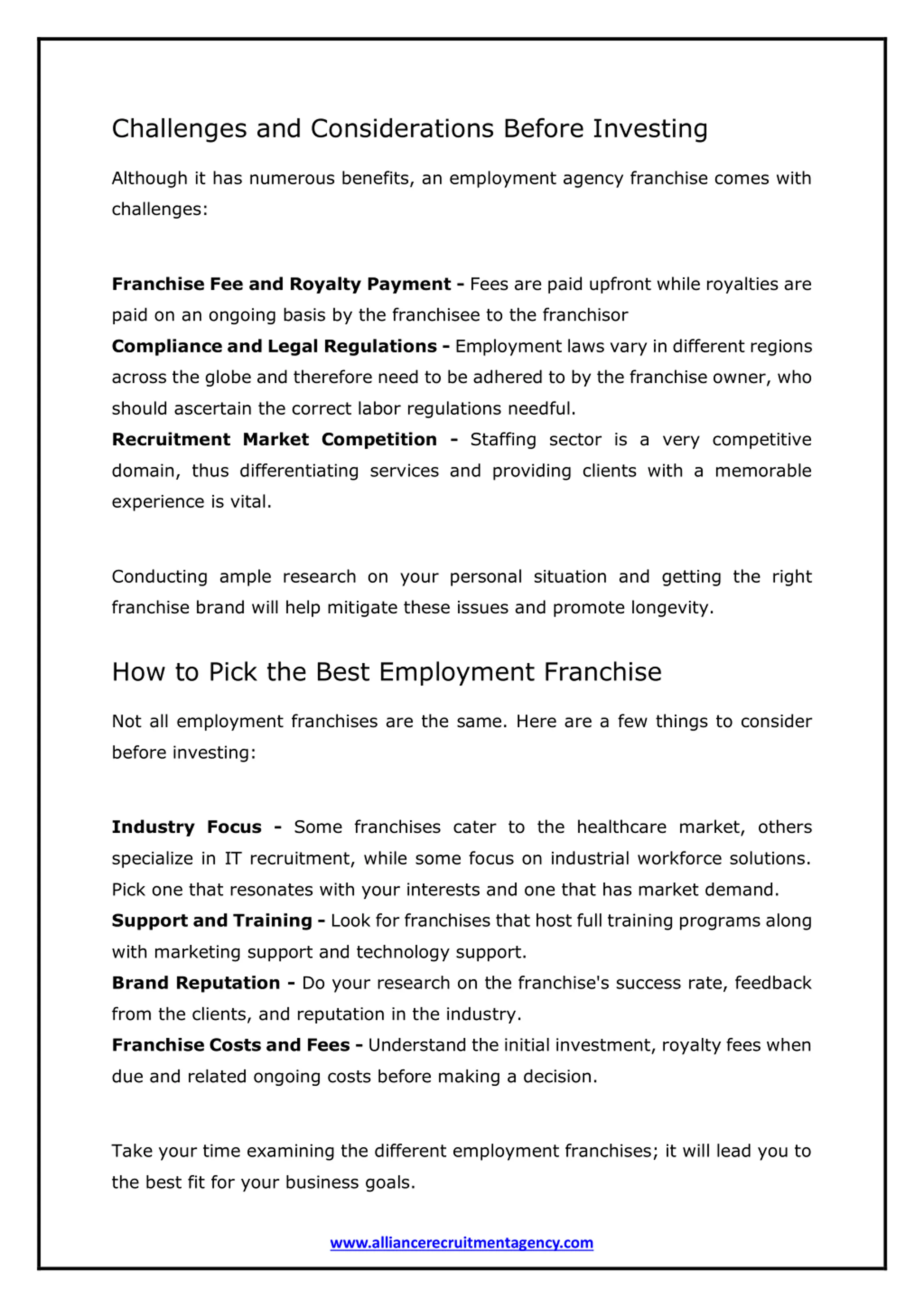 Challenges and Considerations Before Investing Although it has numerous benefits, an employment agency franchise comes with challenges: Franchise Fee and Royalty Payment - Fees are paid upfront while royalties are paid on an ongoing basis by the franchisee to the franchisor Compliance and Legal Regulations - Employment laws vary in different regions across the globe and therefore need to be adhered to by the franchise owner, who should ascertain the correct labor regulations needful. Recruitment Market Competition - Staffing sector is a very competitive domain, thus differentiating services and providing clients with a memorable experience is vital. Conducting ample research on your personal situation and getting the right franchise brand will help mitigate these issues and promote longevity. How to Pick the Best Employment Franchise Not all employment franchises are the same. Here are a few things to consider before investing: Industry Focus - Some franchises cater to the healthcare market, others specialize in IT recruitment, while some focus on industrial workforce solutions. Pick one that resonates with your interests and one that has market demand. Support and Training - Look for franchises that host full training programs along with marketing support and technology support. Brand Reputation - Do your research on the franchise's success rate, feedback from the clients, and reputation in the industry. Franchise Costs and Fees - Understand the initial investment, royalty fees when due and related ongoing costs before making a decision. Take your time examining the different employment franchises; it will lead you to the best fit for your business goals. www.alliancerecruitmentagency.com