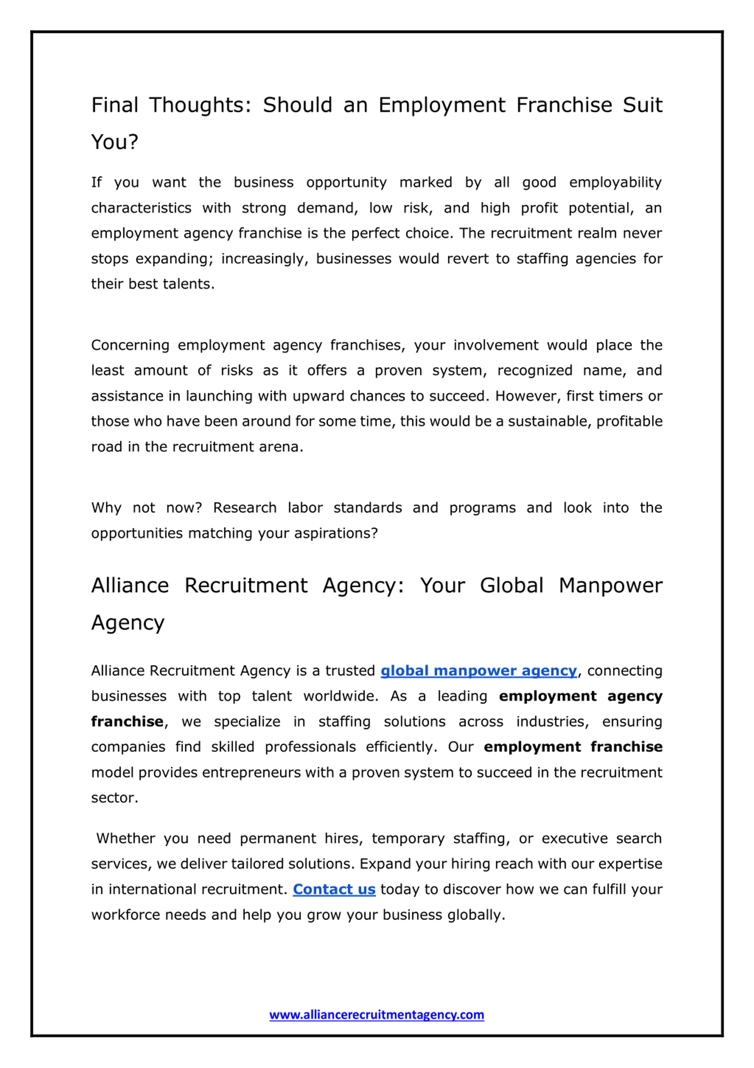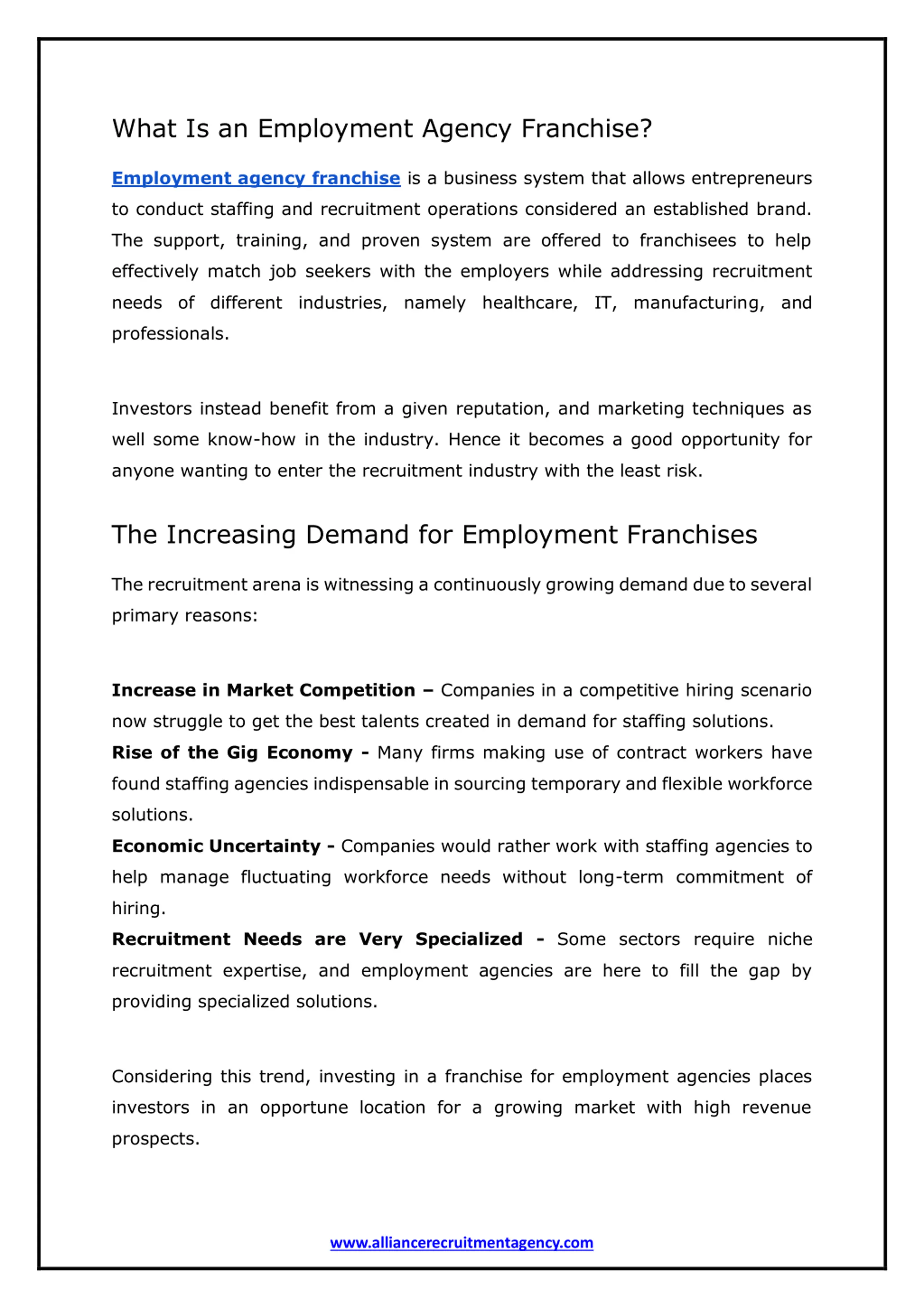Why Investing in an Employment Agency Franchise is a Smart Business Move The demand for skilled talent is rising, and businesses are increasingly turning toward staffing solutions to fulfill workforce requirements. Hence the recruitment industry is regarded as an attractive domain for aspiring entrepreneurs. Investing in an employment agency franchise offers a proven business model with low-risk and high-growth opportunities. The article explains some reasons why an employment agency franchise could be a good investment choice and graces your path towards long-term success. www.alliancerecruitmentagency.com