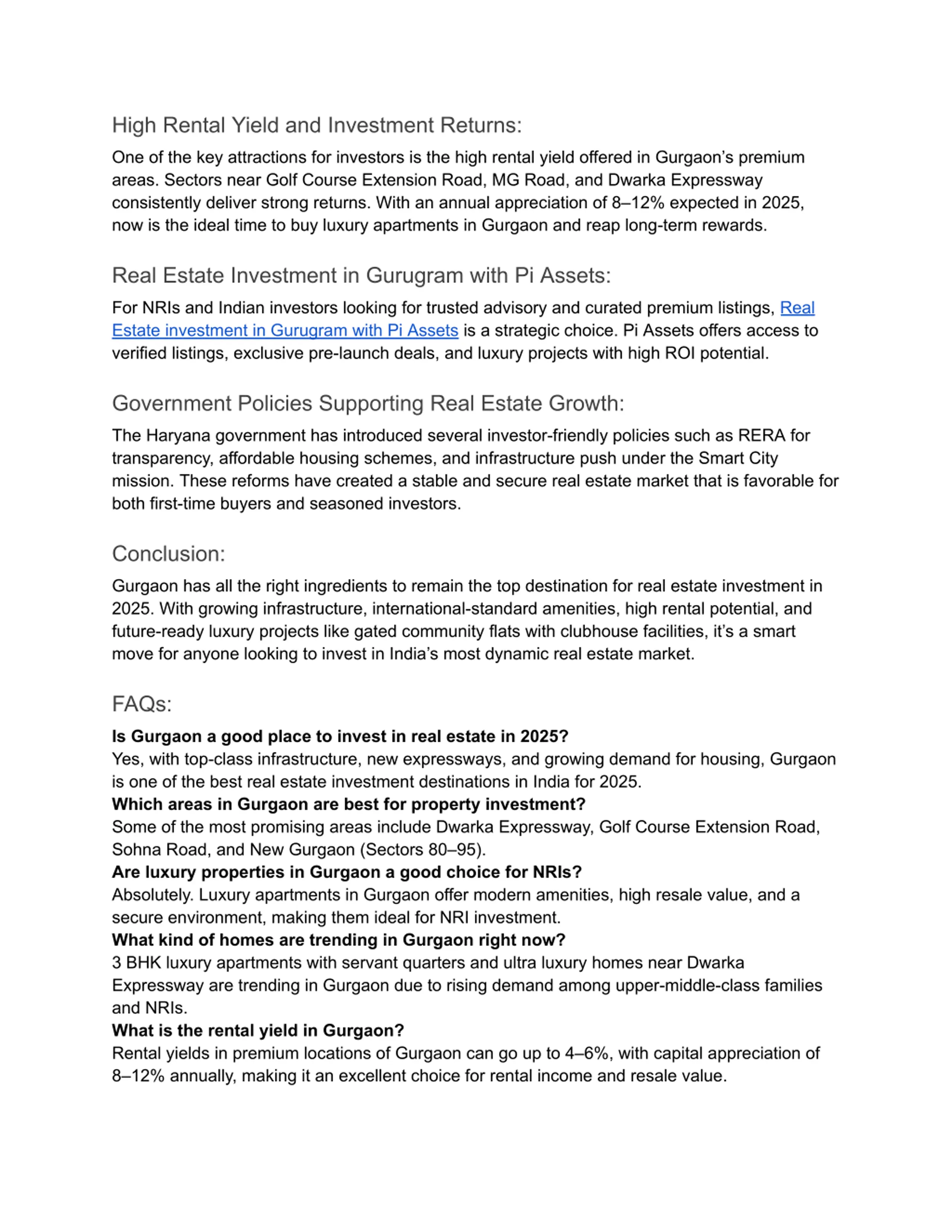 High Rental Yield and Investment Returns: One of the key attractions for investors is the high rental yield offered in Gurgaon s premium areas. Sectors near Golf Course Extension Road, MG Road, and Dwarka Expressway consistently deliver strong returns. With an annual appreciation of 8 12% expected in 2025, now is the ideal time to buy luxury apartments in Gurgaon and reap long-term rewards. Real Estate Investment in Gurugram with Pi Assets: For NRIs and Indian investors looking for trusted advisory and curated premium listings, Real Estate investment in Gurugram with Pi Assets is a strategic choice. Pi Assets offers access to verified listings, exclusive pre-launch deals, and luxury projects with high ROI potential. Government Policies Supporting Real Estate Growth: The Haryana government has introduced several investor-friendly policies such as RERA for transparency, affordable housing schemes, and infrastructure push under the Smart City mission. These reforms have created a stable and secure real estate market that is favorable for both first-time buyers and seasoned investors. Conclusion: Gurgaon has all the right ingredients to remain the top destination for real estate investment in 2025. With growing infrastructure, international-standard amenities, high rental potential, and future-ready luxury projects like gated community flats with clubhouse facilities, it s a smart move for anyone looking to invest in India s most dynamic real estate market. FAQs: Is Gurgaon a good place to invest in real estate in 2025? Yes, with top-class infrastructure, new expressways, and growing demand for housing, Gurgaon is one of the best real estate investment destinations in India for 2025. Which areas in Gurgaon are best for property investment? Some of the most promising areas include Dwarka Expressway, Golf Course Extension Road, Sohna Road, and New Gurgaon (Sectors 80 95). Are luxury properties in Gurgaon a good choice for NRIs? Absolutely. Luxury apartments in Gurgaon offer modern amenities, high resale value, and a secure environment, making them ideal for NRI investment. What kind of homes are trending in Gurgaon right now? 3 BHK luxury apartments with servant quarters and ultra luxury homes near Dwarka Expressway are trending in Gurgaon due to rising demand among upper-middle-class families and NRIs. What is the rental yield in Gurgaon? Rental yields in premium locations of Gurgaon can go up to 4 6%, with capital appreciation of 8 12% annually, making it an excellent choice for rental income and resale value.