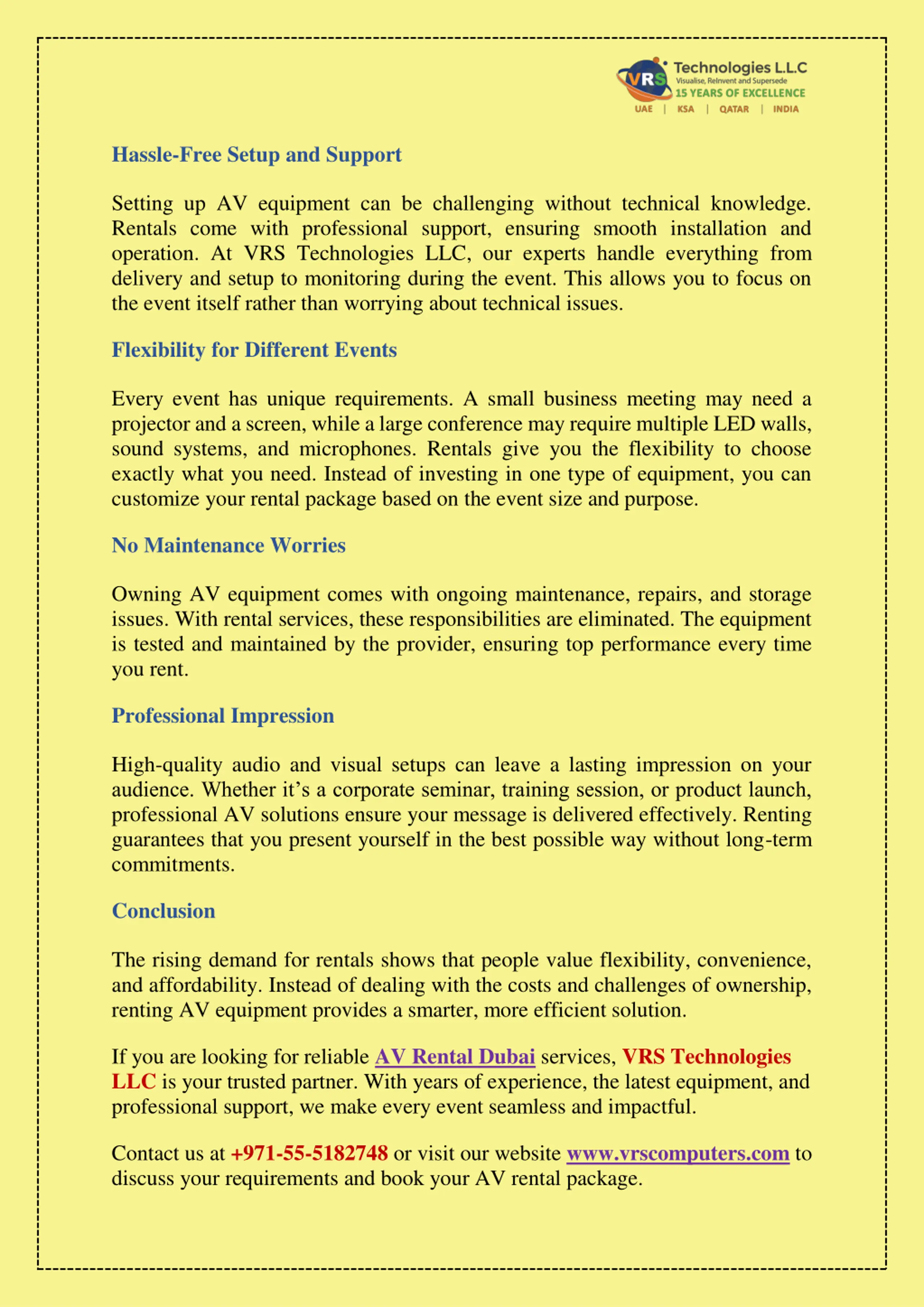 Hassle-Free Setup and Support Setting up AV equipment can be challenging without technical knowledge. Rentals come with professional support, ensuring smooth installation and operation. At VRS Technologies LLC, our experts handle everything from delivery and setup to monitoring during the event. This allows you to focus on the event itself rather than worrying about technical issues. Flexibility for Different Events Every event has unique requirements. A small business meeting may need a projector and a screen, while a large conference may require multiple LED walls, sound systems, and microphones. Rentals give you the flexibility to choose exactly what you need. Instead of investing in one type of equipment, you can customize your rental package based on the event size and purpose. No Maintenance Worries Owning AV equipment comes with ongoing maintenance, repairs, and storage issues. With rental services, these responsibilities are eliminated. The equipment is tested and maintained by the provider, ensuring top performance every time you rent. Professional Impression High-quality audio and visual setups can leave a lasting impression on your audience. Whether it s a corporate seminar, training session, or product launch, professional AV solutions ensure your message is delivered effectively. Renting guarantees that you present yourself in the best possible way without long-term commitments. Conclusion The rising demand for rentals shows that people value flexibility, convenience, and affordability. Instead of dealing with the costs and challenges of ownership, renting AV equipment provides a smarter, more efficient solution. If you are looking for reliable AV Rental Dubai services, VRS Technologies LLC is your trusted partner. With years of experience, the latest equipment, and professional support, we make every event seamless and impactful. Contact us at +971-55-5182748 or visit our website www.vrscomputers.com to discuss your requirements and book your AV rental package.