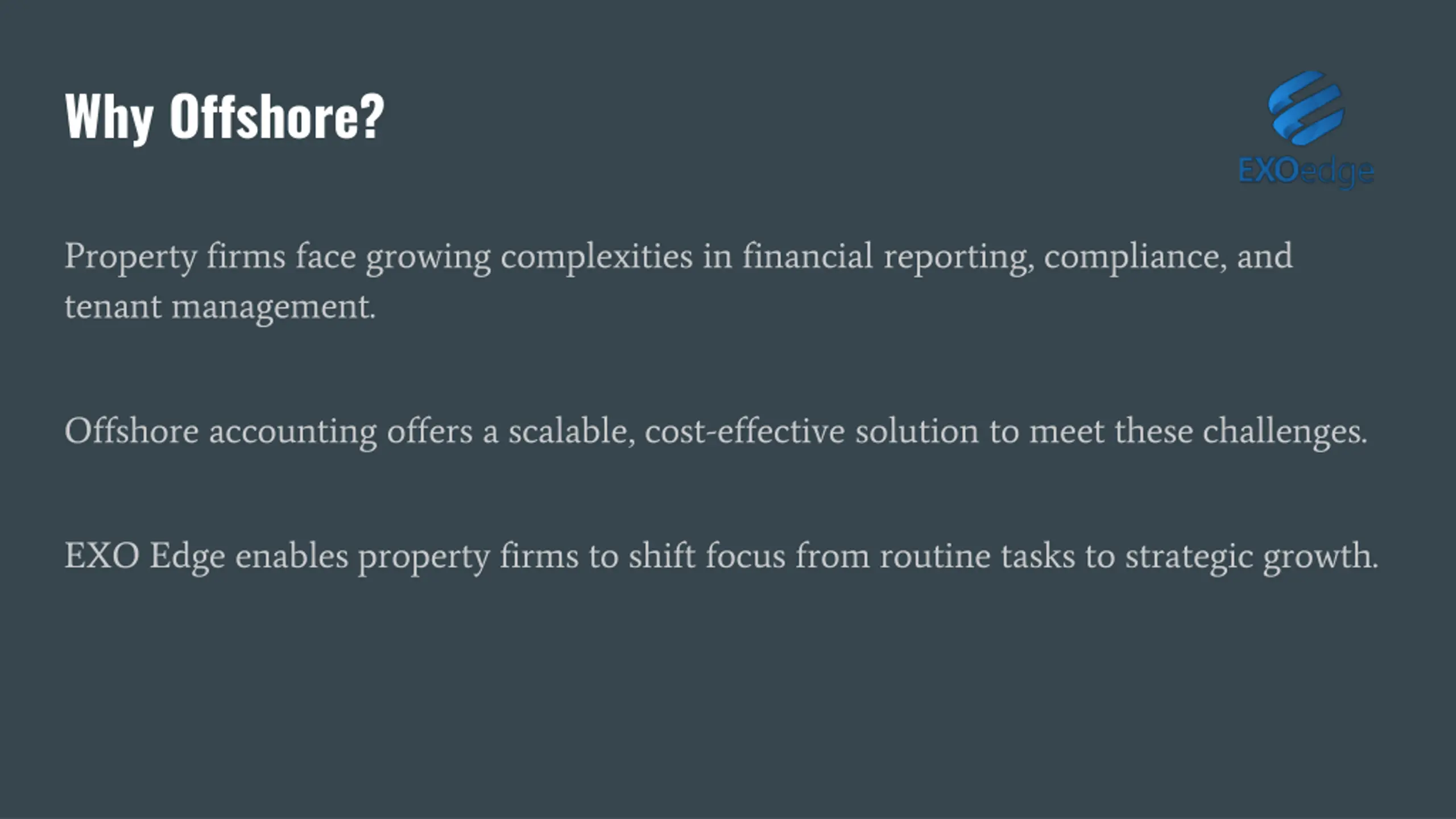Why Offshore? Property firms face growing complexities in financial reporting, compliance, and tenant management. Offshore accounting offers a scalable, cost-effective solution to meet these challenges. EXO Edge enables property firms to shift focus from routine tasks to strategic growth.