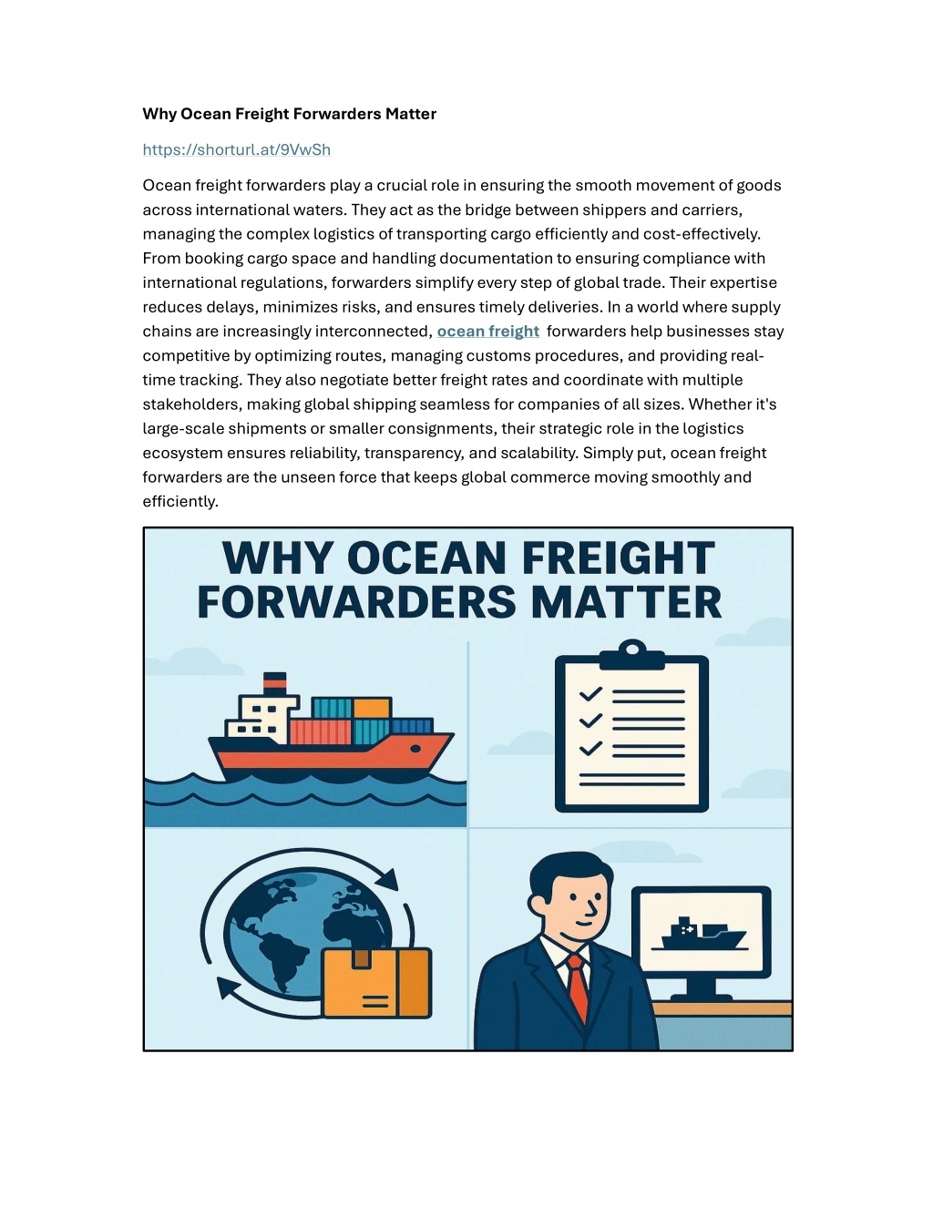 Why Ocean Freight Forwarders Matter https://shorturl.at/9VwSh Ocean freight forwarders play a crucial role in ensuring the smooth movement of goods across international waters. They act as the bridge between shippers and carriers, managing the complex logistics of transporting cargo e?iciently and cost-e?ectively. From booking cargo space and handling documentation to ensuring compliance with international regulations, forwarders simplify every step of global trade. Their expertise reduces delays, minimizes risks, and ensures timely deliveries. In a world where supply chains are increasingly interconnected, ocean freight forwarders help businesses stay competitive by optimizing routes, managing customs procedures, and providing real- time tracking. They also negotiate better freight rates and coordinate with multiple stakeholders, making global shipping seamless for companies of all sizes. Whether it's large-scale shipments or smaller consignments, their strategic role in the logistics ecosystem ensures reliability, transparency, and scalability. Simply put, ocean freight forwarders are the unseen force that keeps global commerce moving smoothly and e?iciently.