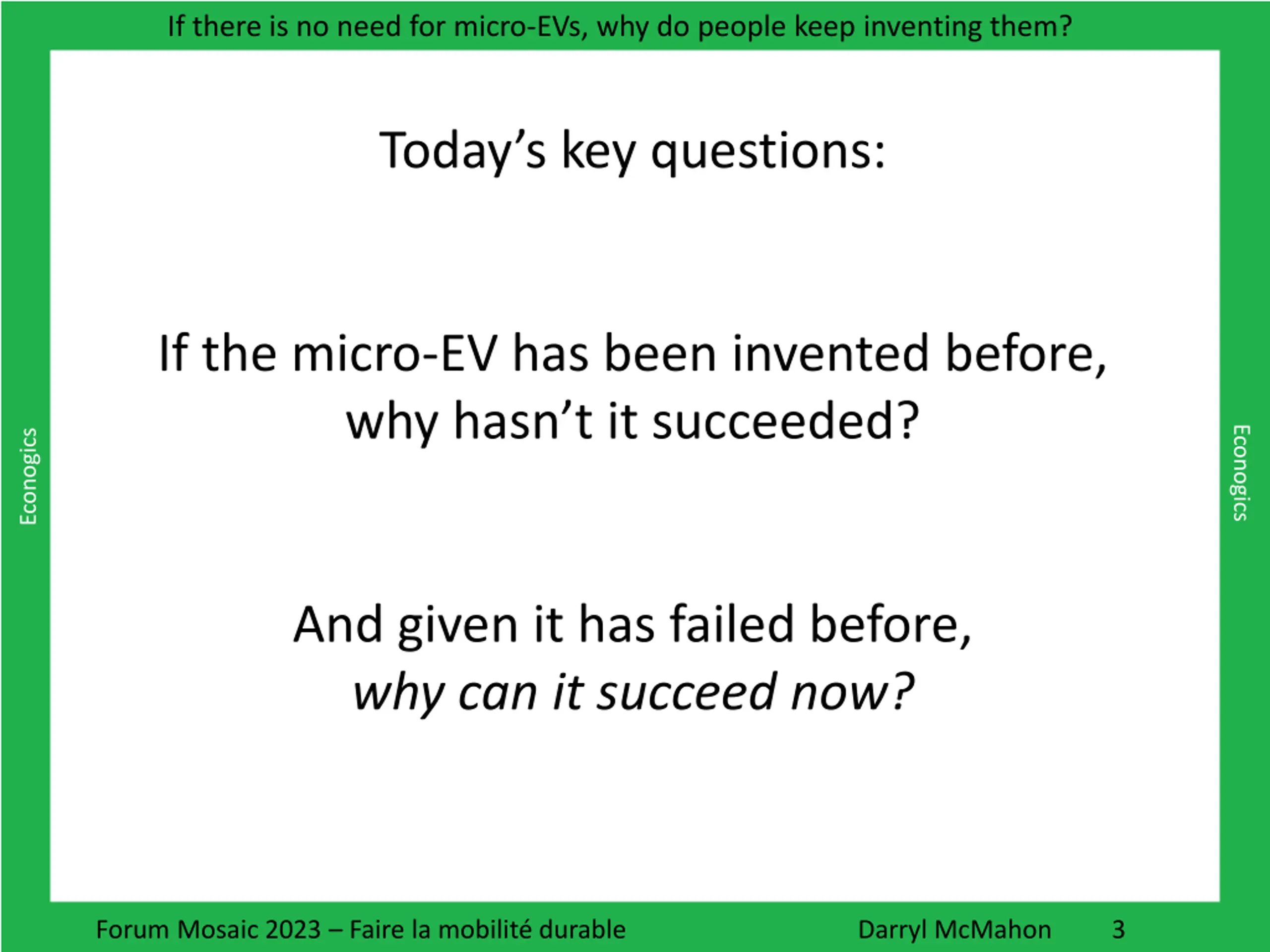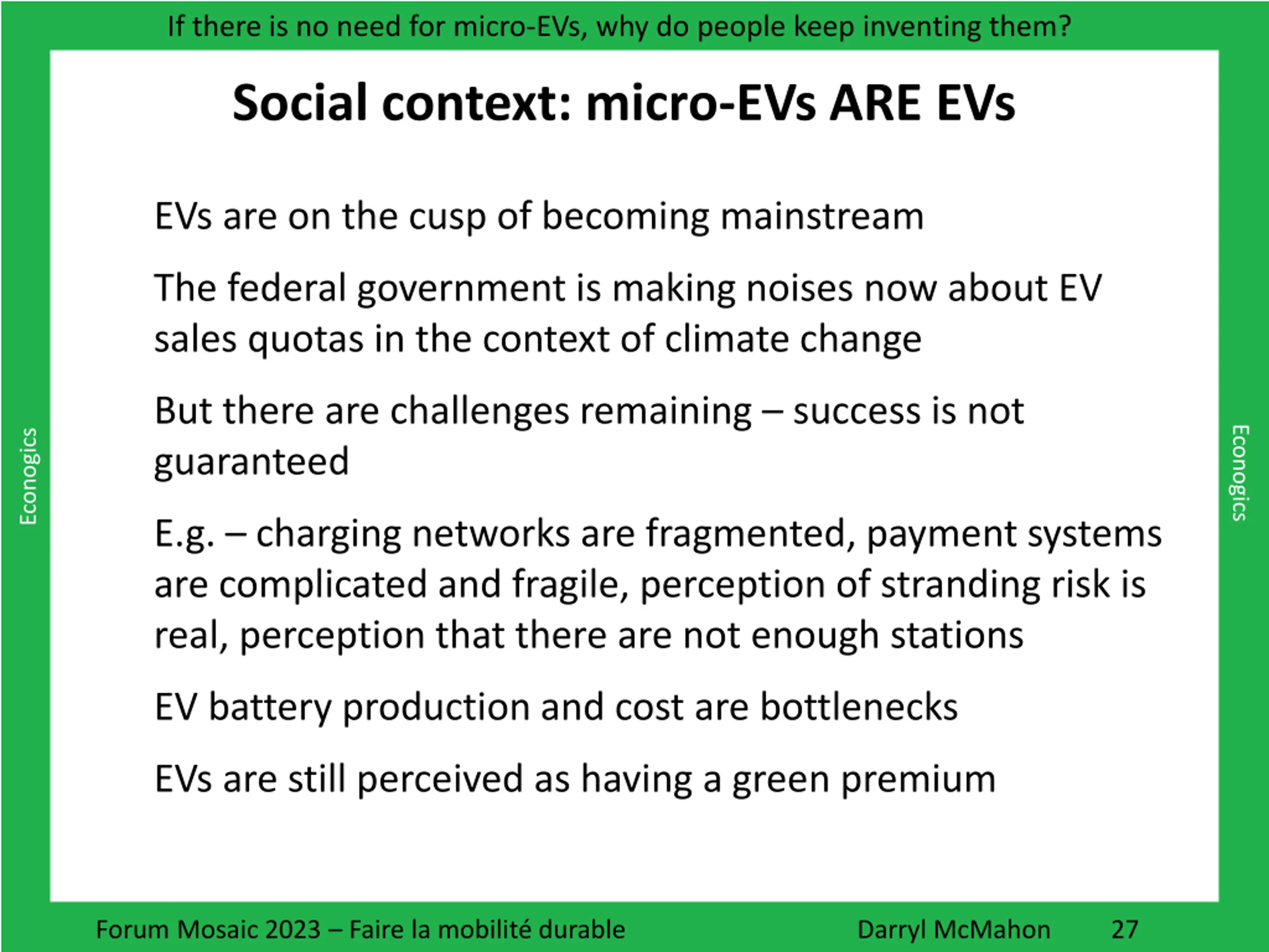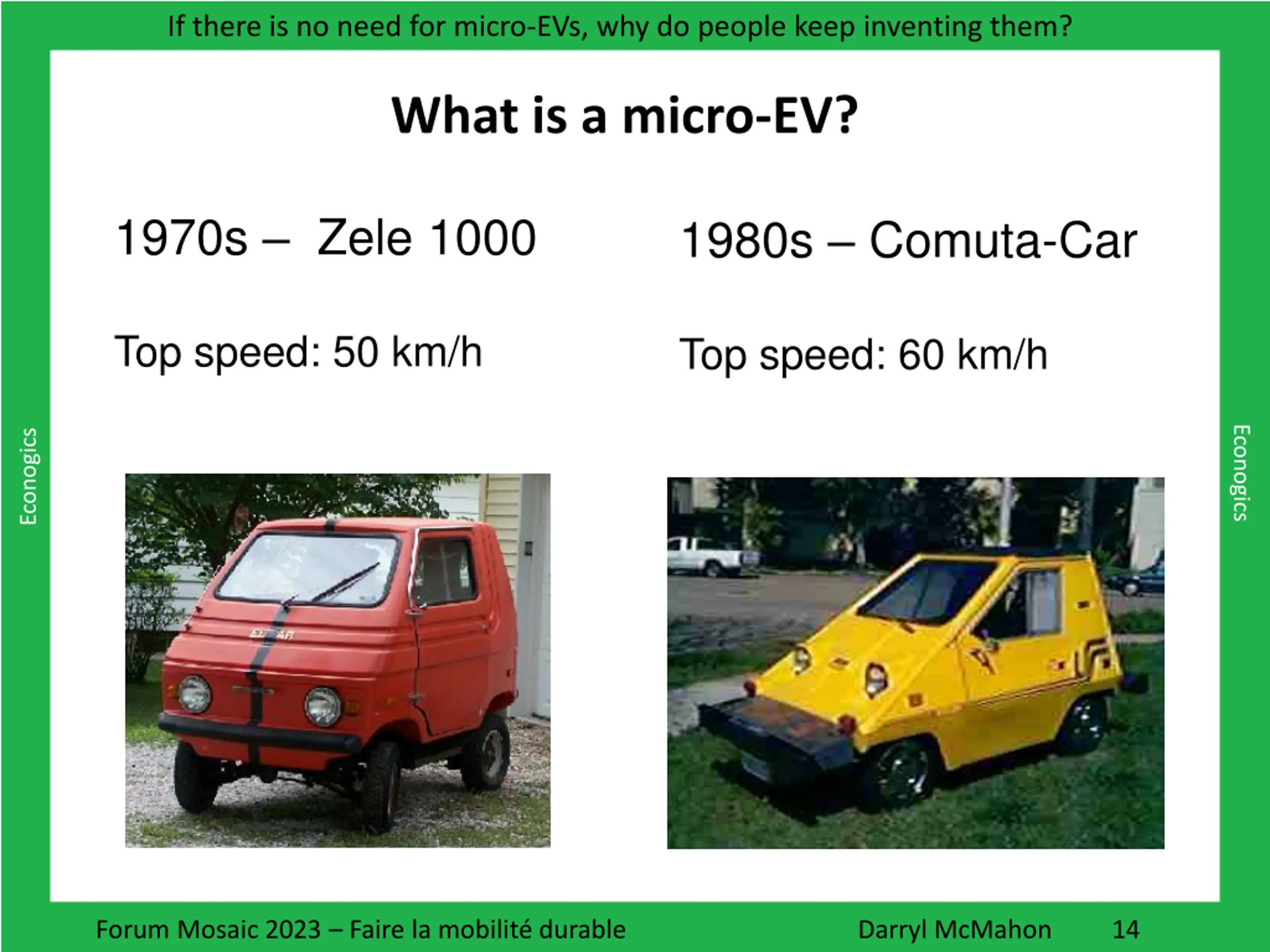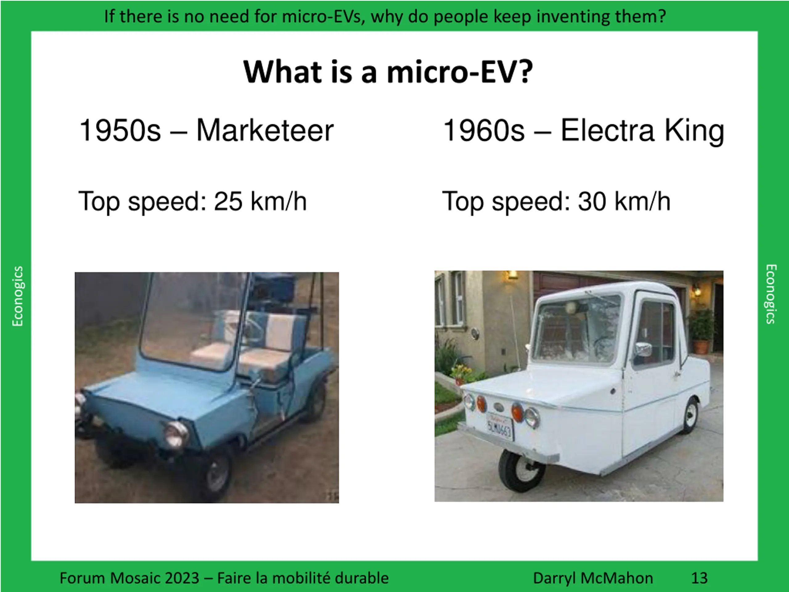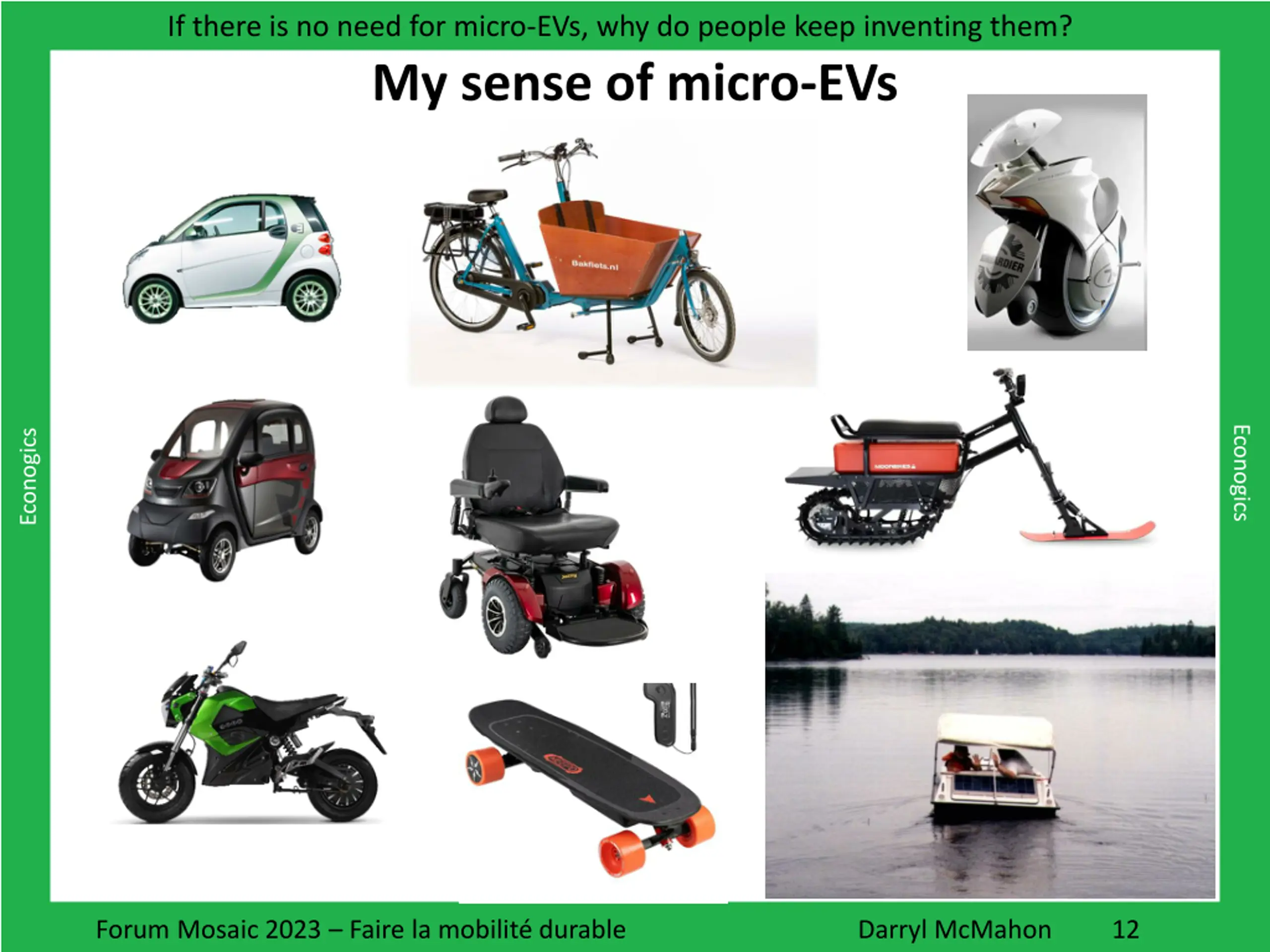 If there is no need for micro-EVs, why do people keep inventing them? My sense of micro-EVs Econogics Econogics Forum Mosaic 2023 Faire la mobilit durable Darryl McMahon 12