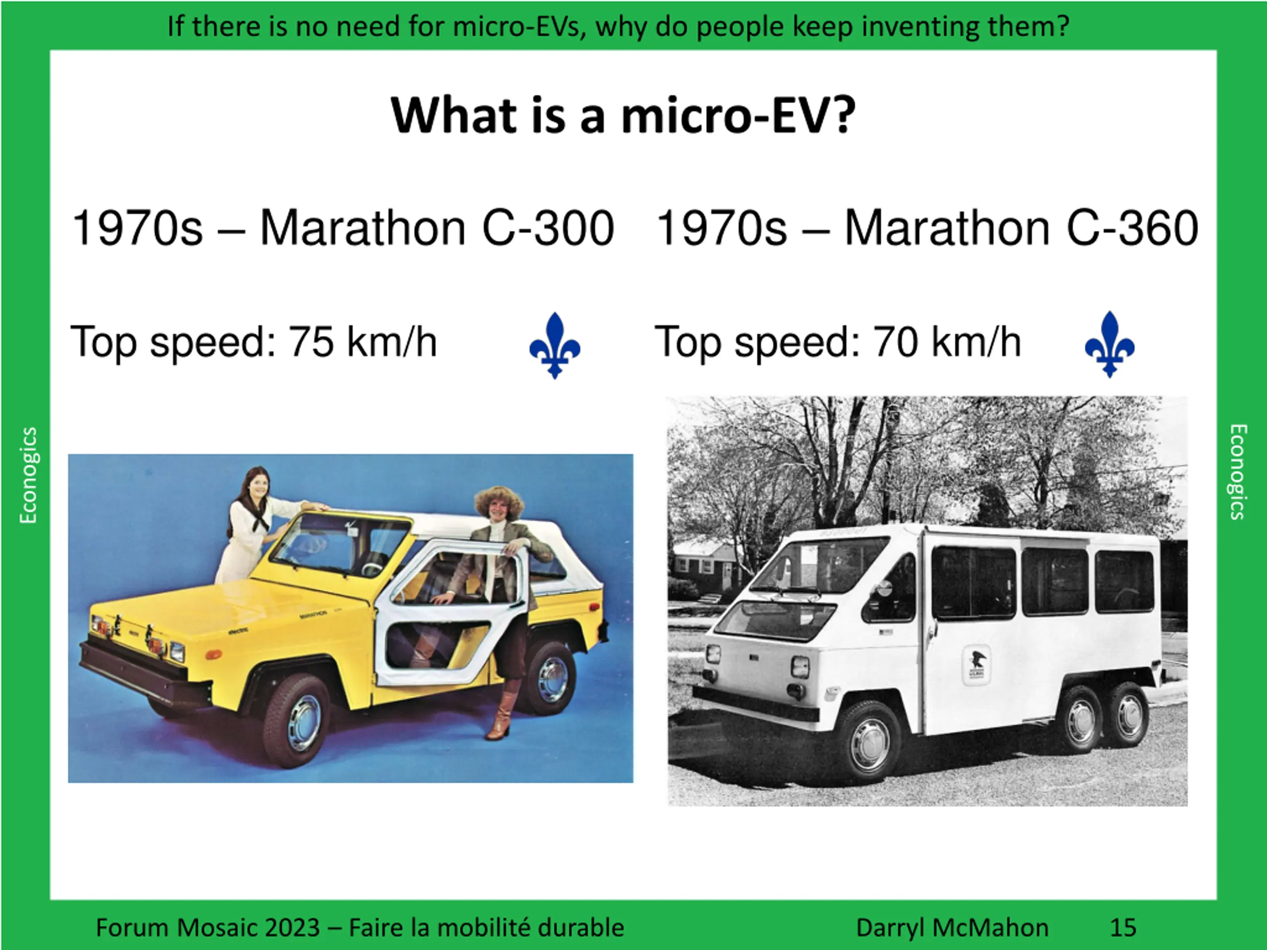 If there is no need for micro-EVs, why do people keep inventing them? What is a micro-EV? 1970s Marathon C-300 1970s Marathon C-360 Top speed: 75 km/h Top speed: 70 km/h Econogics Econogics Forum Mosaic 2023 Faire la mobilit durable Darryl McMahon 15