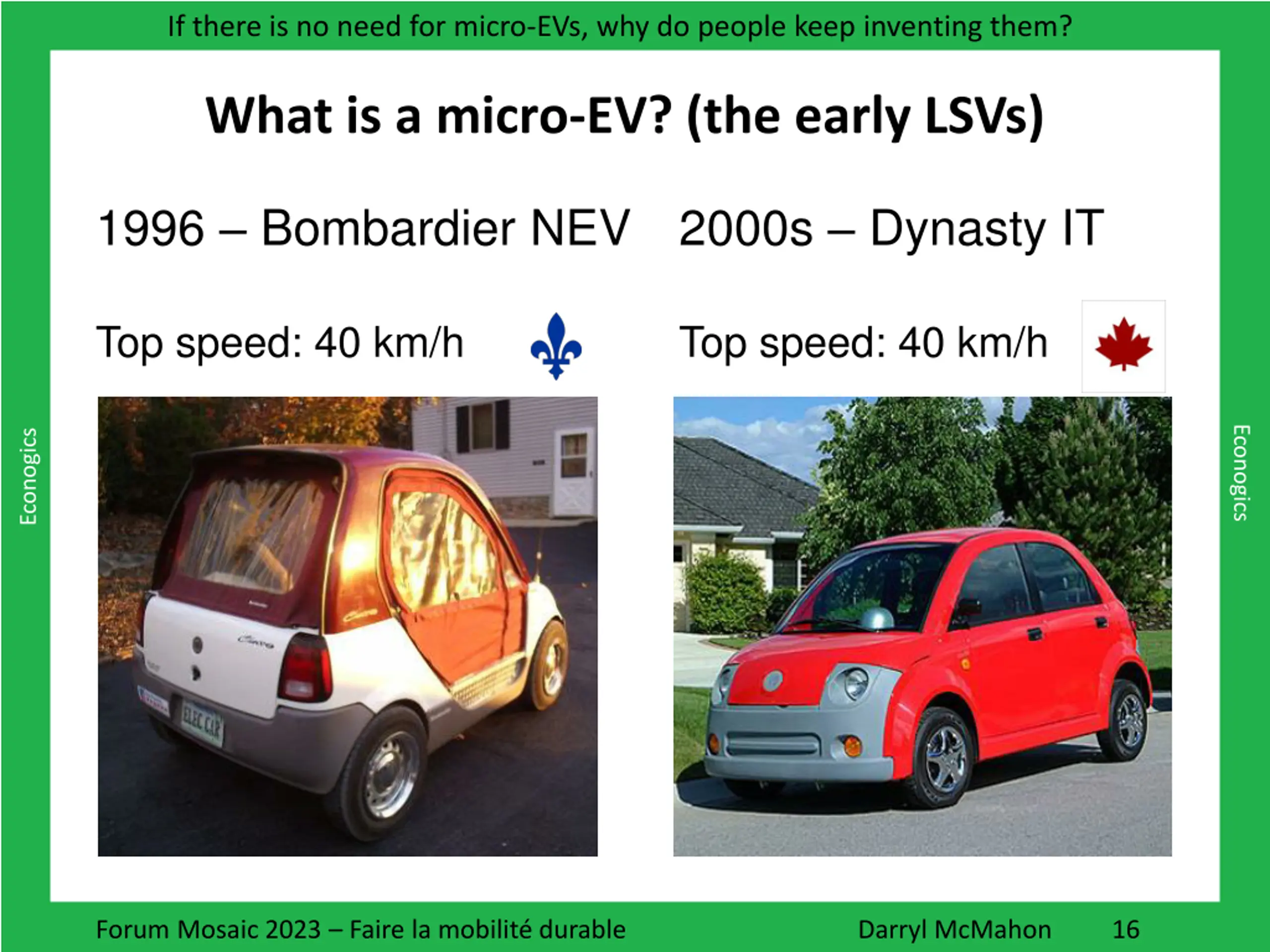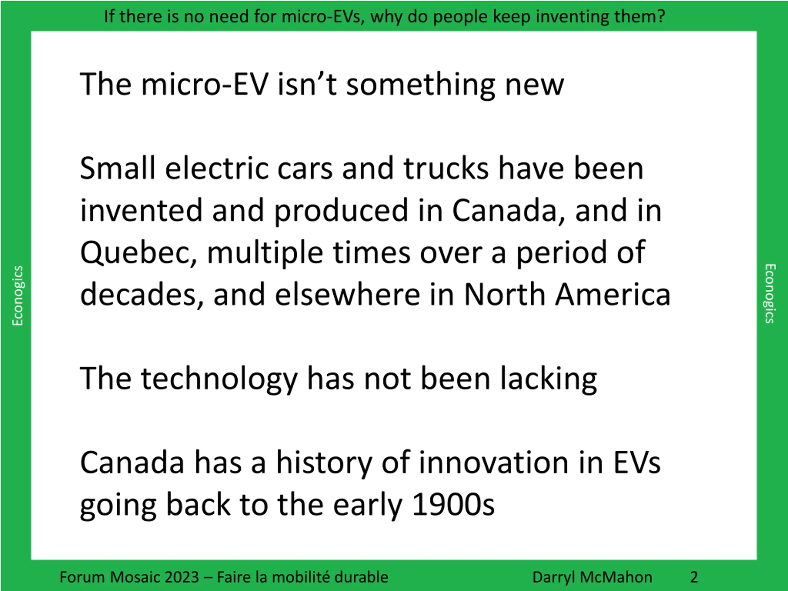 If there is no need for micro-EVs, why do people keep inventing them? The micro-EV isn t something new Small electric cars and trucks have been invented and produced in Canada, and in Quebec, multiple times over a period of decades, and elsewhere in North America Econogics Econogics The technology has not been lacking Canada has a history of innovation in EVs going back to the early 1900s Forum Mosaic 2023 Faire la mobilit durable Darryl McMahon 2