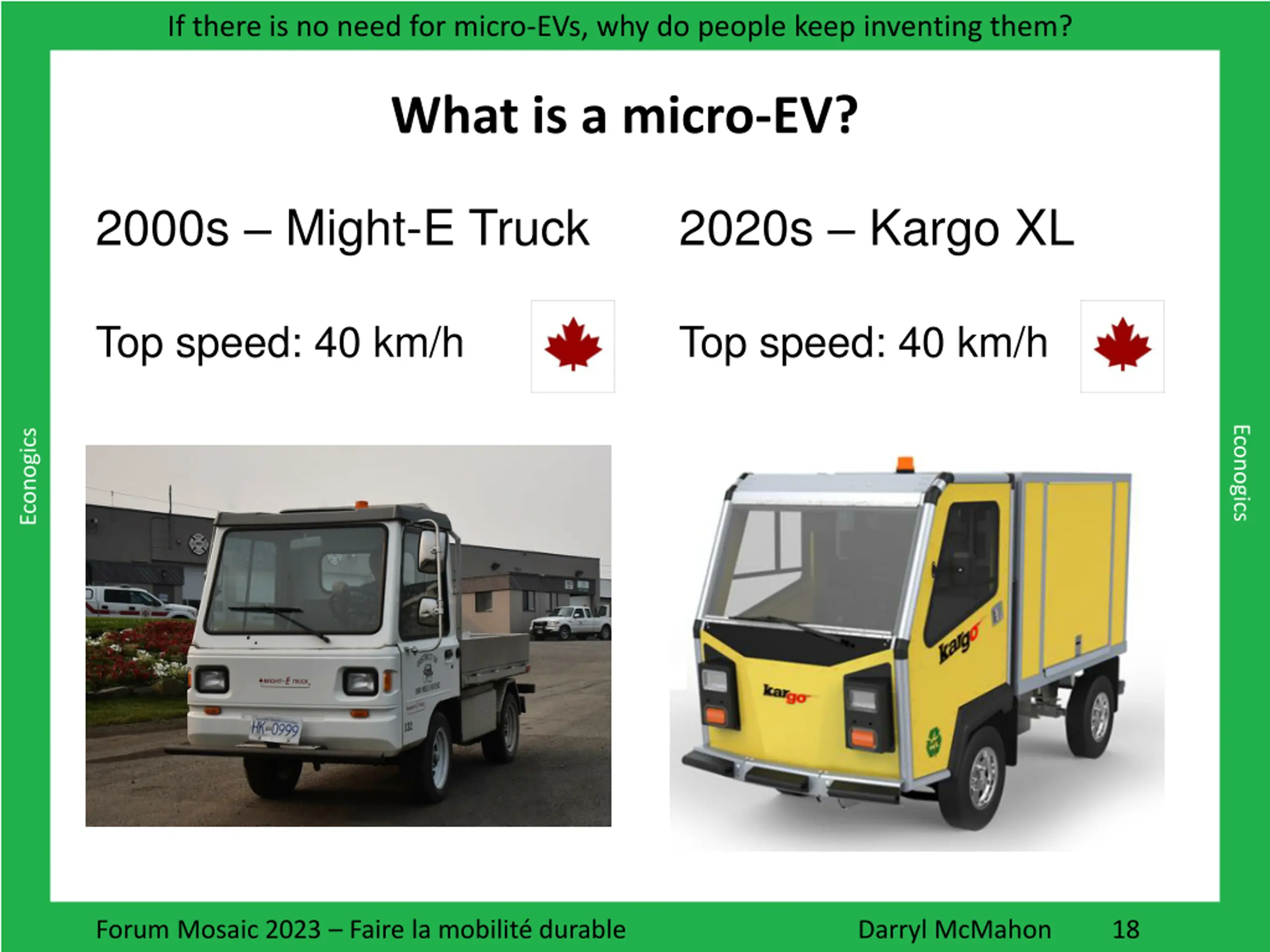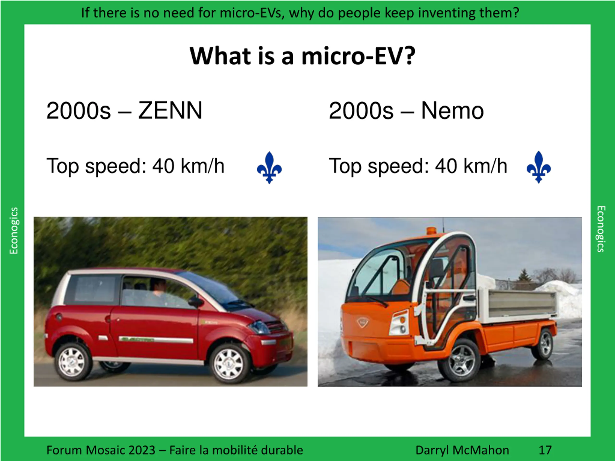 If there is no need for micro-EVs, why do people keep inventing them? What is a micro-EV? 2000s ZENN 2000s Nemo Top speed: 40 km/h Top speed: 40 km/h Econogics Econogics Forum Mosaic 2023 Faire la mobilit durable Darryl McMahon 17