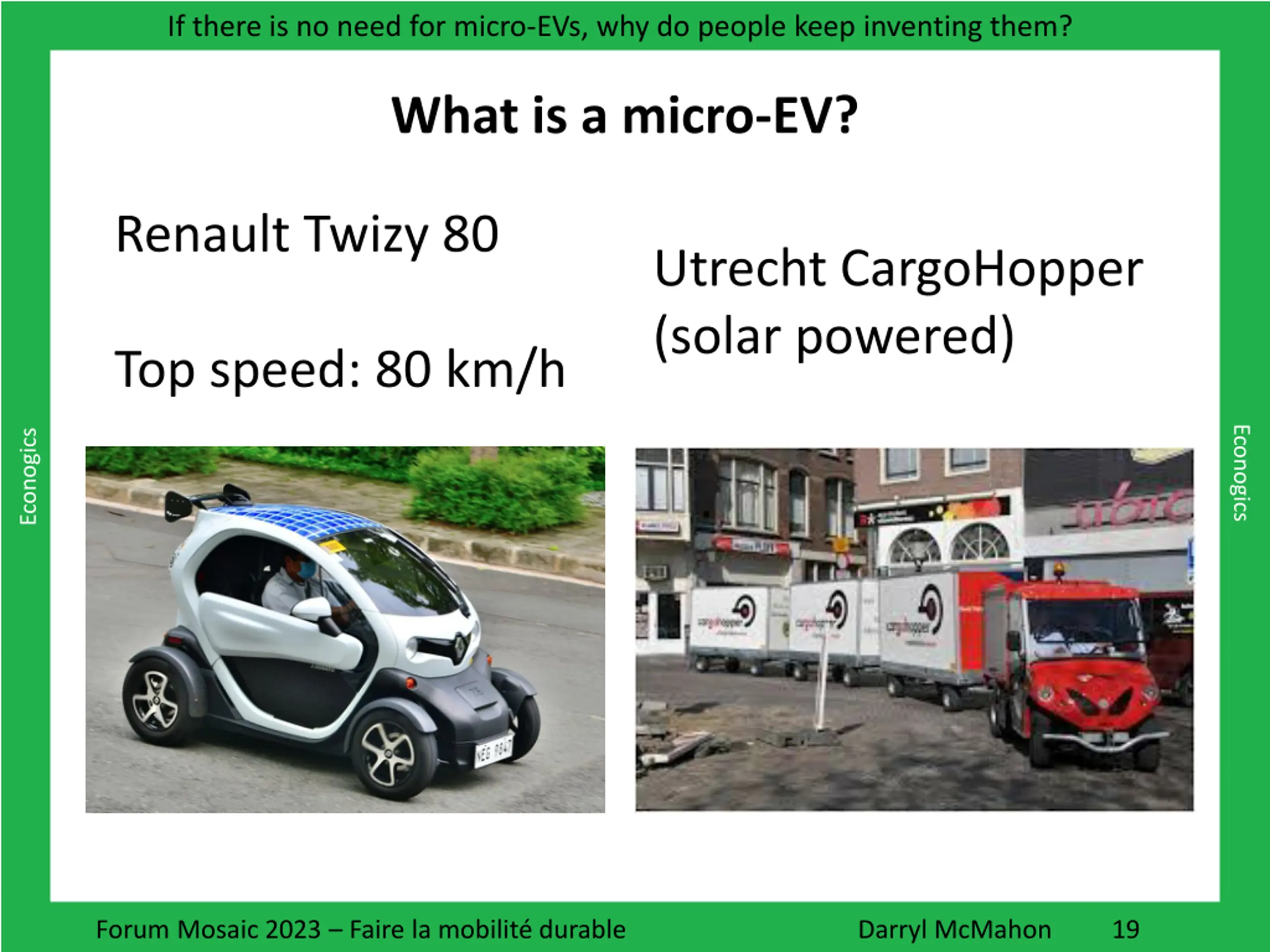 If there is no need for micro-EVs, why do people keep inventing them? What is a micro-EV? Renault Twizy 80 Utrecht CargoHopper (solar powered) Top speed: 80 km/h Econogics Econogics Forum Mosaic 2023 Faire la mobilit durable Darryl McMahon 19