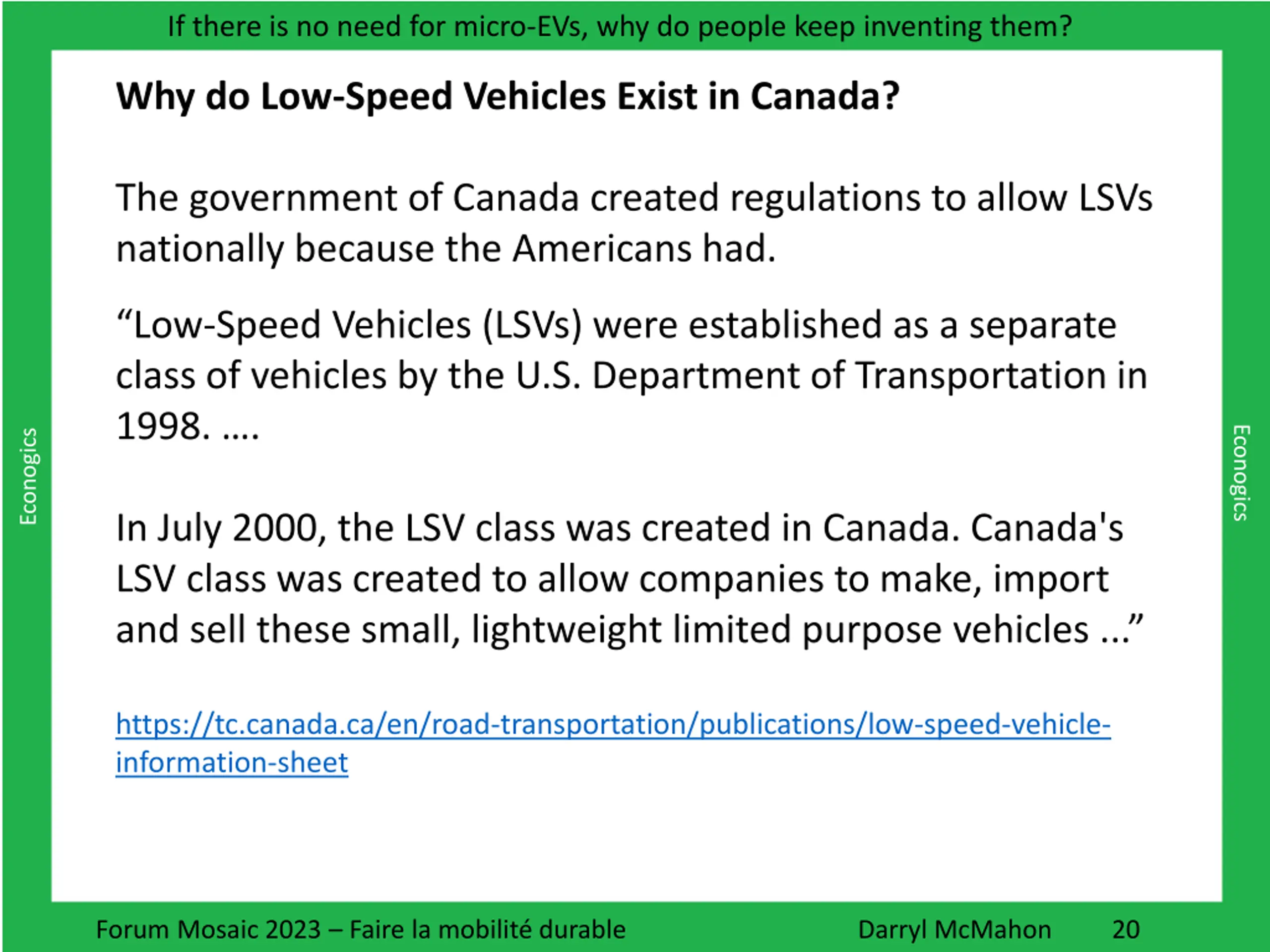 If there is no need for micro-EVs, why do people keep inventing them? Why do Low-Speed Vehicles Exist in Canada? The government of Canada created regulations to allow LSVs nationally because the Americans had. Low-Speed Vehicles (LSVs) were established as a separate class of vehicles by the U.S. Department of Transportation in 1998. . Econogics Econogics In July 2000, the LSV class was created in Canada. Canada's LSV class was created to allow companies to make, import and sell these small, lightweight limited purpose vehicles ... https://tc.canada.ca/en/road-transportation/publications/low-speed-vehicle- information-sheet Forum Mosaic 2023 Faire la mobilit durable Darryl McMahon 20