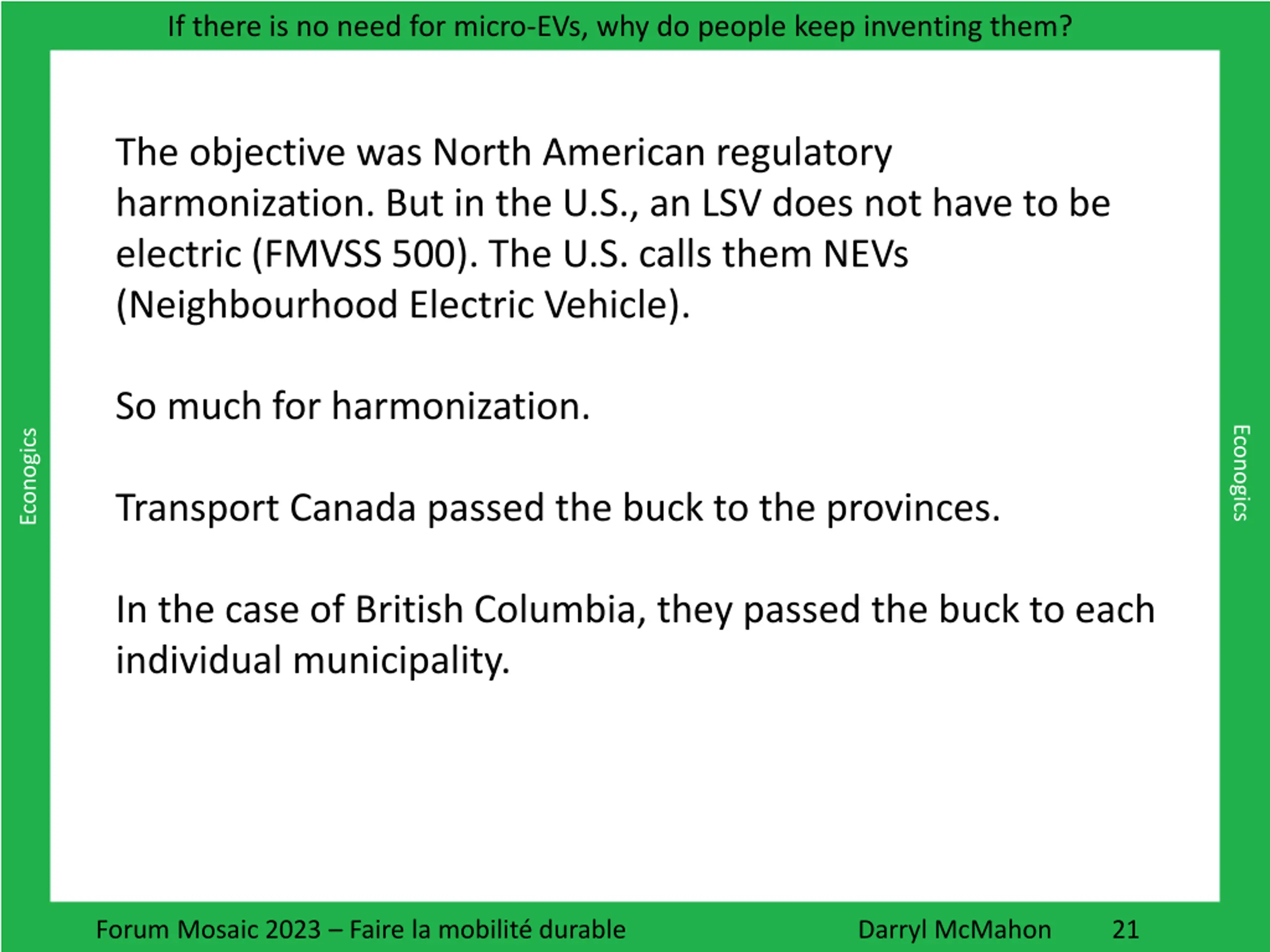 If there is no need for micro-EVs, why do people keep inventing them? The objective was North American regulatory harmonization. But in the U.S., an LSV does not have to be electric (FMVSS 500). The U.S. calls them NEVs (Neighbourhood Electric Vehicle). So much for harmonization. Econogics Econogics Transport Canada passed the buck to the provinces. In the case of British Columbia, they passed the buck to each individual municipality. Forum Mosaic 2023 Faire la mobilit durable Darryl McMahon 21