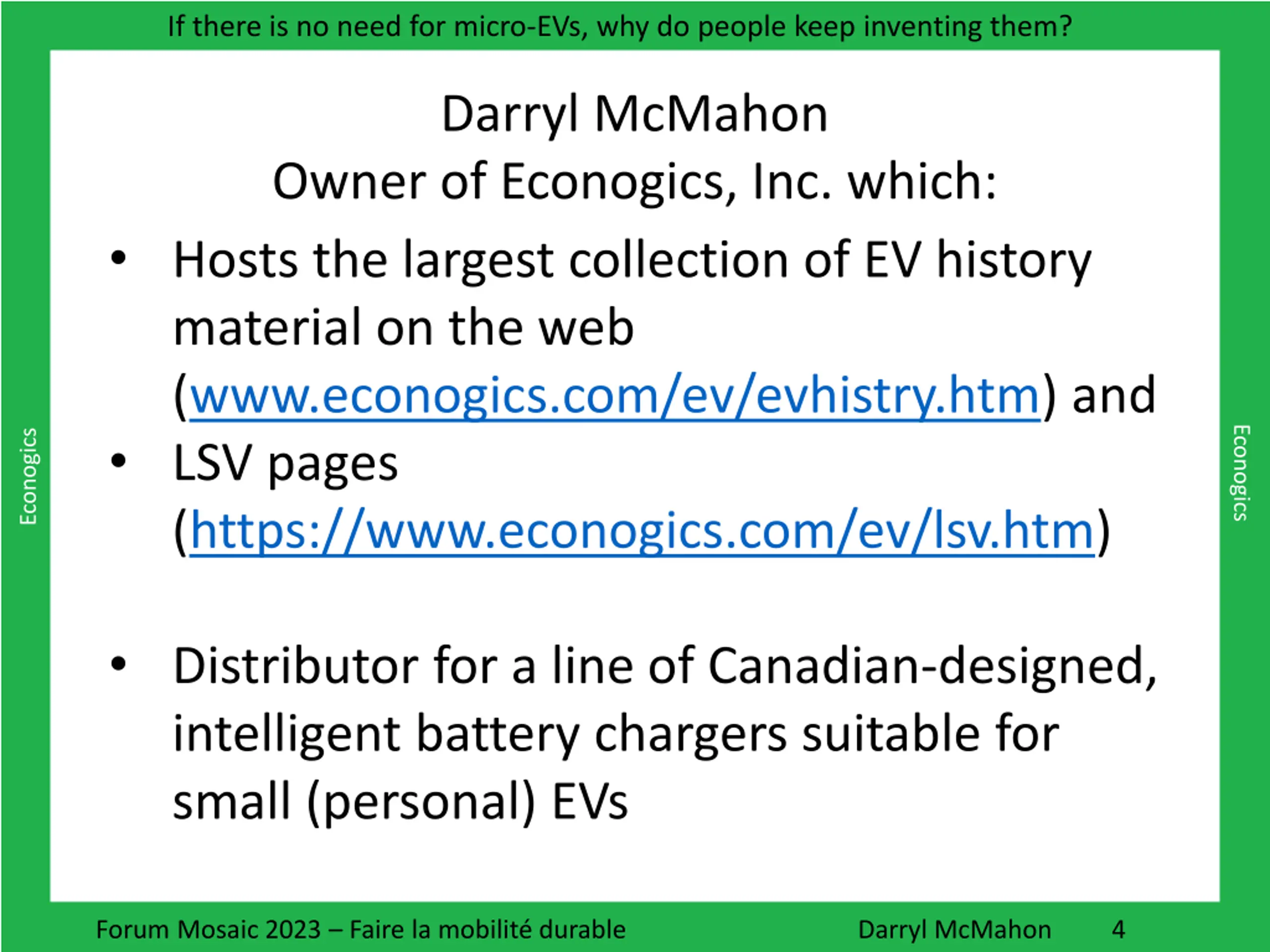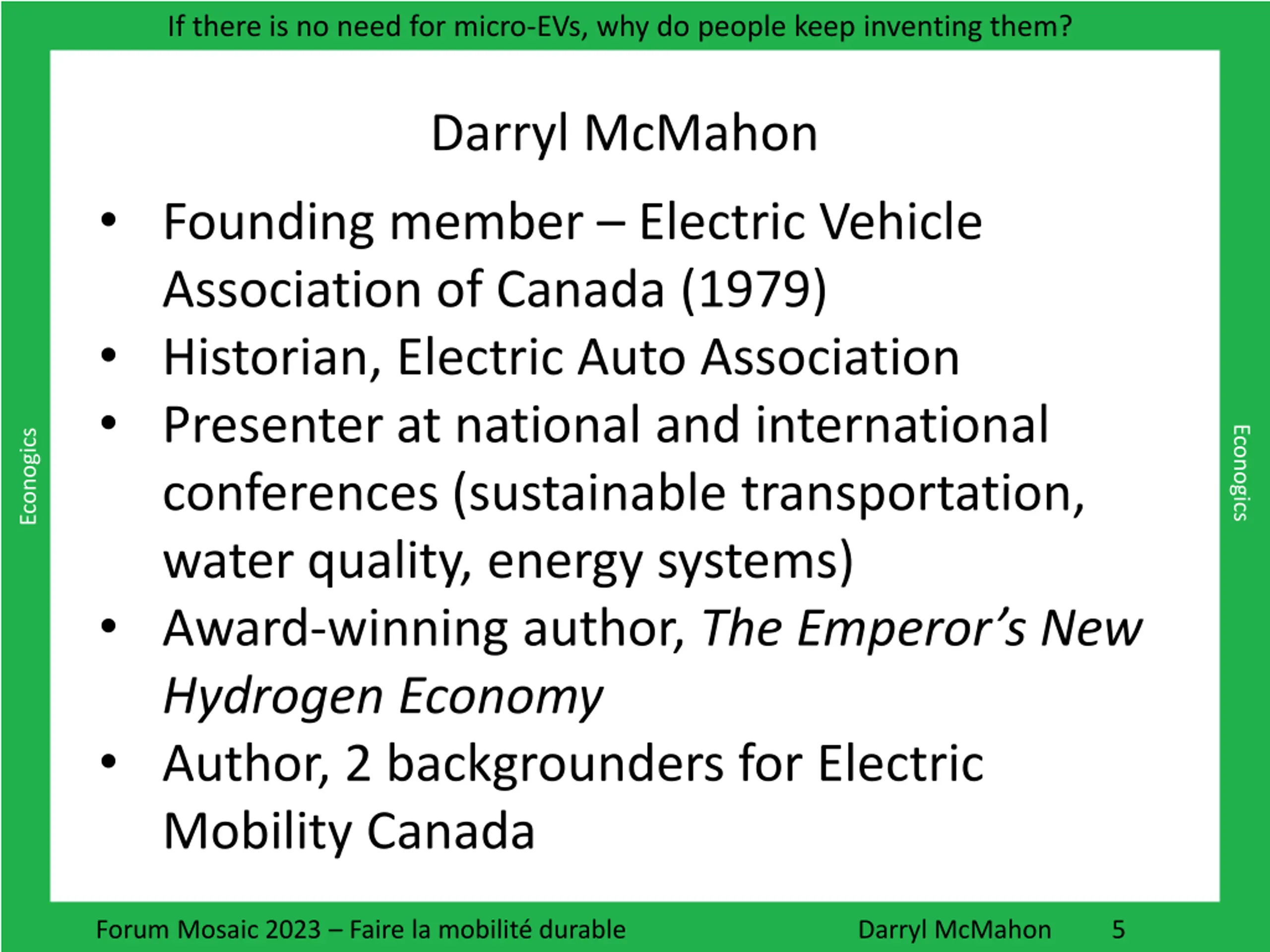 If there is no need for micro-EVs, why do people keep inventing them? Darryl McMahon Owner of Econogics, Inc. which: Hosts the largest collection of EV history material on the web (www.econogics.com/ev/evhistry.htm) and LSV pages (https://www.econogics.com/ev/lsv.htm) Econogics Econogics Distributor for a line of Canadian-designed, intelligent battery chargers suitable for small (personal) EVs Forum Mosaic 2023 Faire la mobilit durable Darryl McMahon 4