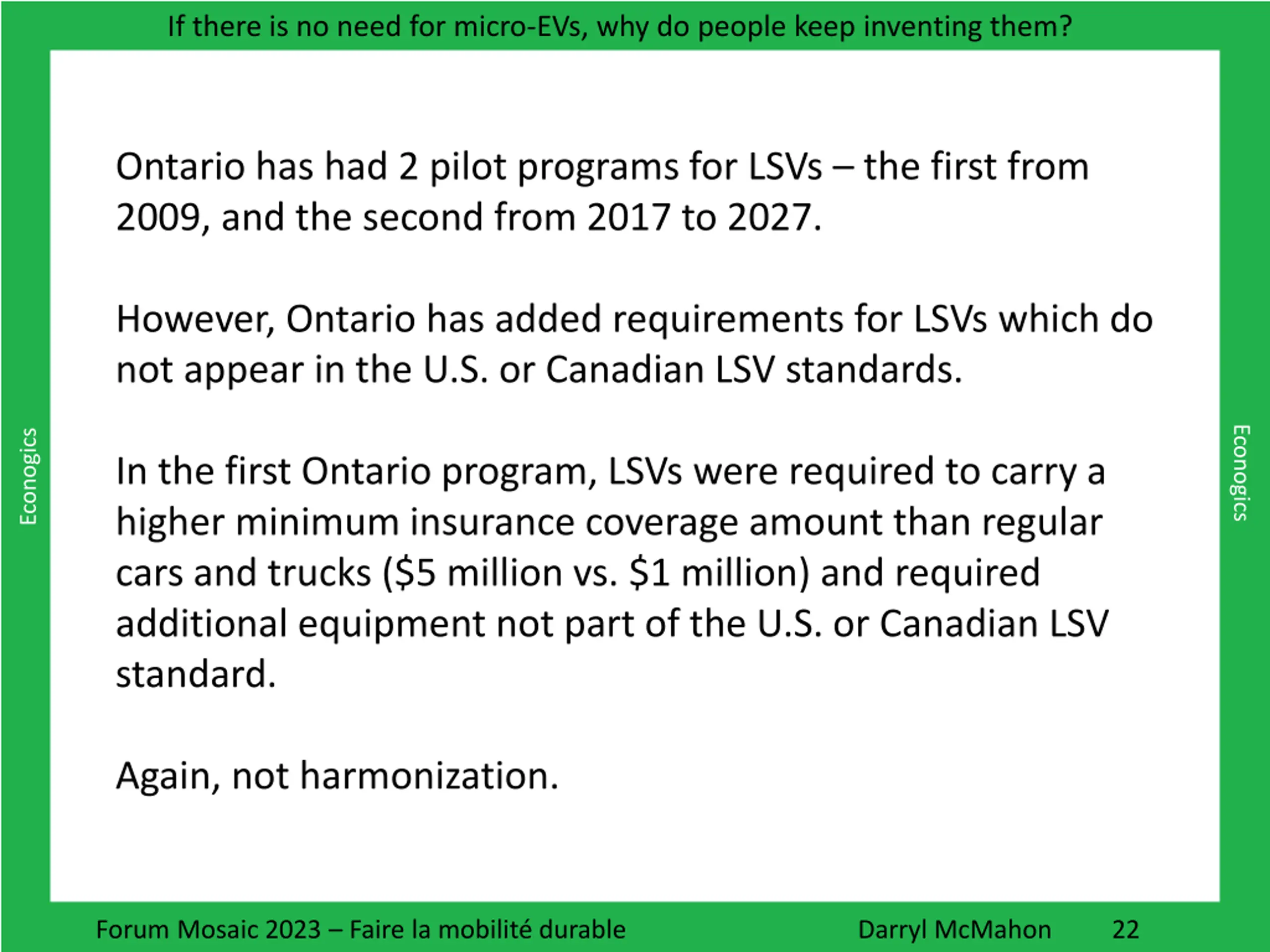 If there is no need for micro-EVs, why do people keep inventing them? Ontario has had 2 pilot programs for LSVs the first from 2009, and the second from 2017 to 2027. However, Ontario has added requirements for LSVs which do not appear in the U.S. or Canadian LSV standards. Econogics Econogics In the first Ontario program, LSVs were required to carry a higher minimum insurance coverage amount than regular cars and trucks ($5 million vs. $1 million) and required additional equipment not part of the U.S. or Canadian LSV standard. Again, not harmonization. Forum Mosaic 2023 Faire la mobilit durable Darryl McMahon 22