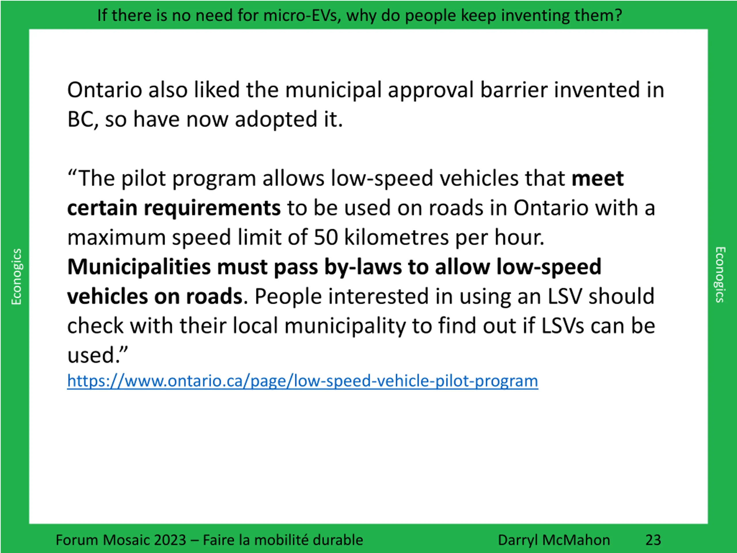 If there is no need for micro-EVs, why do people keep inventing them? Ontario also liked the municipal approval barrier invented in BC, so have now adopted it. The pilot program allows low-speed vehicles that meet certain requirements to be used on roads in Ontario with a maximum speed limit of 50 kilometres per hour. Municipalities must pass by-laws to allow low-speed vehicles on roads. People interested in using an LSV should check with their local municipality to find out if LSVs can be used. https://www.ontario.ca/page/low-speed-vehicle-pilot-program Econogics Econogics Forum Mosaic 2023 Faire la mobilit durable Darryl McMahon 23