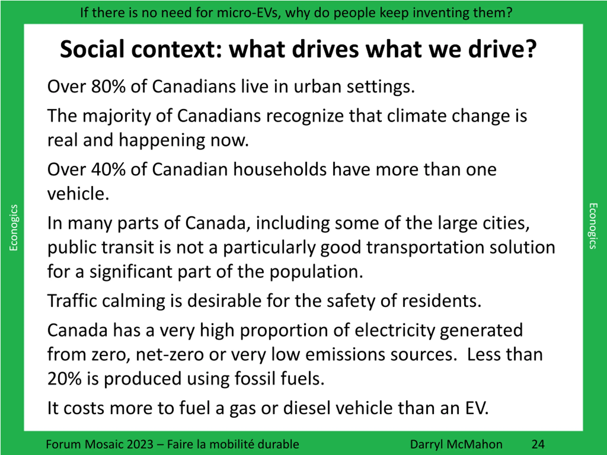 If there is no need for micro-EVs, why do people keep inventing them? Social context: what drives what we drive? Over 80% of Canadians live in urban settings. The majority of Canadians recognize that climate change is real and happening now. Over 40% of Canadian households have more than one vehicle. In many parts of Canada, including some of the large cities, public transit is not a particularly good transportation solution for a significant part of the population. Traffic calming is desirable for the safety of residents. Canada has a very high proportion of electricity generated from zero, net-zero or very low emissions sources. Less than 20% is produced using fossil fuels. It costs more to fuel a gas or diesel vehicle than an EV. Econogics Econogics Forum Mosaic 2023 Faire la mobilit durable Darryl McMahon 24