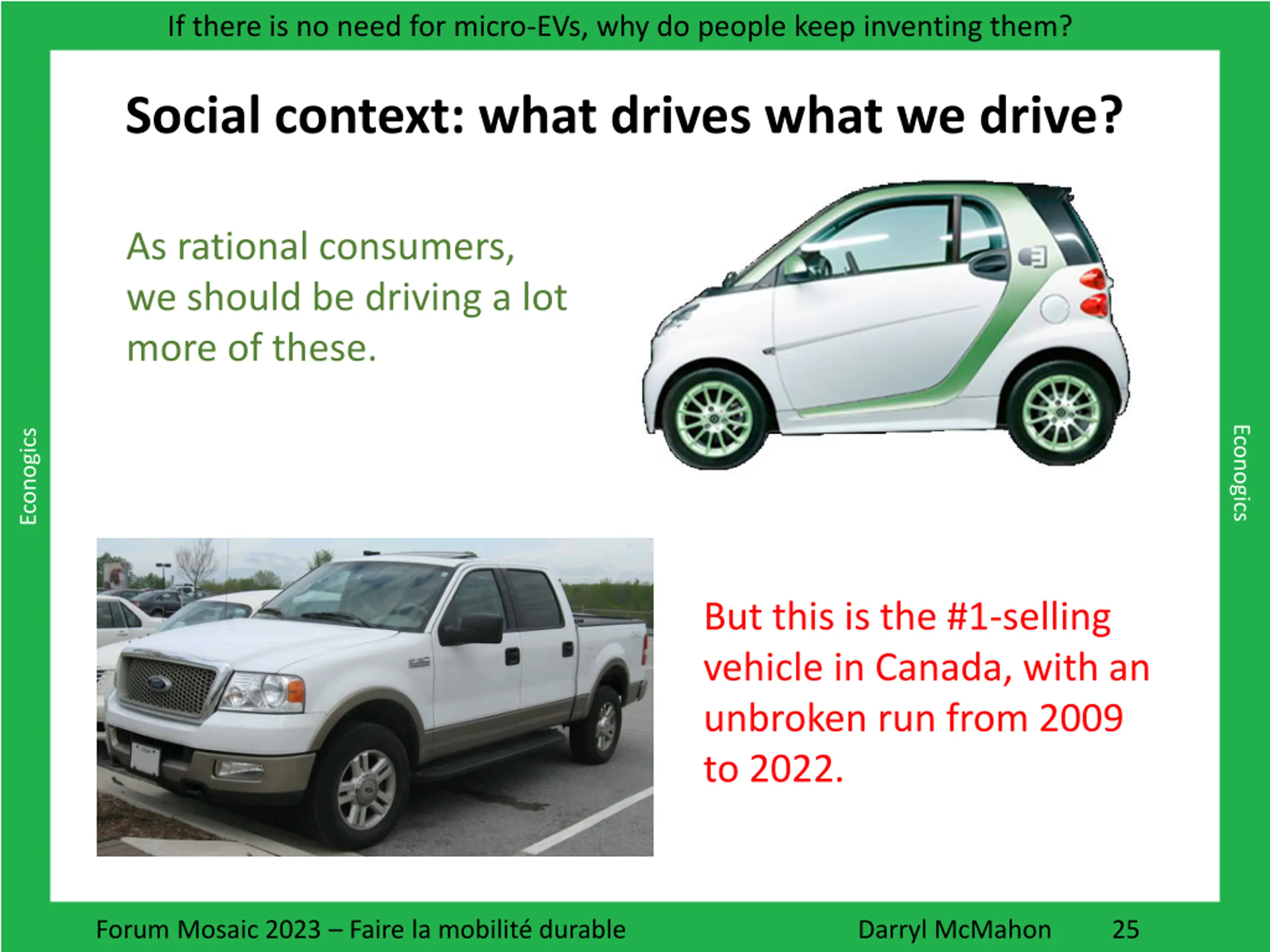 If there is no need for micro-EVs, why do people keep inventing them? Social context: what drives what we drive? As rational consumers, we should be driving a lot more of these. Econogics Econogics But this is the #1-selling vehicle in Canada, with an unbroken run from 2009 to 2022. Forum Mosaic 2023 Faire la mobilit durable Darryl McMahon 25