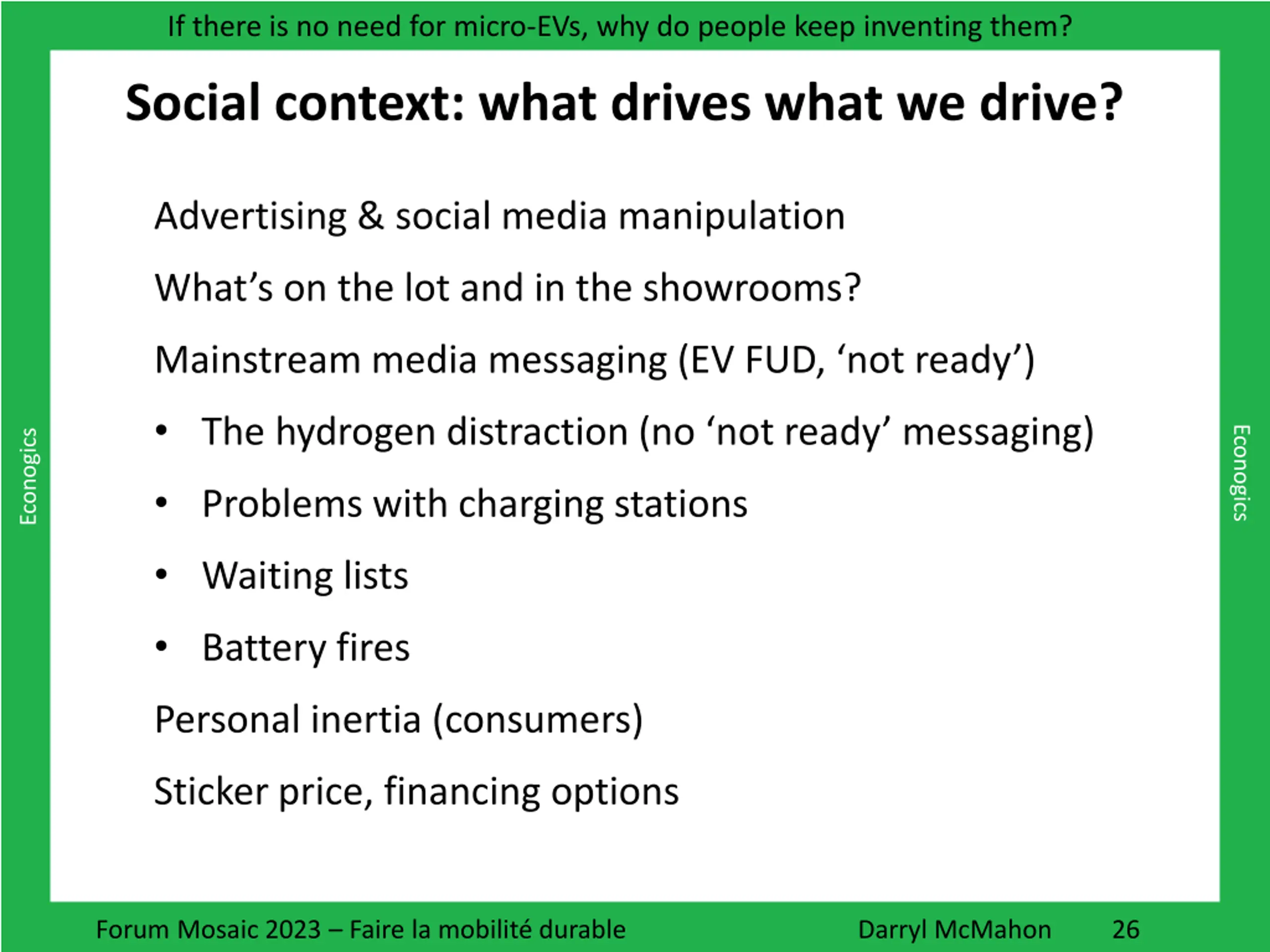 If there is no need for micro-EVs, why do people keep inventing them? Social context: what drives what we drive? Advertising & social media manipulation What s on the lot and in the showrooms? Mainstream media messaging (EV FUD, not ready ) The hydrogen distraction (no not ready messaging) Econogics Econogics Problems with charging stations Waiting lists Battery fires Personal inertia (consumers) Sticker price, financing options Forum Mosaic 2023 Faire la mobilit durable Darryl McMahon 26