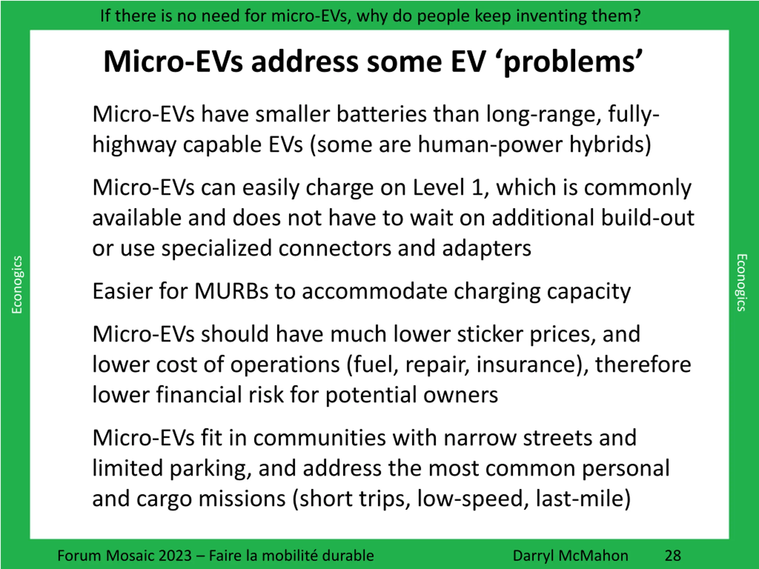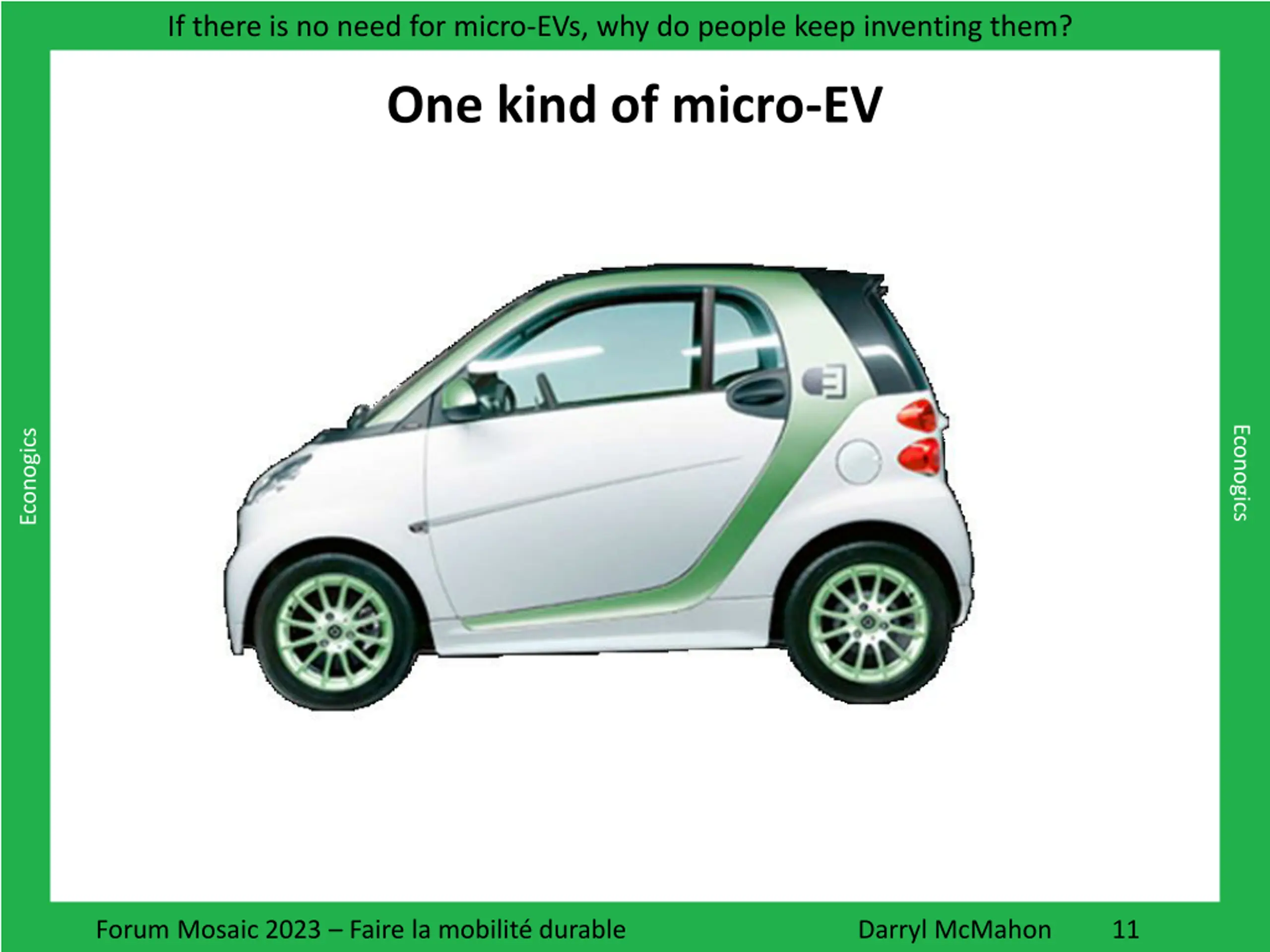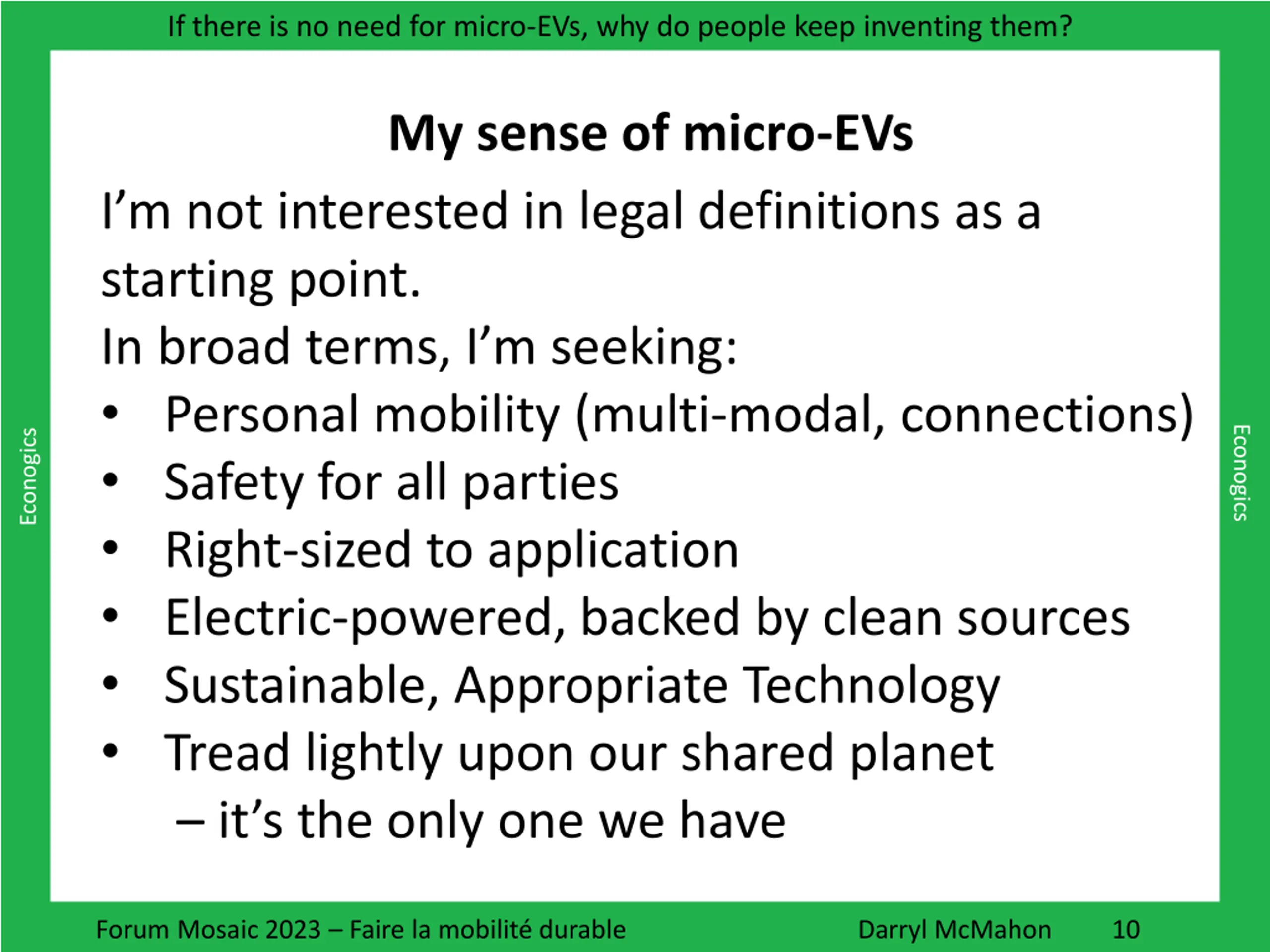If there is no need for micro-EVs, why do people keep inventing them? My sense of micro-EVs I m not interested in legal definitions as a starting point. In broad terms, I m seeking: Personal mobility (multi-modal, connections) Safety for all parties Right-sized to application Electric-powered, backed by clean sources Sustainable, Appropriate Technology Tread lightly upon our shared planet it s the only one we have Econogics Econogics Forum Mosaic 2023 Faire la mobilit durable Darryl McMahon 10