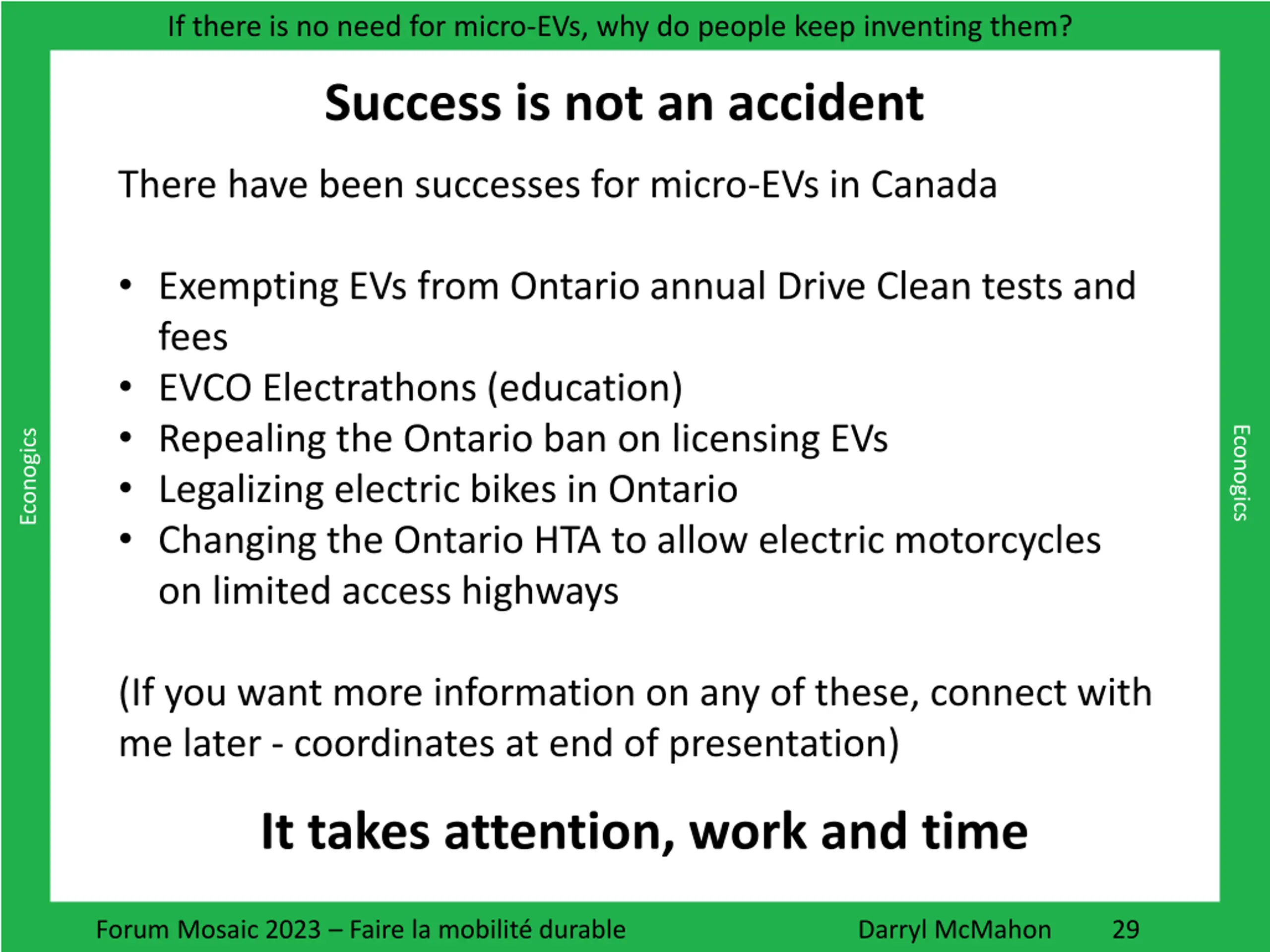 If there is no need for micro-EVs, why do people keep inventing them? Success is not an accident There have been successes for micro-EVs in Canada Exempting EVs from Ontario annual Drive Clean tests and fees EVCO Electrathons (education) Repealing the Ontario ban on licensing EVs Legalizing electric bikes in Ontario Changing the Ontario HTA to allow electric motorcycles on limited access highways Econogics Econogics (If you want more information on any of these, connect with me later - coordinates at end of presentation) It takes attention, work and time Forum Mosaic 2023 Faire la mobilit durable Darryl McMahon 29