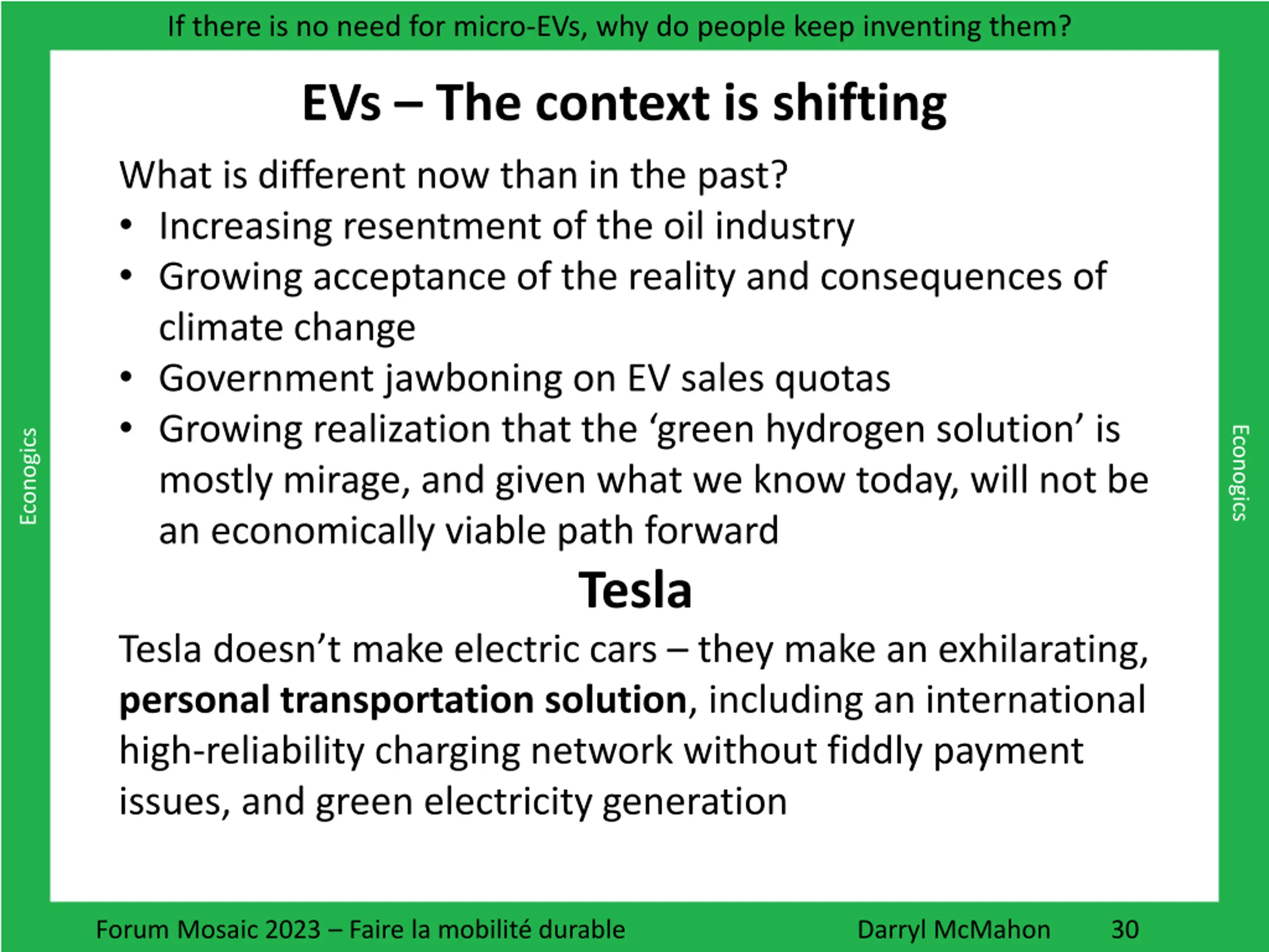 If there is no need for micro-EVs, why do people keep inventing them? EVs The context is shifting What is different now than in the past? Increasing resentment of the oil industry Growing acceptance of the reality and consequences of climate change Government jawboning on EV sales quotas Growing realization that the green hydrogen solution is mostly mirage, and given what we know today, will not be an economically viable path forward Tesla Tesla doesn t make electric cars they make an exhilarating, personal transportation solution, including an international high-reliability charging network without fiddly payment issues, and green electricity generation Econogics Econogics Forum Mosaic 2023 Faire la mobilit durable Darryl McMahon 30