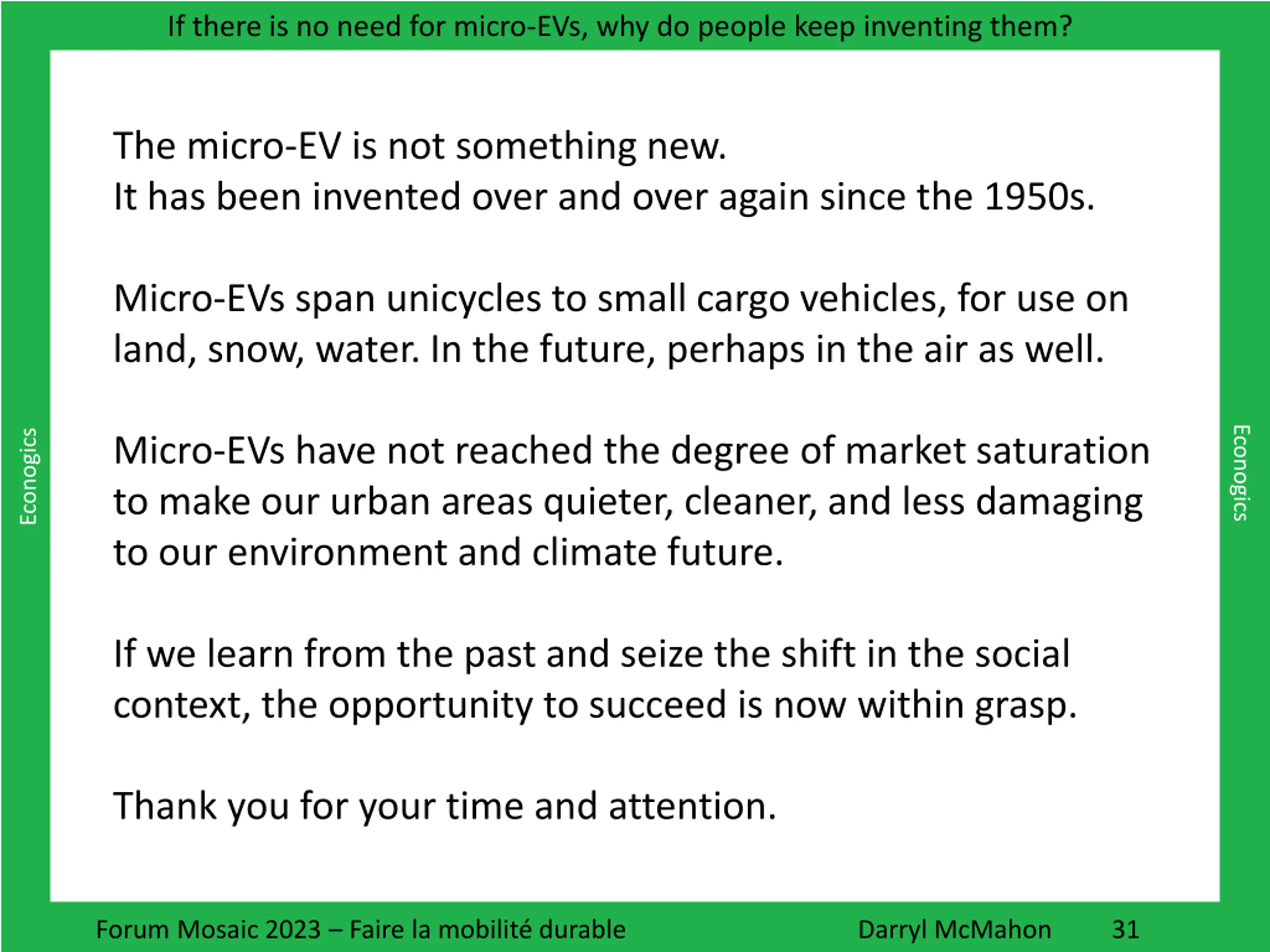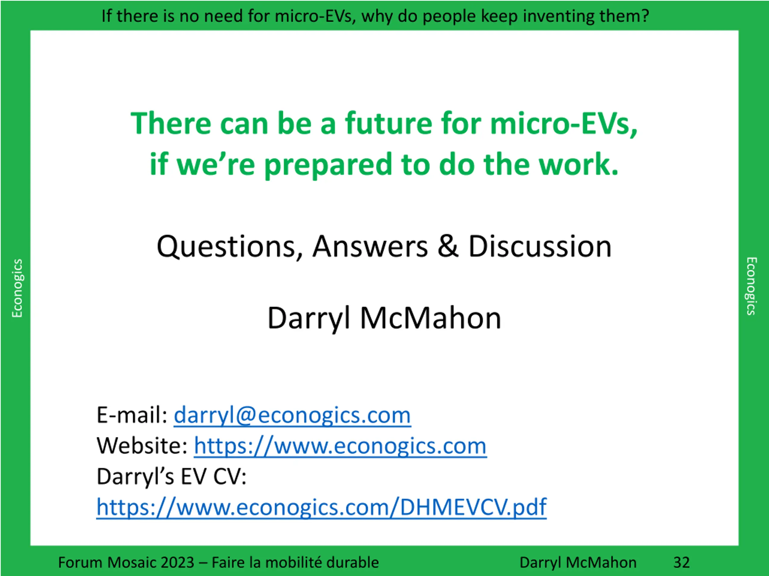 If there is no need for micro-EVs, why do people keep inventing them? The micro-EV is not something new. It has been invented over and over again since the 1950s. Micro-EVs span unicycles to small cargo vehicles, for use on land, snow, water. In the future, perhaps in the air as well. Econogics Econogics Micro-EVs have not reached the degree of market saturation to make our urban areas quieter, cleaner, and less damaging to our environment and climate future. If we learn from the past and seize the shift in the social context, the opportunity to succeed is now within grasp. Thank you for your time and attention. Forum Mosaic 2023 Faire la mobilit durable Darryl McMahon 31