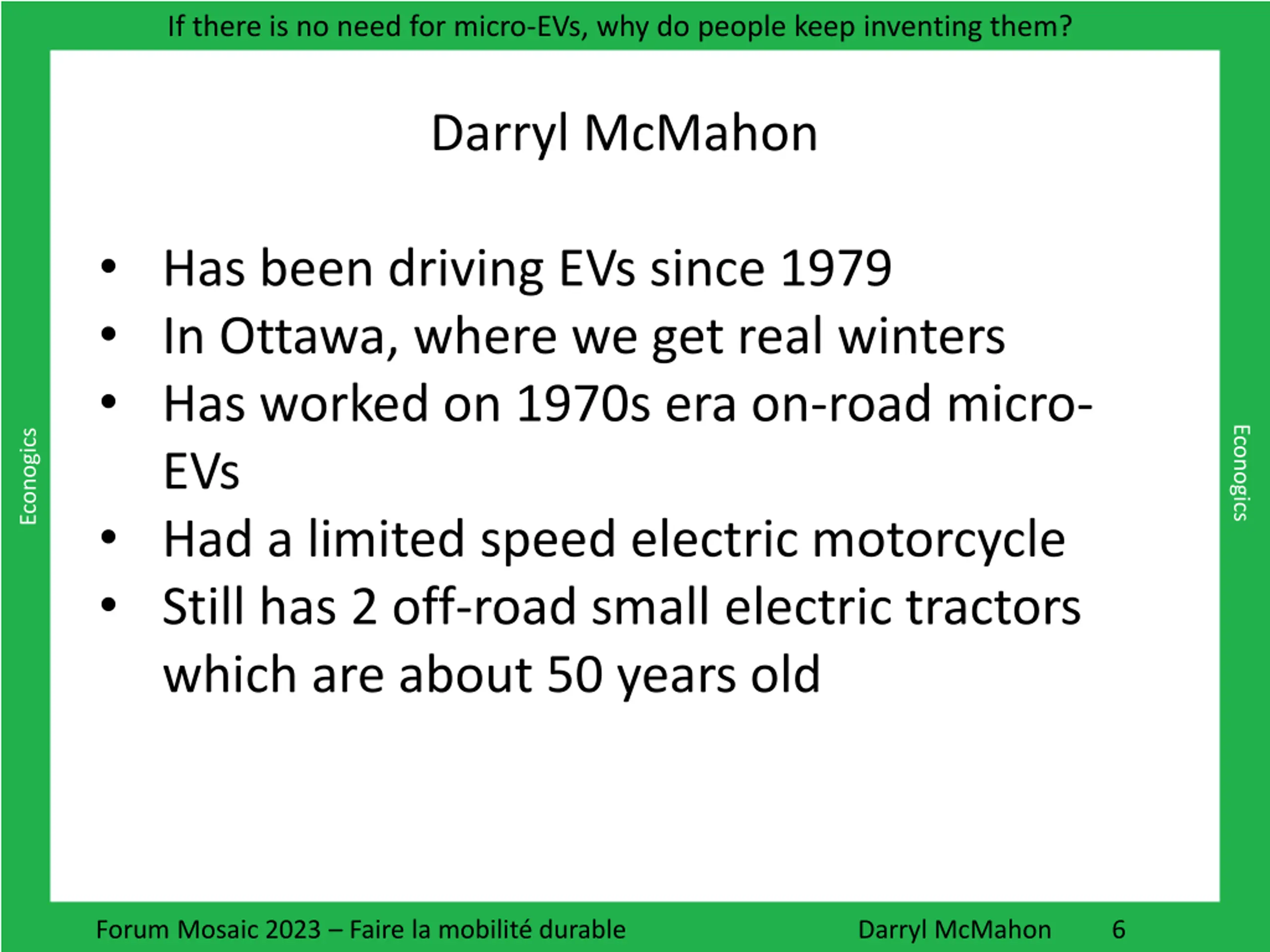 If there is no need for micro-EVs, why do people keep inventing them? Darryl McMahon Has been driving EVs since 1979 In Ottawa, where we get real winters Has worked on 1970s era on-road micro- EVs Had a limited speed electric motorcycle Still has 2 off-road small electric tractors which are about 50 years old Econogics Econogics Forum Mosaic 2023 Faire la mobilit durable Darryl McMahon 6