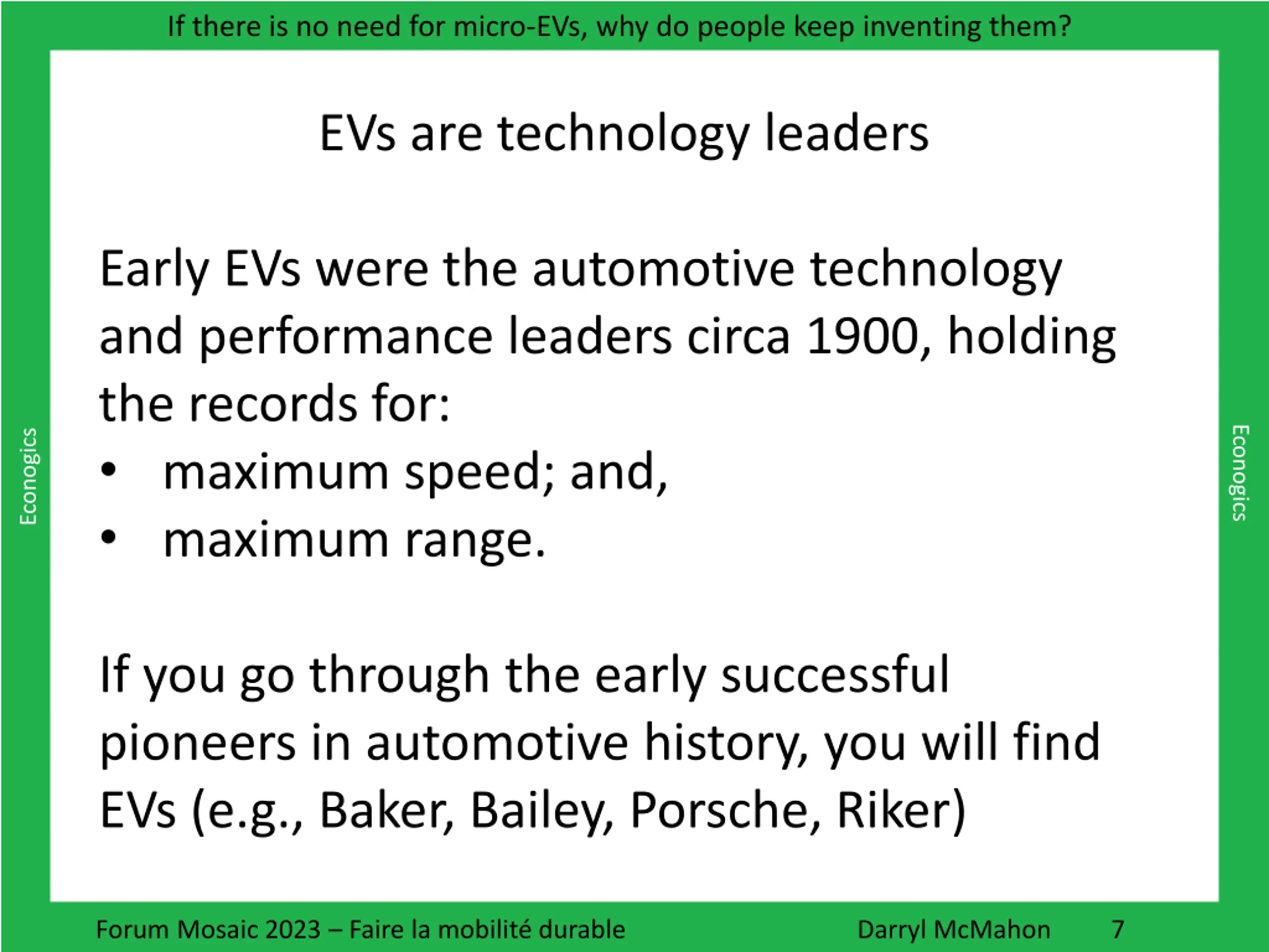 If there is no need for micro-EVs, why do people keep inventing them? EVs are technology leaders Early EVs were the automotive technology and performance leaders circa 1900, holding the records for: maximum speed; and, maximum range. Econogics Econogics If you go through the early successful pioneers in automotive history, you will find EVs (e.g., Baker, Bailey, Porsche, Riker) Forum Mosaic 2023 Faire la mobilit durable Darryl McMahon 7