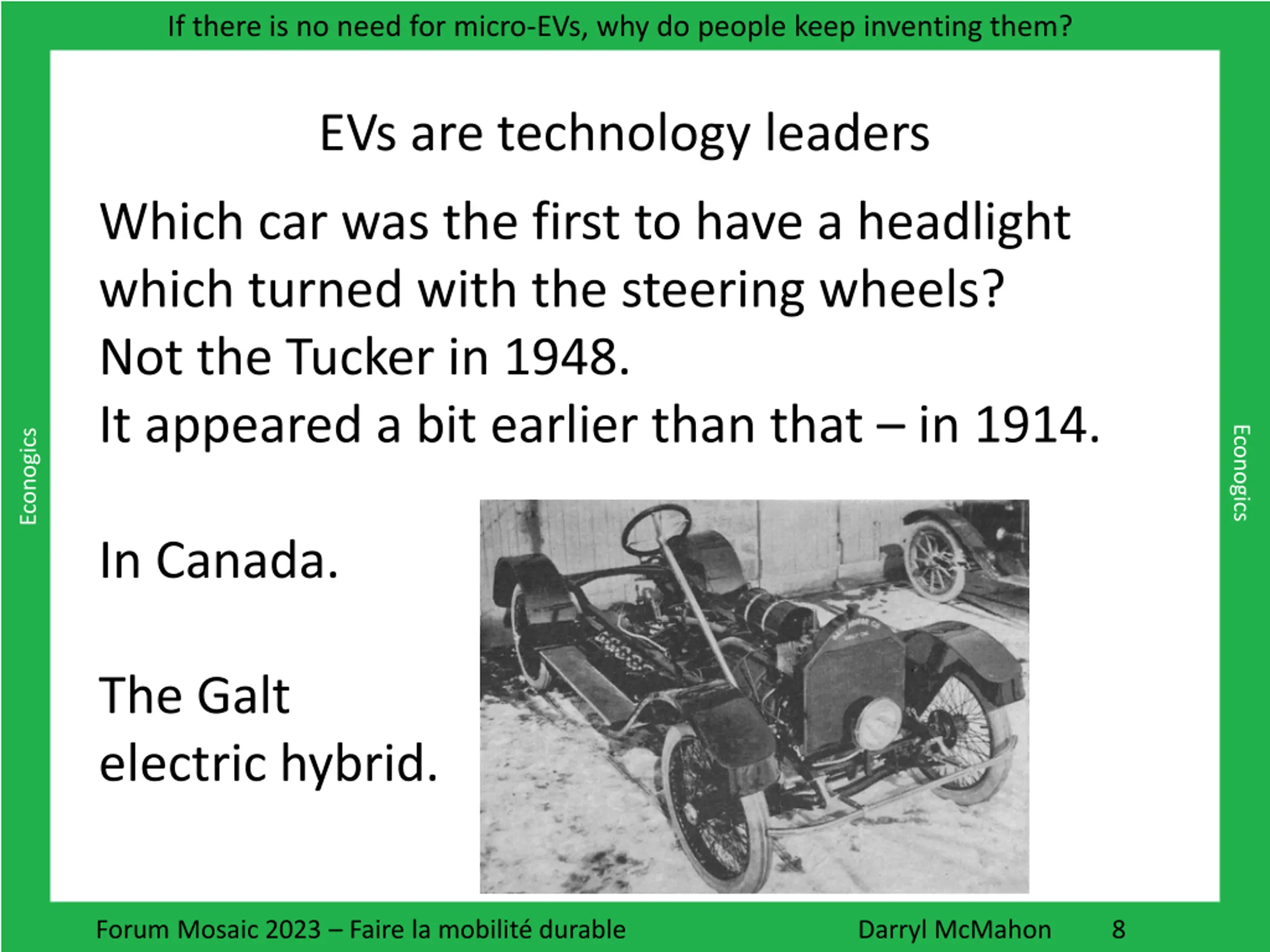 If there is no need for micro-EVs, why do people keep inventing them? EVs are technology leaders Which car was the first to have a headlight which turned with the steering wheels? Not the Tucker in 1948. It appeared a bit earlier than that in 1914. Econogics Econogics In Canada. The Galt electric hybrid. Forum Mosaic 2023 Faire la mobilit durable Darryl McMahon 8