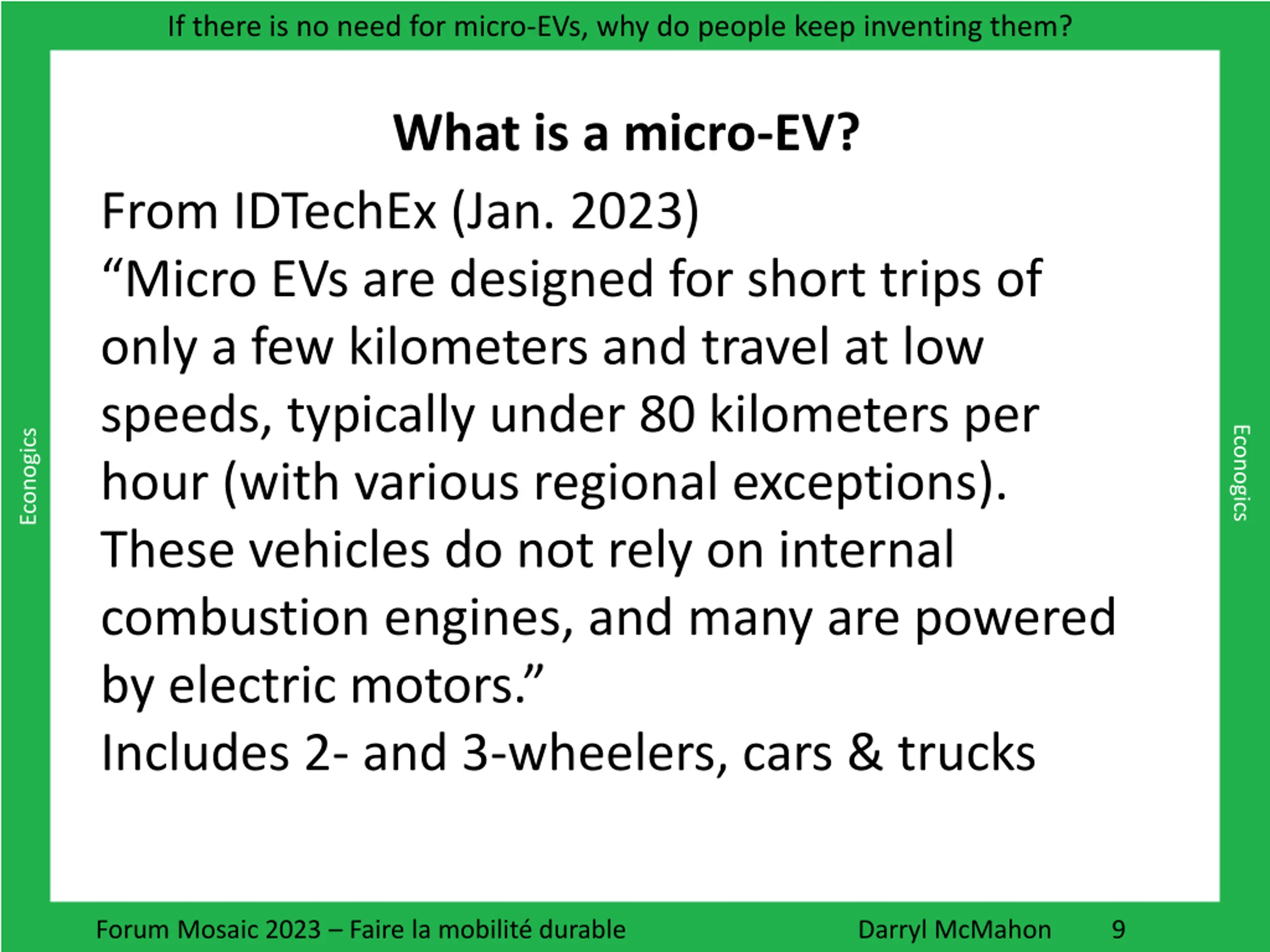 If there is no need for micro-EVs, why do people keep inventing them? What is a micro-EV? From IDTechEx (Jan. 2023) Micro EVs are designed for short trips of only a few kilometers and travel at low speeds, typically under 80 kilometers per hour (with various regional exceptions). These vehicles do not rely on internal combustion engines, and many are powered by electric motors. Includes 2- and 3-wheelers, cars & trucks Econogics Econogics Forum Mosaic 2023 Faire la mobilit durable Darryl McMahon 9