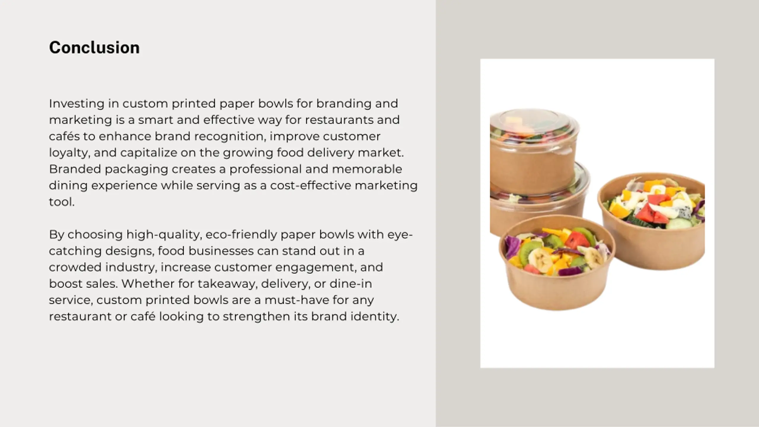 Conclusion Investing in custom printed paper bowls for branding and marketing is a smart and effective way for restaurants and caf s to enhance brand recognition, improve customer loyalty, and capitalize on the growing food delivery market. Branded packaging creates a professional and memorable dining experience while serving as a cost-effective marketing tool. By choosing high-quality, eco-friendly paper bowls with eye- catching designs, food businesses can stand out in a crowded industry, increase customer engagement, and boost sales. Whether for takeaway, delivery, or dine-in service, custom printed bowls are a must-have for any restaurant or caf looking to strengthen its brand identity.